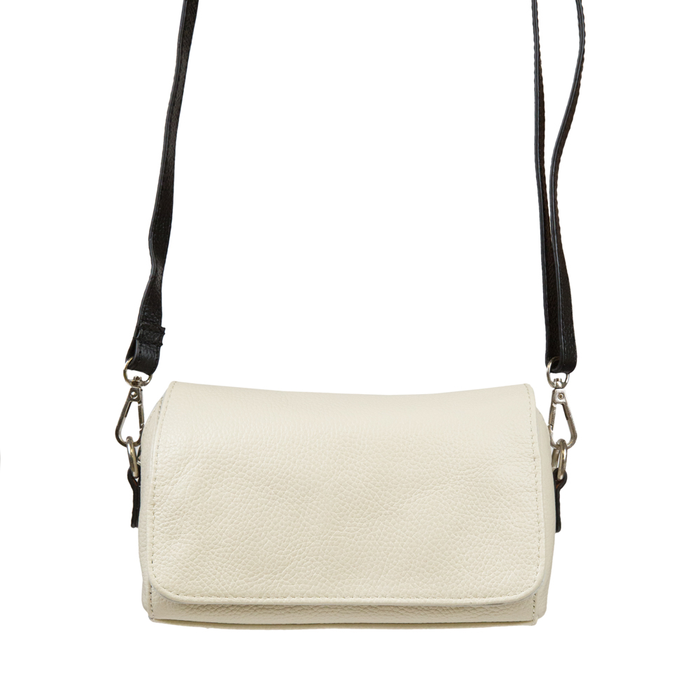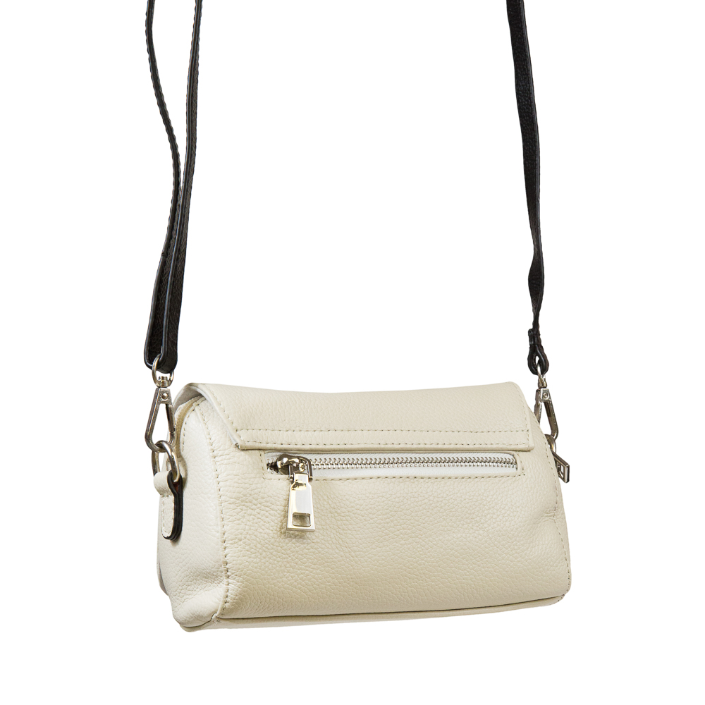 Миниатюрная сумка из натуральной зернистой кожи с контрастным ремешком. Основное отделение под клапаном на молнии. Внутри: два закрытых и один открытый карман. С обратной стороны сумки отделение на молнии.