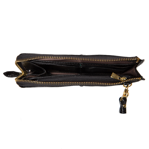 Тонкий кошелек из натуральной кожи. Основное отделение закрывается на молнию, внутри есть два отделения для купюр и одно на молнии для монеток. Так же есть 6 отделов для визитных карточек.