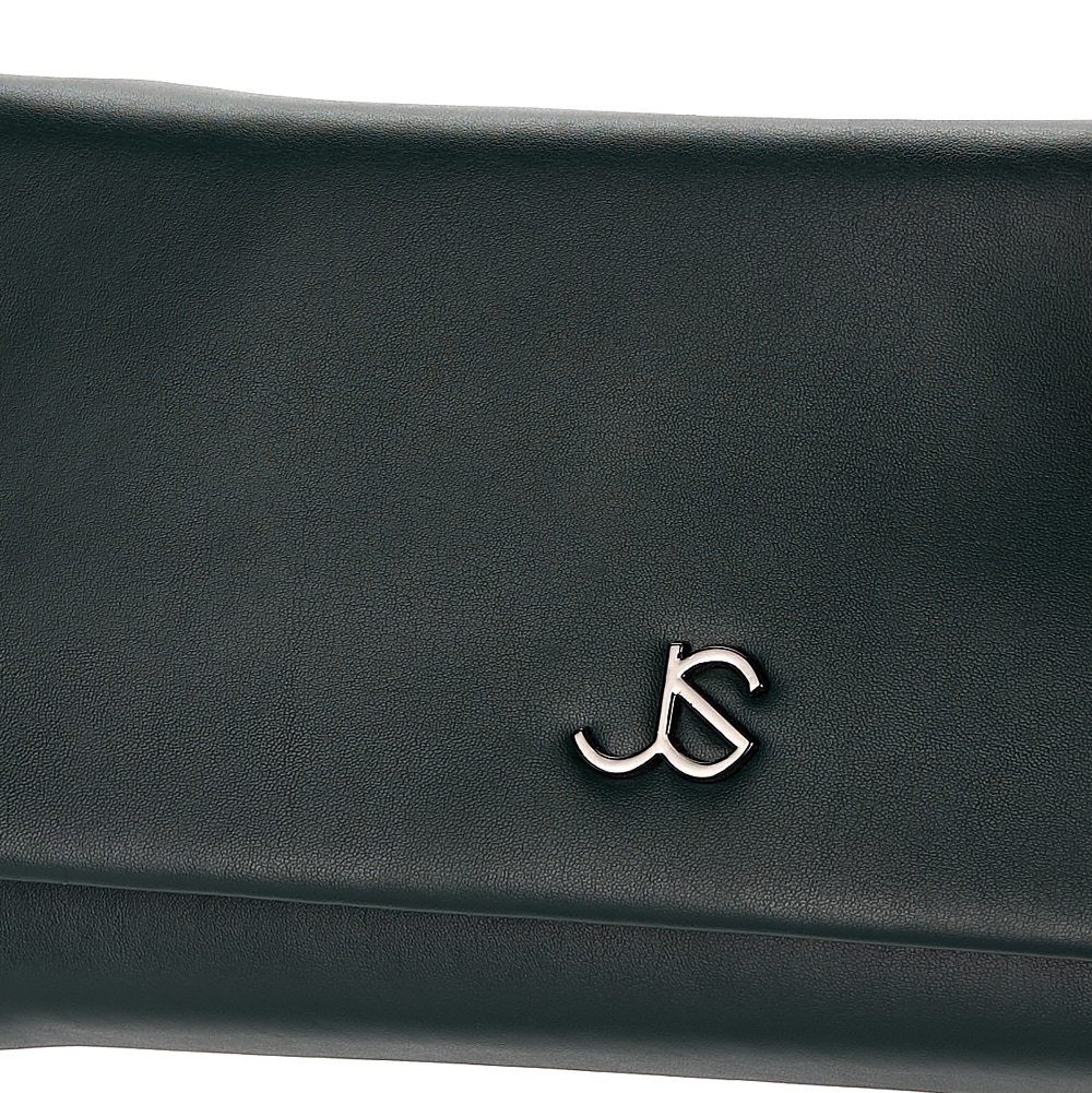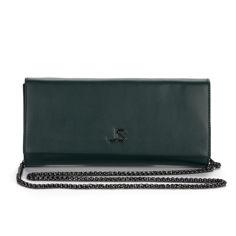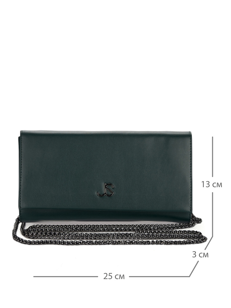 Стильный клатч из натуральной гладкой кожи, прекрасно сочетающейся с затемненной фурнитурой цвета никель. Под клапаном на кнопке-магните расположены два открытых отделения, одно на молнии во всю ширину и два открытых потайных. Выделены 12 секций для карт. Цепочка через плечо прилагается.