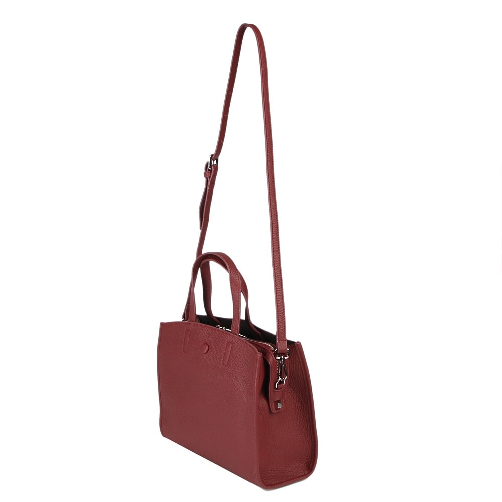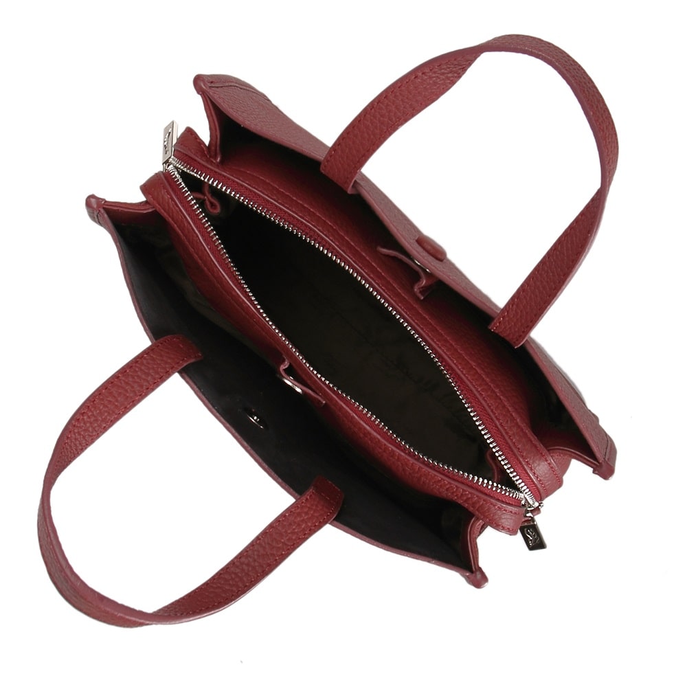 Интересная форма модели придает ей особый шарм. Изготовлена из зернистой натуральной кожи, прекрасно сочетающейся с фурнитурой серебристого цвета. Одно основное отделение на молнии, внутри которого выделены карманы: два открытых и один потайной. Длинный плечевой ремень прилагается.