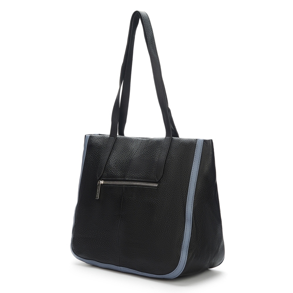 Большая удобная модель, изготовленная из натуральной зернистой кожи, отлично сочетающейся с фурнитурой серебристого цвета. Одно основное отделение на молнии, внутри которого расположены карманы: два открытых, один потайной и один-перегородка. На обратной стороне выделен карман на молнии.