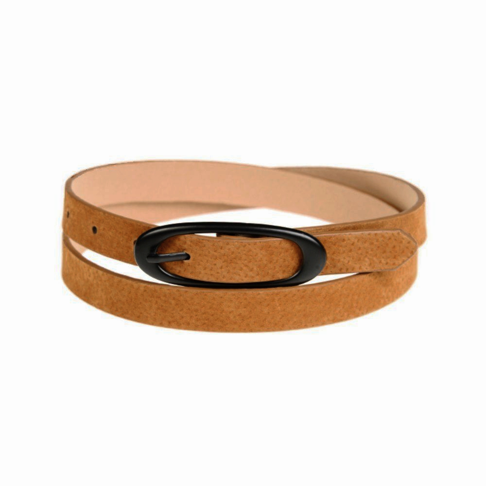 Женский ремень из натуральной кожи с текстурой замши от бельгийского бренда Jane's Story. Ремень с металлической пряжкой станет оригинальным акцентом вашего образа. Размер ремня (с пряжкой) - 106*2 см.