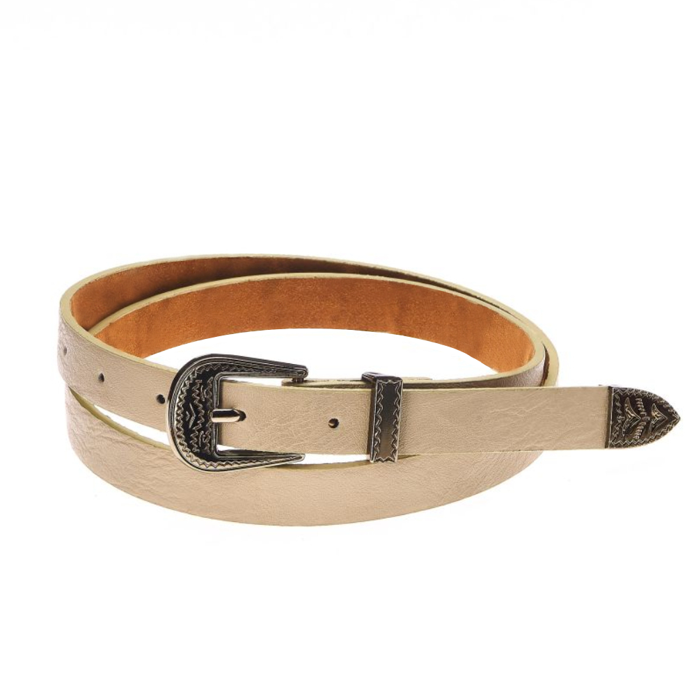 Женский ремень из экокожи от бельгийского бренда Jane's Story. Ремень с металлической пряжкой станет оригинальным акцентом вашего образа. Размер ремня (с пряжкой) - 102*2 см.