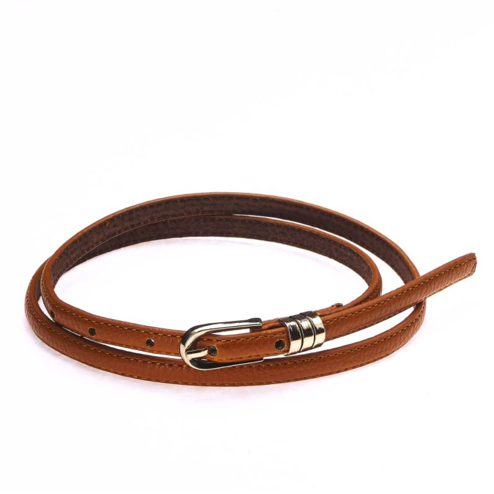 Женский ремень из экокожи от бельгийского бренда Jane's Story. Ремень с металлической пряжкой станет оригинальным акцентом вашего образа. Размер ремня (с пряжкой) - 100*1 см.