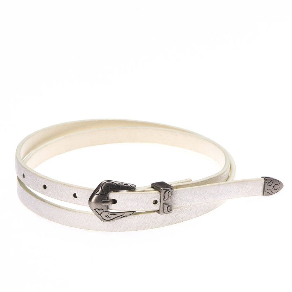 Женский ремень из экокожи от бельгийского бренда Jane's Story. Ремень с металлической пряжкой станет оригинальным акцентом вашего образа. Размер ремня (с пряжкой) - 101*1 см.