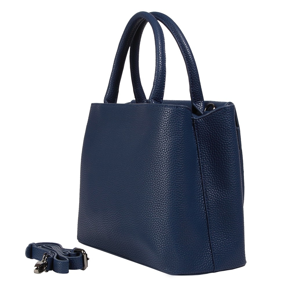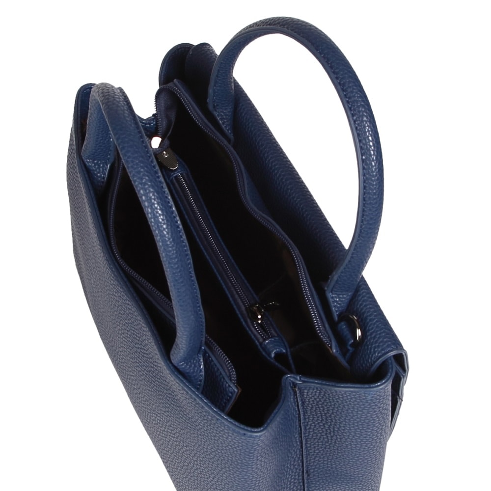 Интересная форма модели придает ей особый шарм. Изготовлена из зернистой эко кожи, что делает ее близко схожей с натуральной, прекрасно сочетающейся с затемненной фурнитурой цвета никель. Одно основное отделение на молнии, внутри которого выделены карманы: перегородка, два открытых и один потайной. На лицевой стороне расположено дополнительное отделение. Длинный плечевой ремень прилагается.