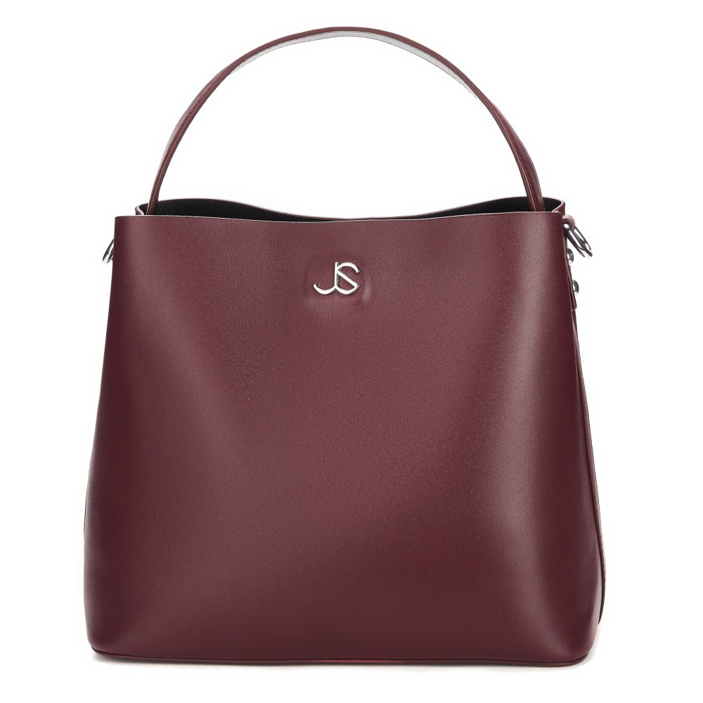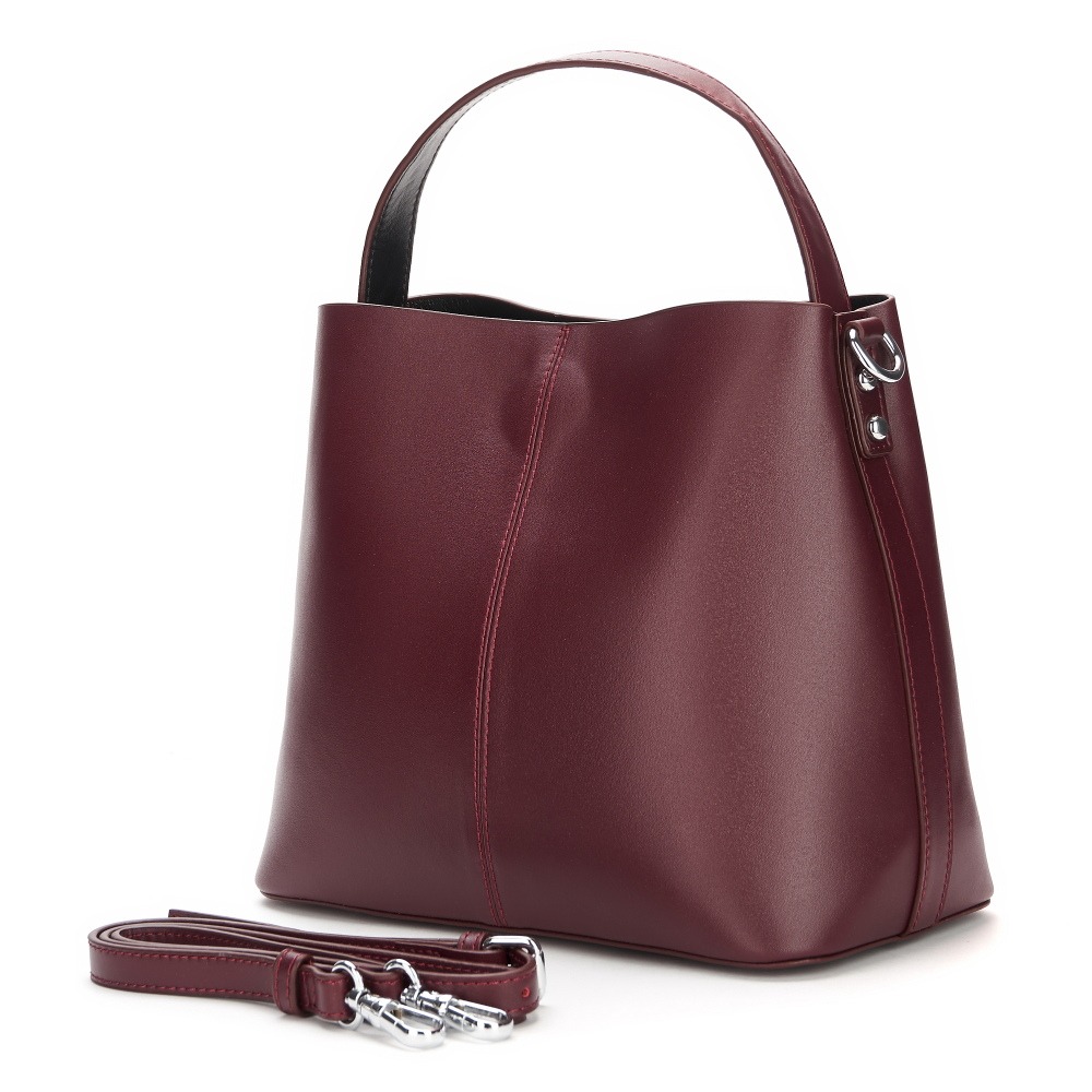 Формованная модель из натуральной гладкой кожи, прекрасно сочетающейся с фурнитурой серебристого цвета. Три основных отделения: среднее - на молнии (внутри которого выделены карманы: открытый и потайной ), два других отделения - на кнопках-магнитах. Длинный плечевой ремень прилагается.