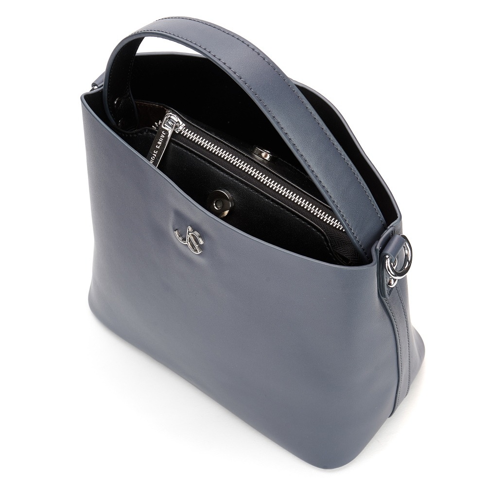 Формованная модель из натуральной гладкой кожи, прекрасно сочетающейся с фурнитурой серебристого цвета. Три основных отделения: среднее - на молнии (внутри которого выделены карманы: открытый и потайной ), два других отделения - на кнопках-магнитах. Длинный плечевой ремень прилагается.