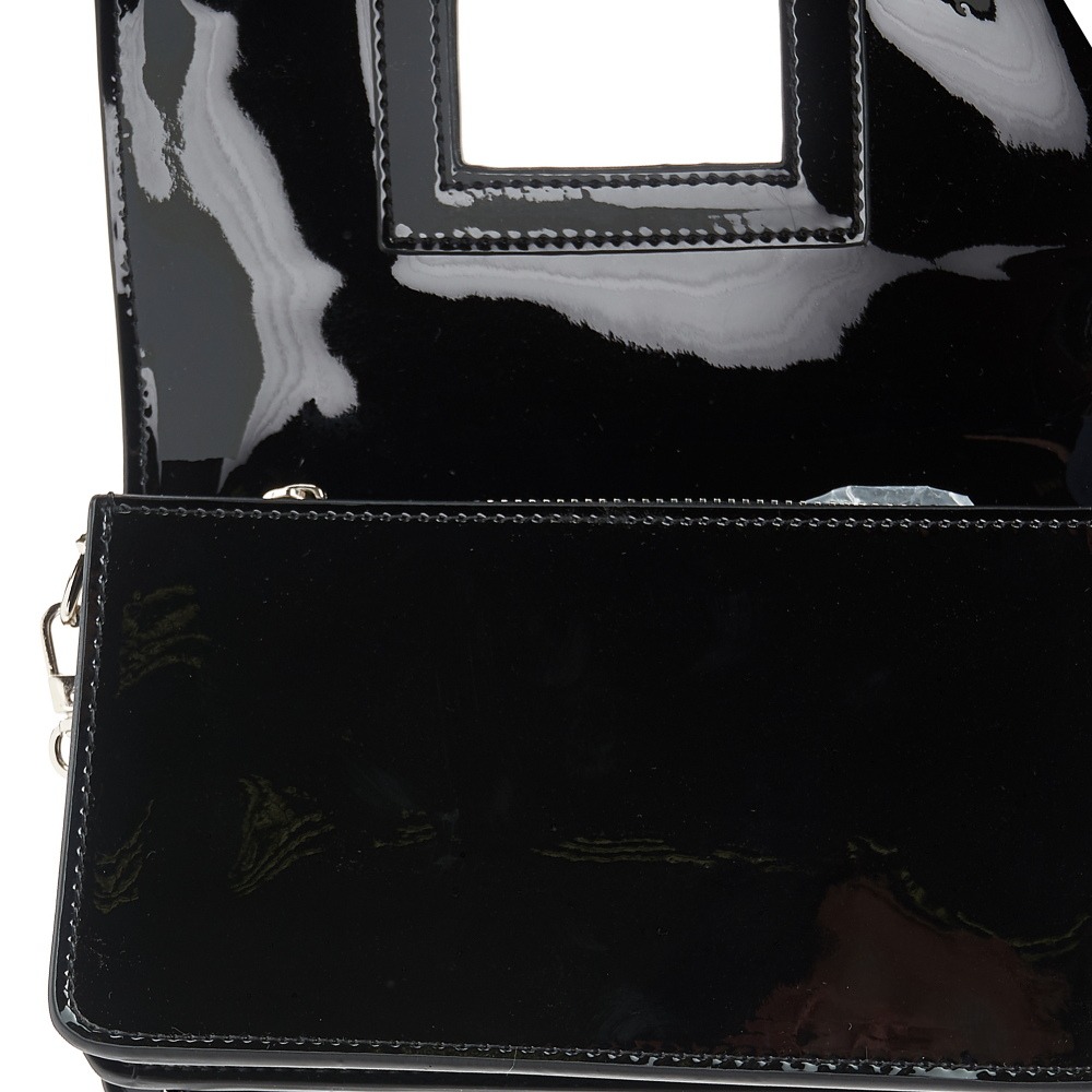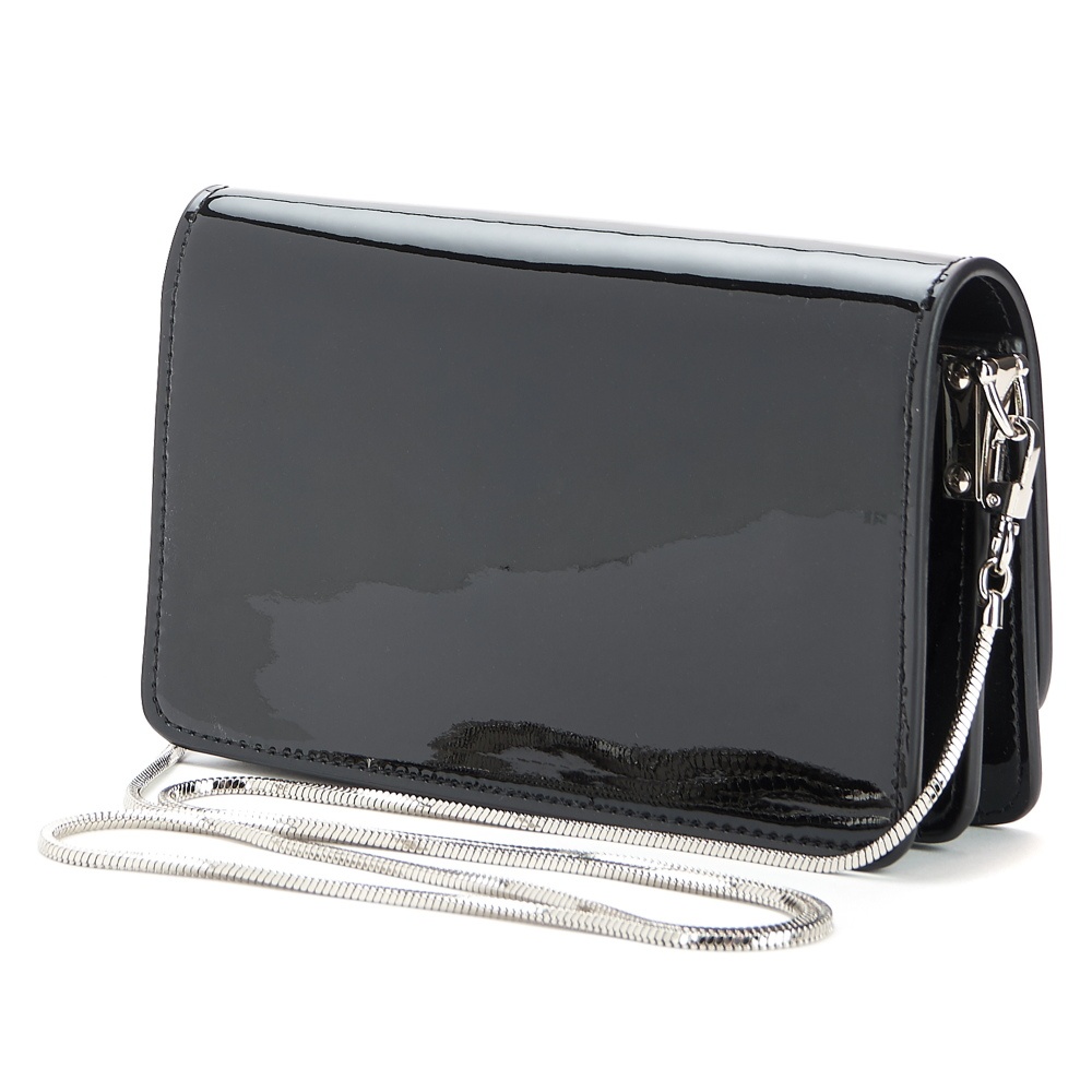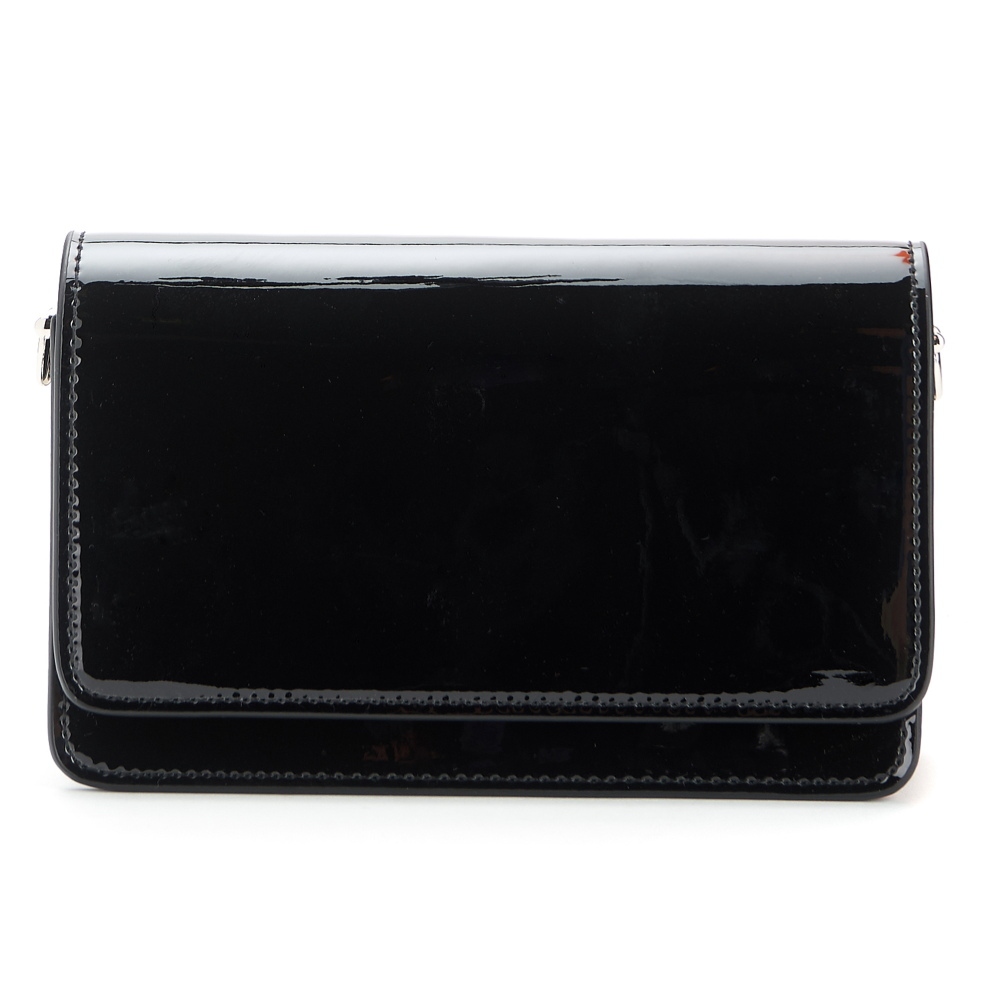 Очень эффектная модель, изготовлена натуральной лакированной кожи, отлично сочетающейся с фурнитурой серебристого цвета. Под клапаном на магните, находится основное отделение ( с одним карманом-перегородкой ) и вставкой с зеркалом. В комплекте плечевая металлическая цепочка на элегантных карабинах.