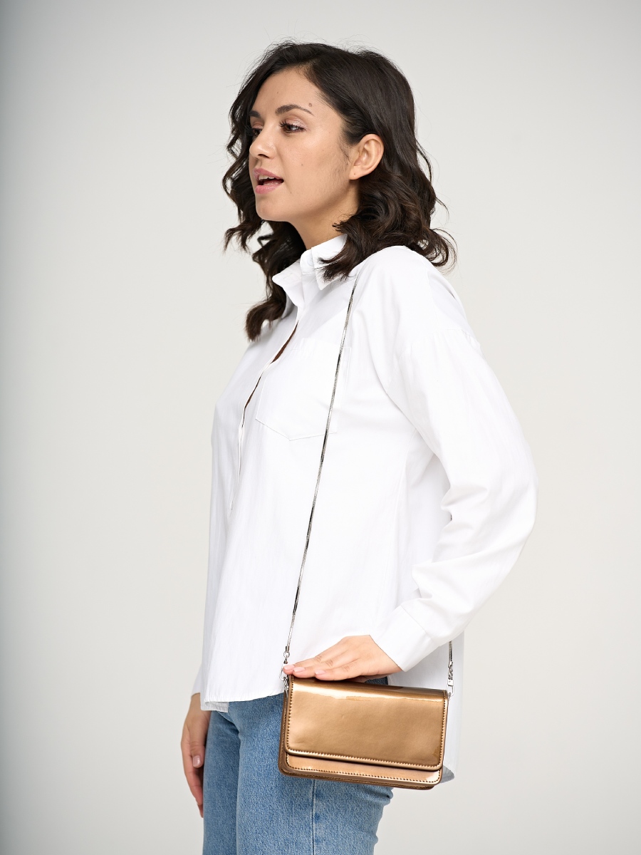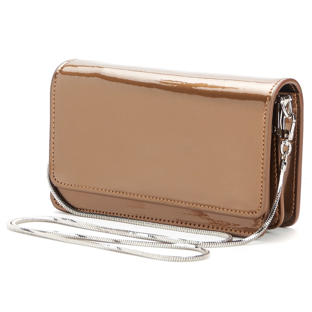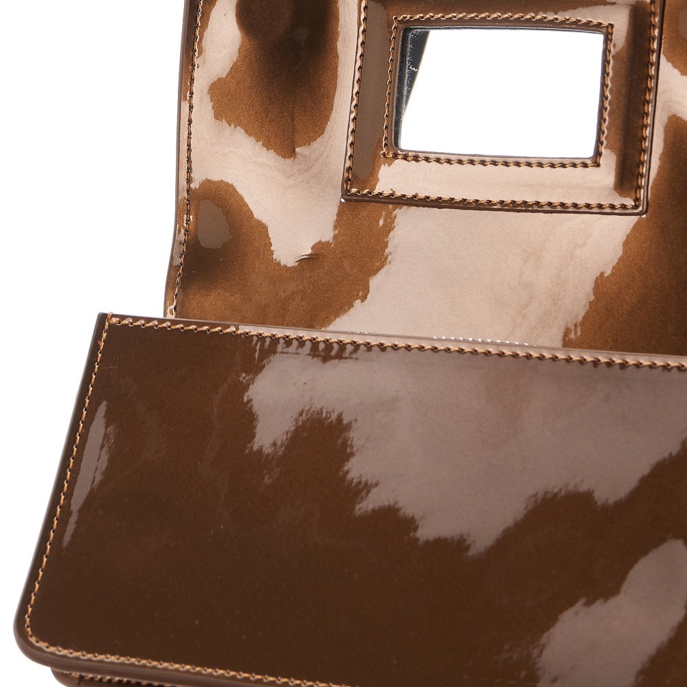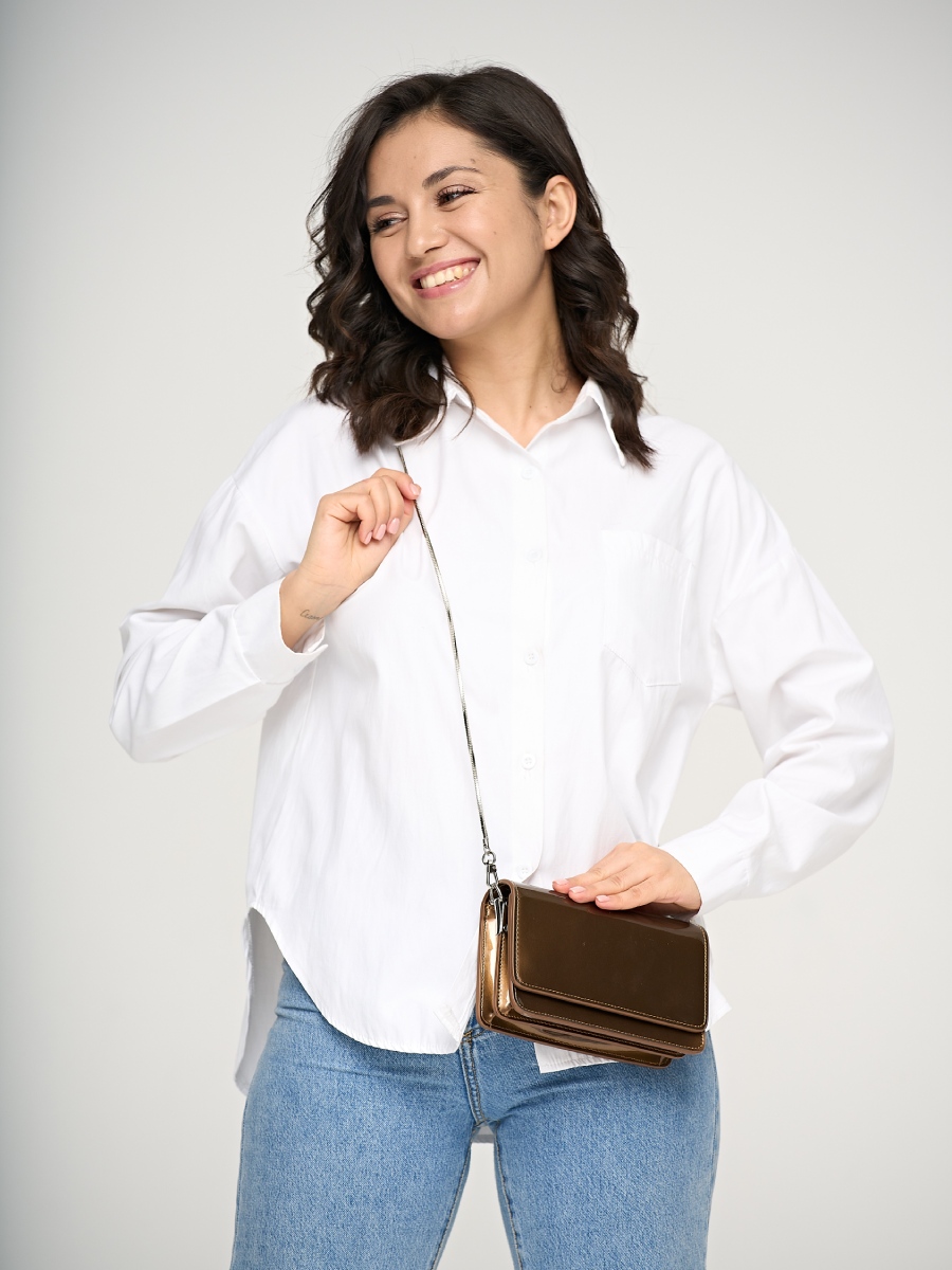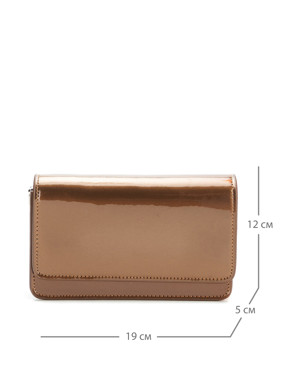 Очень эффектная модель, изготовлена натуральной лакированной кожи, отлично сочетающейся с фурнитурой серебристого цвета. Под клапаном на магните, находится основное отделение ( с одним карманом-перегородкой ) и вставкой с зеркалом. В комплекте плечевая металлическая цепочка на элегантных карабинах.