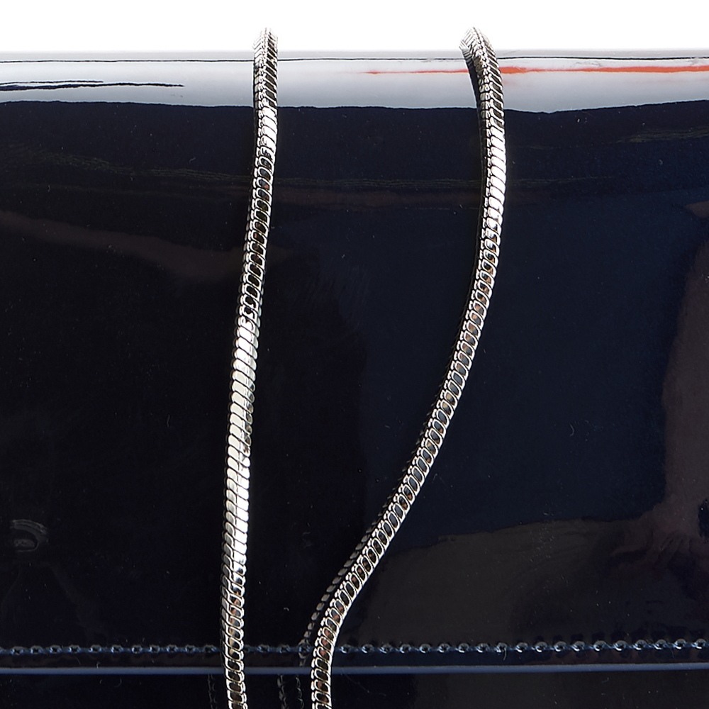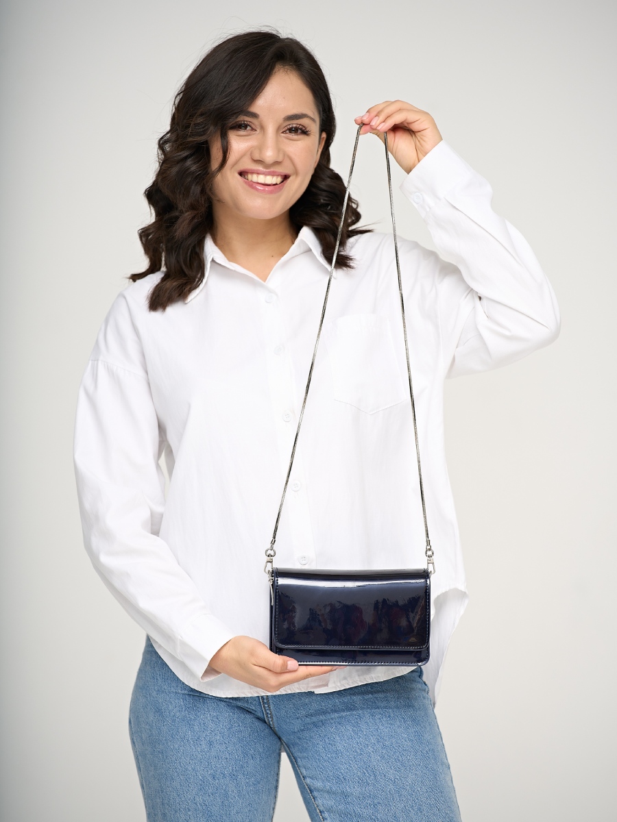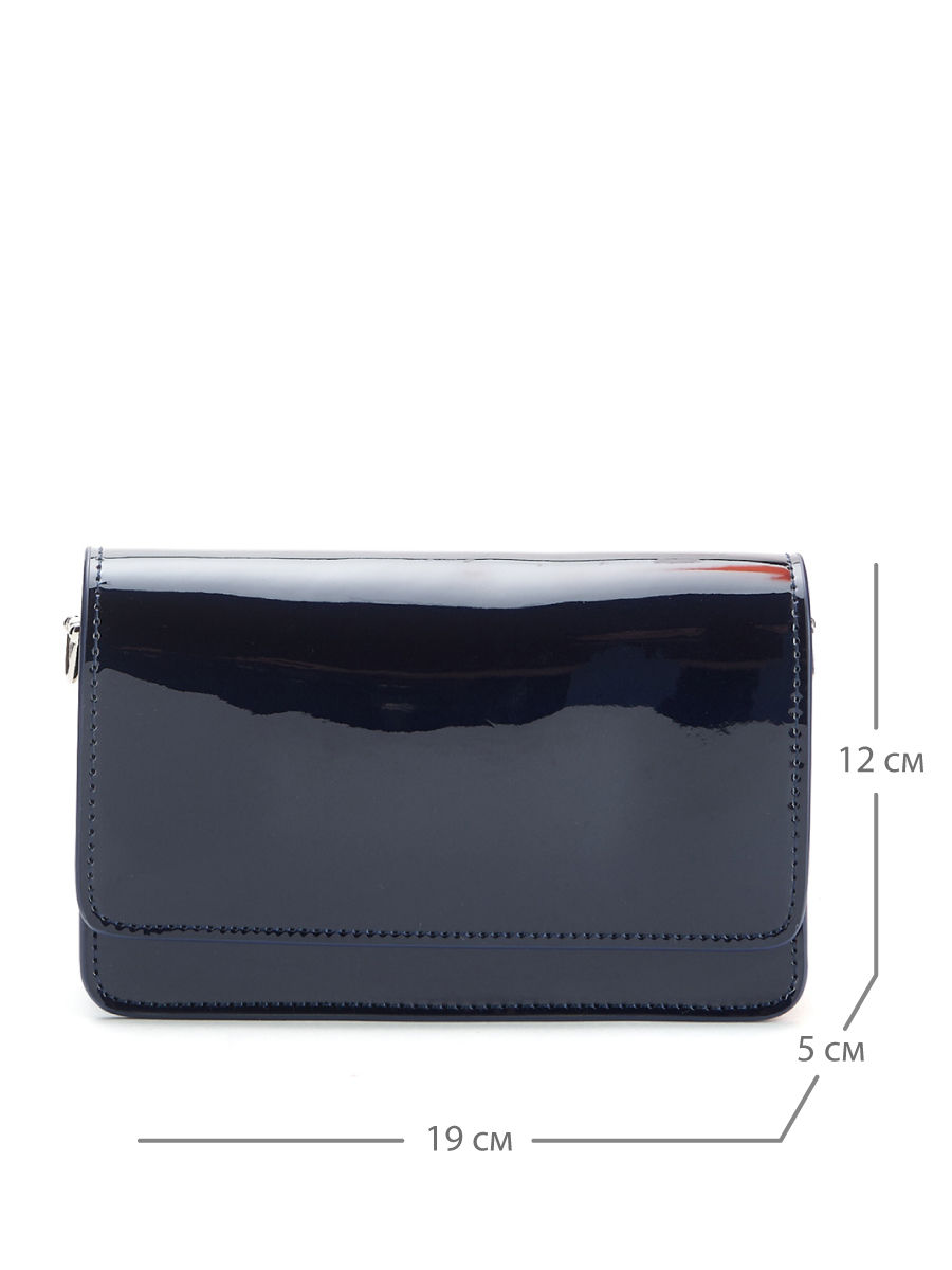Очень эффектная модель, изготовлена натуральной лакированной кожи, отлично сочетающейся с фурнитурой серебристого цвета. Под клапаном на магните, находится основное отделение ( с одним карманом-перегородкой ) и вставкой с зеркалом. В комплекте плечевая металлическая цепочка на элегантных карабинах.