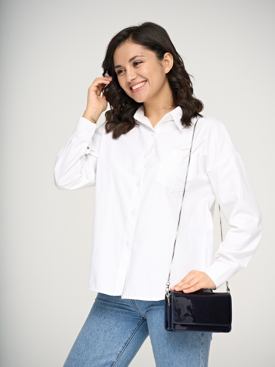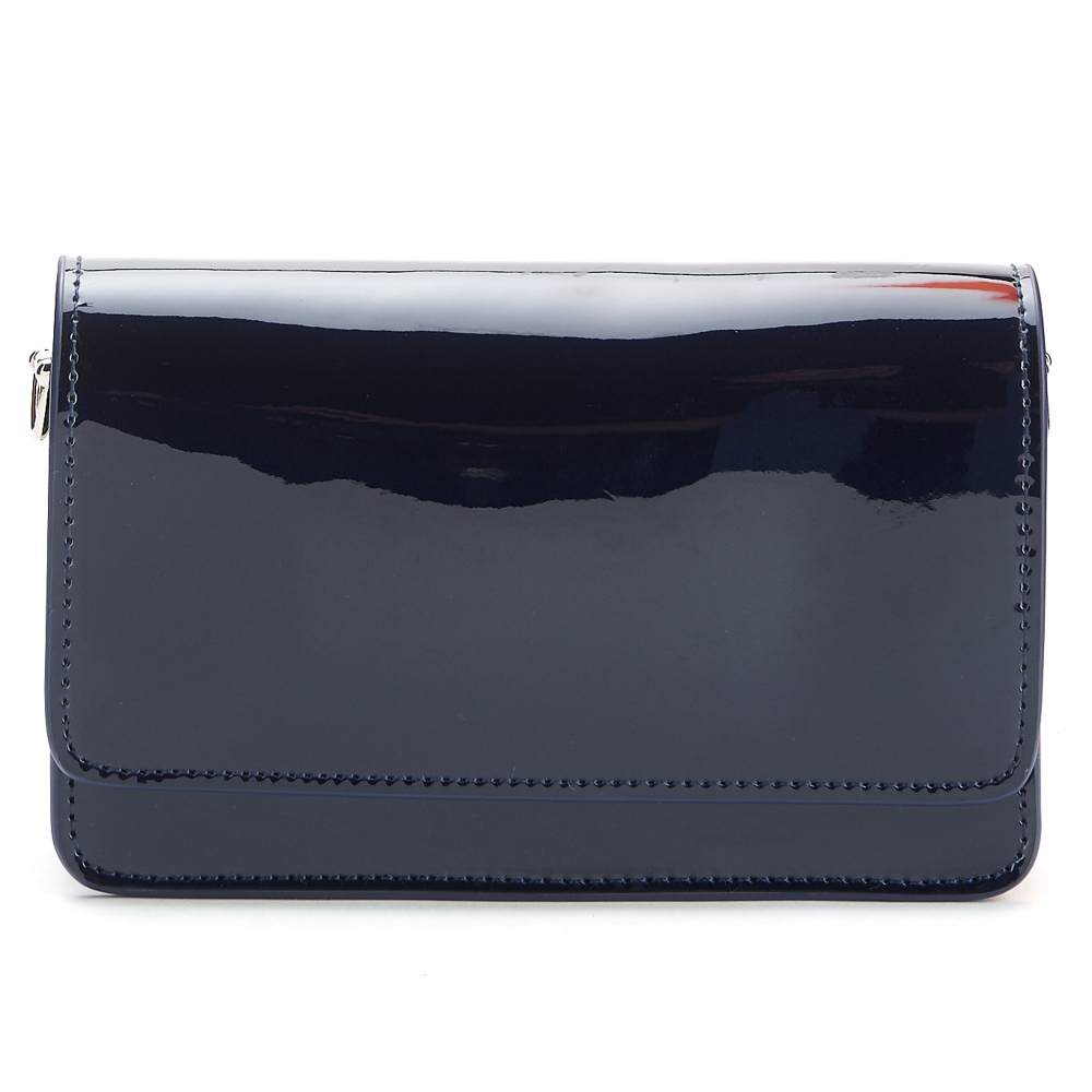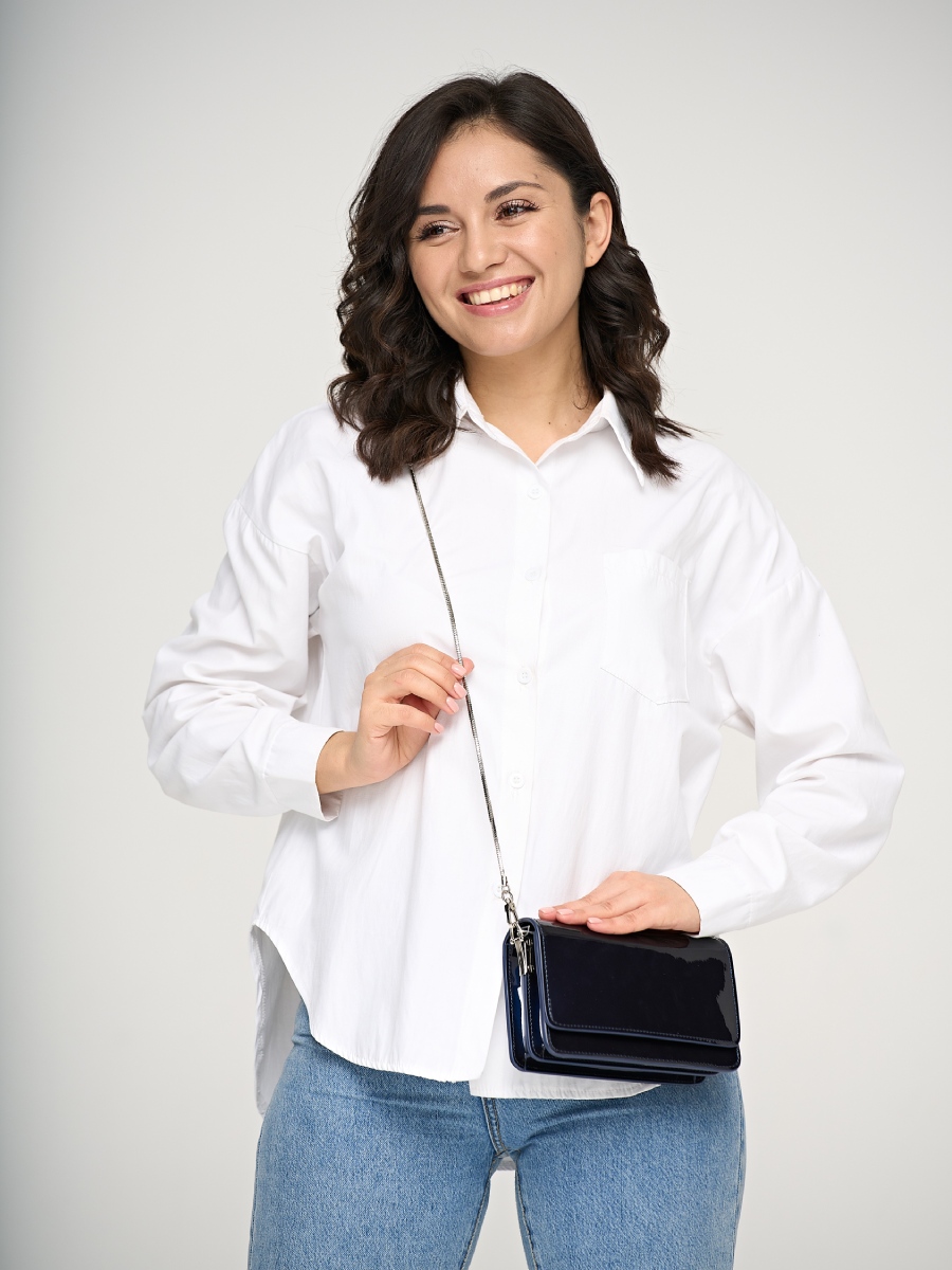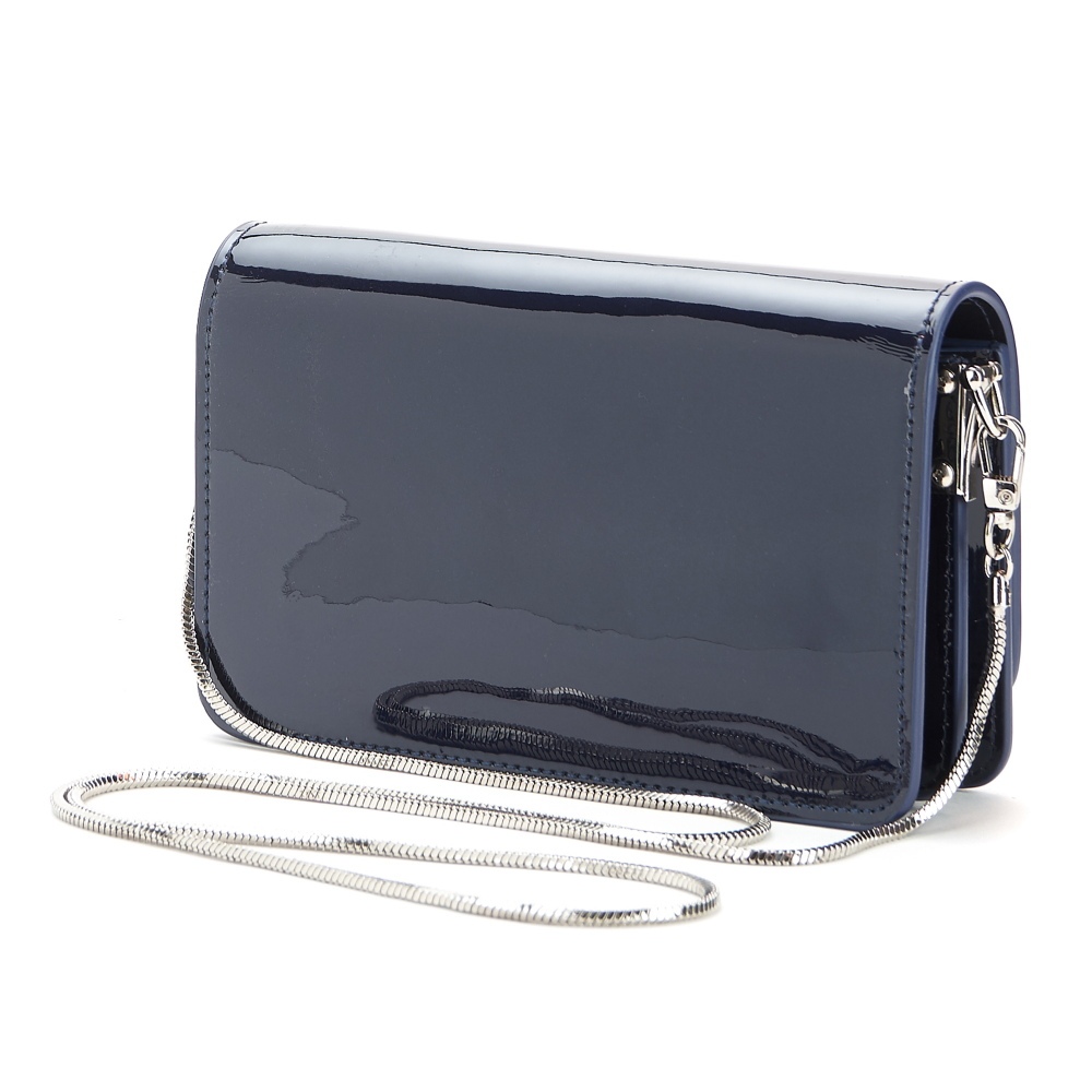 Очень эффектная модель, изготовлена натуральной лакированной кожи, отлично сочетающейся с фурнитурой серебристого цвета. Под клапаном на магните, находится основное отделение ( с одним карманом-перегородкой ) и вставкой с зеркалом. В комплекте плечевая металлическая цепочка на элегантных карабинах.