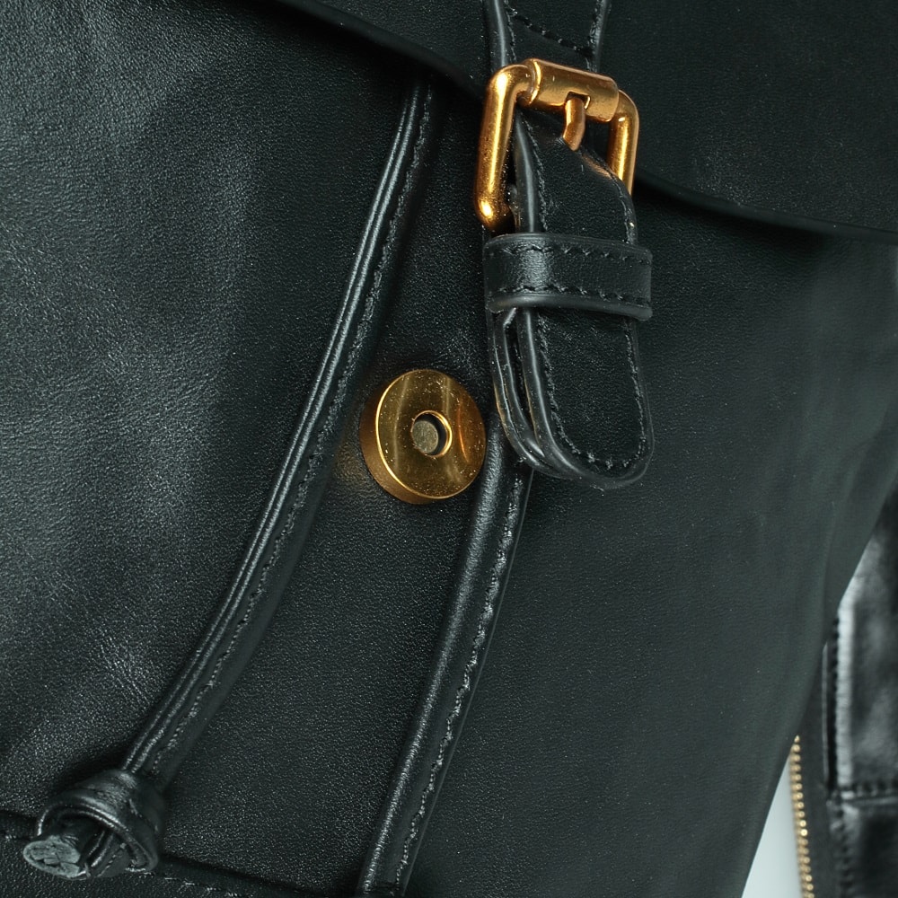 Стильный рюкзак, выполненный из натуральной гладкой кожи, прекрасно сочетающейся с фурнитурой золотистого цвета. Основное отделение под клапаном на магните - утягивается кожаным шнуром. Внутри расположены карманы: два открытых и один потайной. На обратной стороне - дополнительное отделение. Лямки рюкзака регулируются по длине.