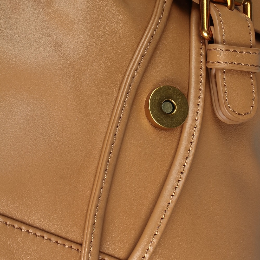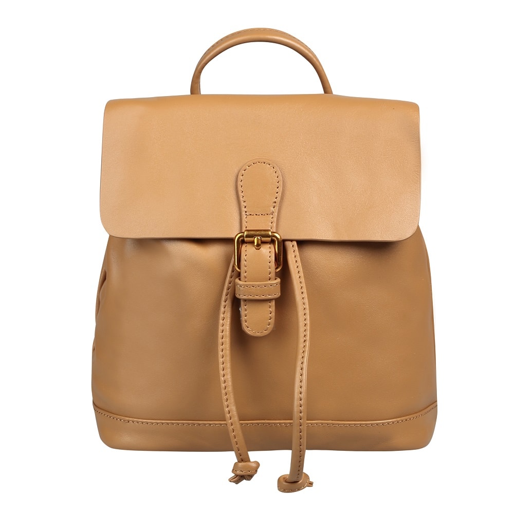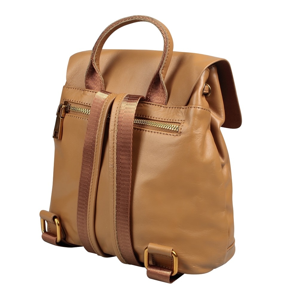 Стильный рюкзак, выполненный из натуральной гладкой кожи, прекрасно сочетающейся с фурнитурой золотистого цвета. Основное отделение под клапаном на магните - утягивается кожаным шнуром. Внутри расположены карманы: два открытых и один потайной. На обратной стороне - дополнительное отделение. Лямки рюкзака регулируются по длине.