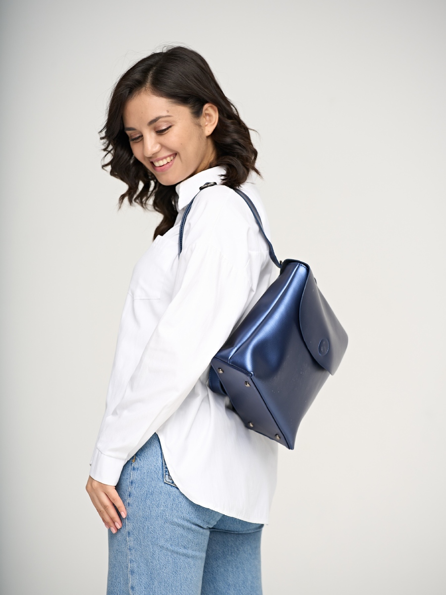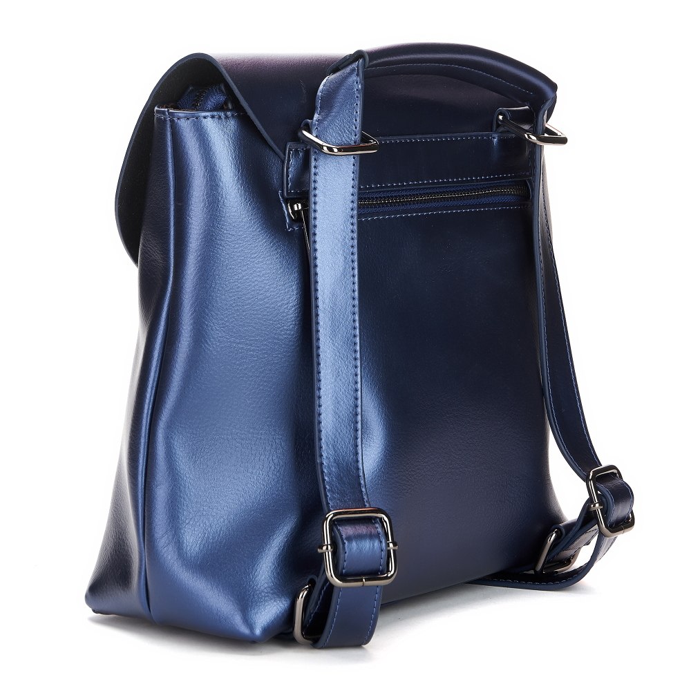 Средний по размеру рюкзак-трансформер выполнен из натуральной гладкой кожи, прекрасно сочетающейся с фурнитурой серебристого цвета. Основное отделение под клапаном на магните - на молнии. Внутри карман-перегородка, один открытый и один потайной. На обратной стороне - отделение на молнии. Лямки рюкзака регулируются по длине.
