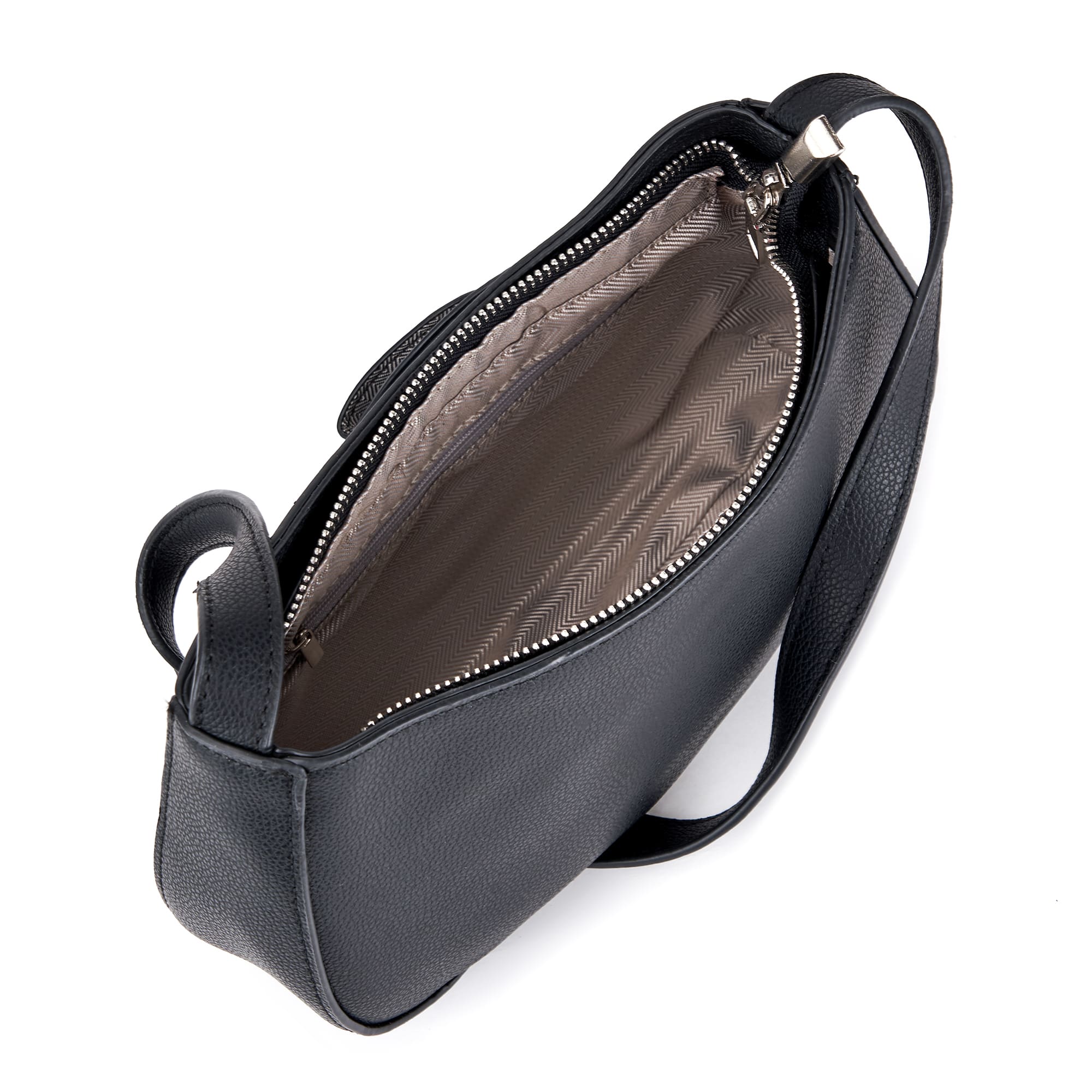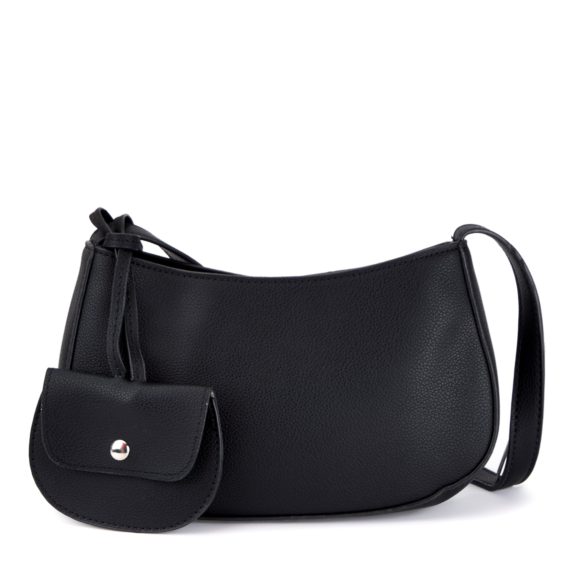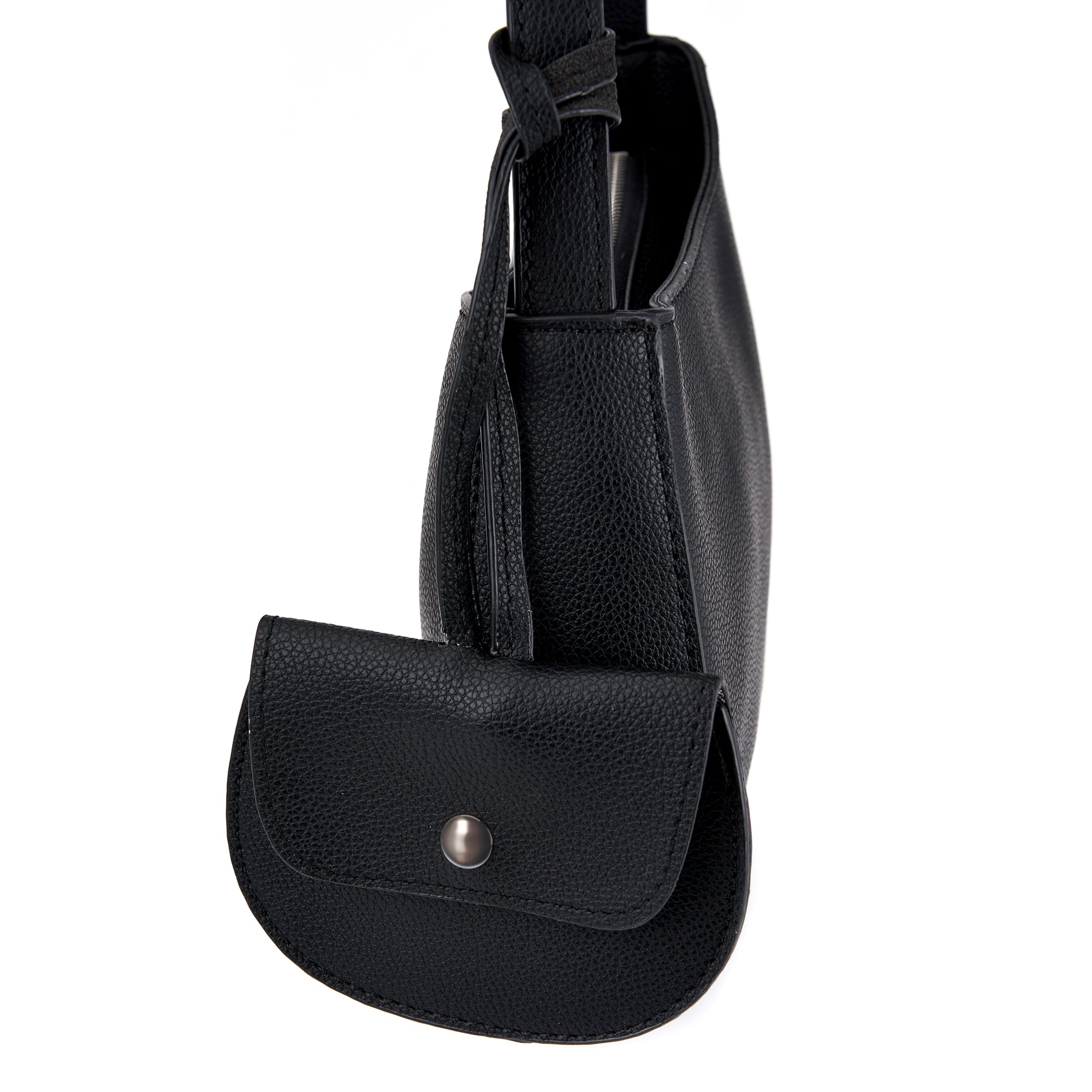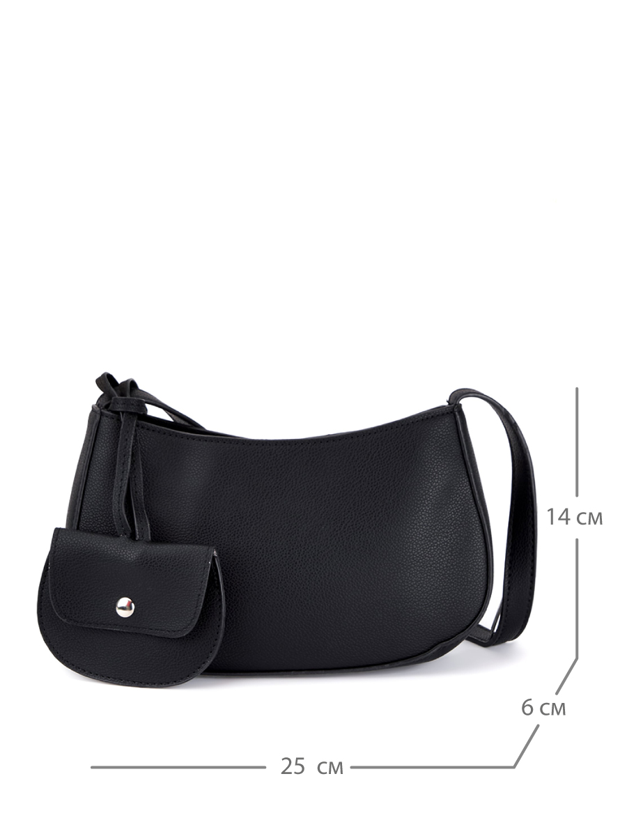 Женская формованная сумка из искусственной кожи с зернистой фактурой. Основное отделение на текстильном подкладе и один внутренний карман закрываются на молнию. Длина несъемного плечевого ремня составляет 65 см. В комплекте есть миниатюрный кошелек на магните, который можно зафиксировать карабином на ремне или носить отдельно. Сумка поставляется в текстильной и полиэтиленовой упаковке.