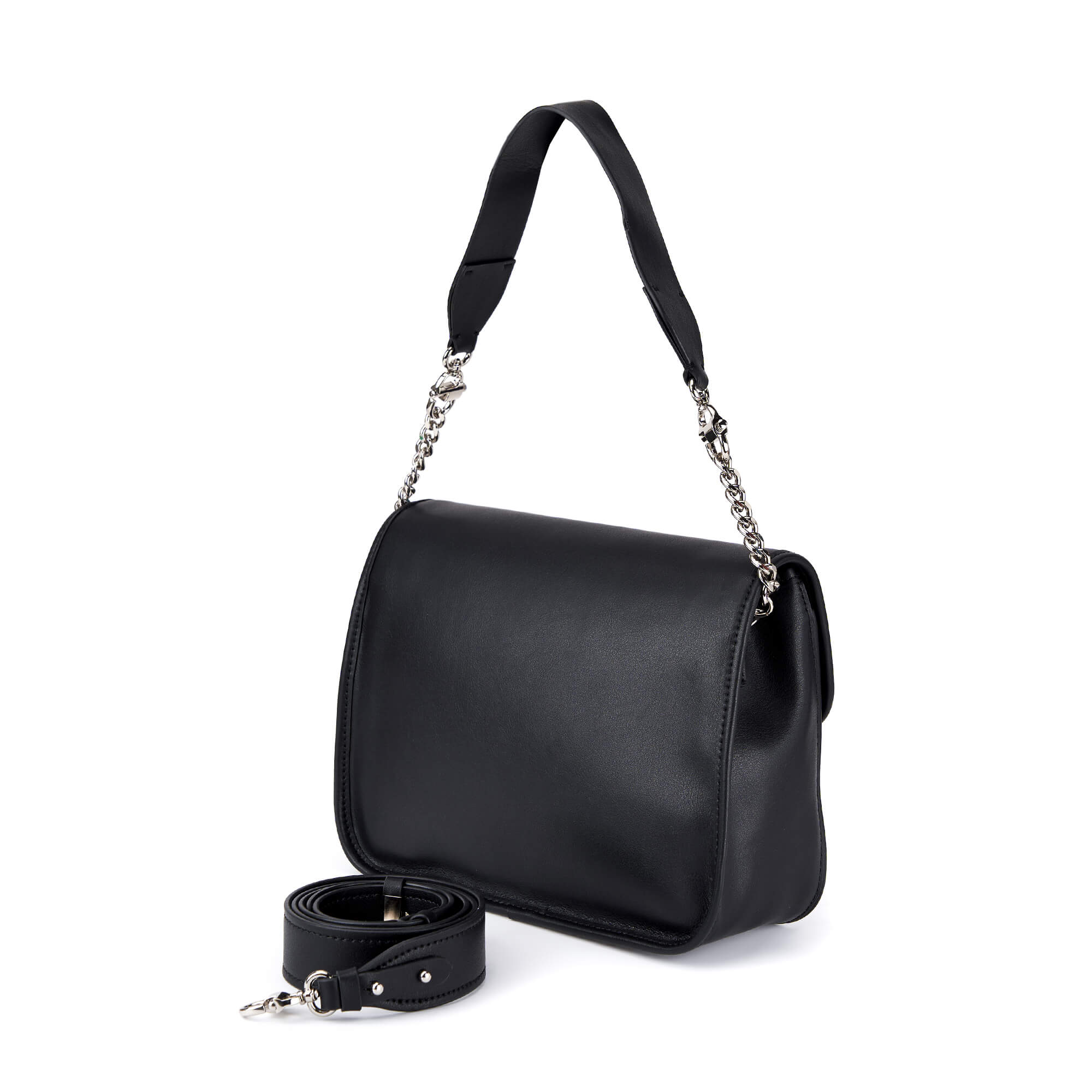Женская сумка из натуральной кожи. Под клапаном, закрывающимся на магнит, одно отделение на подкладе с фирменным паттерном, один открытый карман и карман на молнии. В комплекте два широких плечевых ремня: короткий и длинный, регулируемый до 110 см. Полукольца для крепления ремней декорированы серебристой цепью. Сумка поставляется в текстильной и полиэтиленовой упаковке.