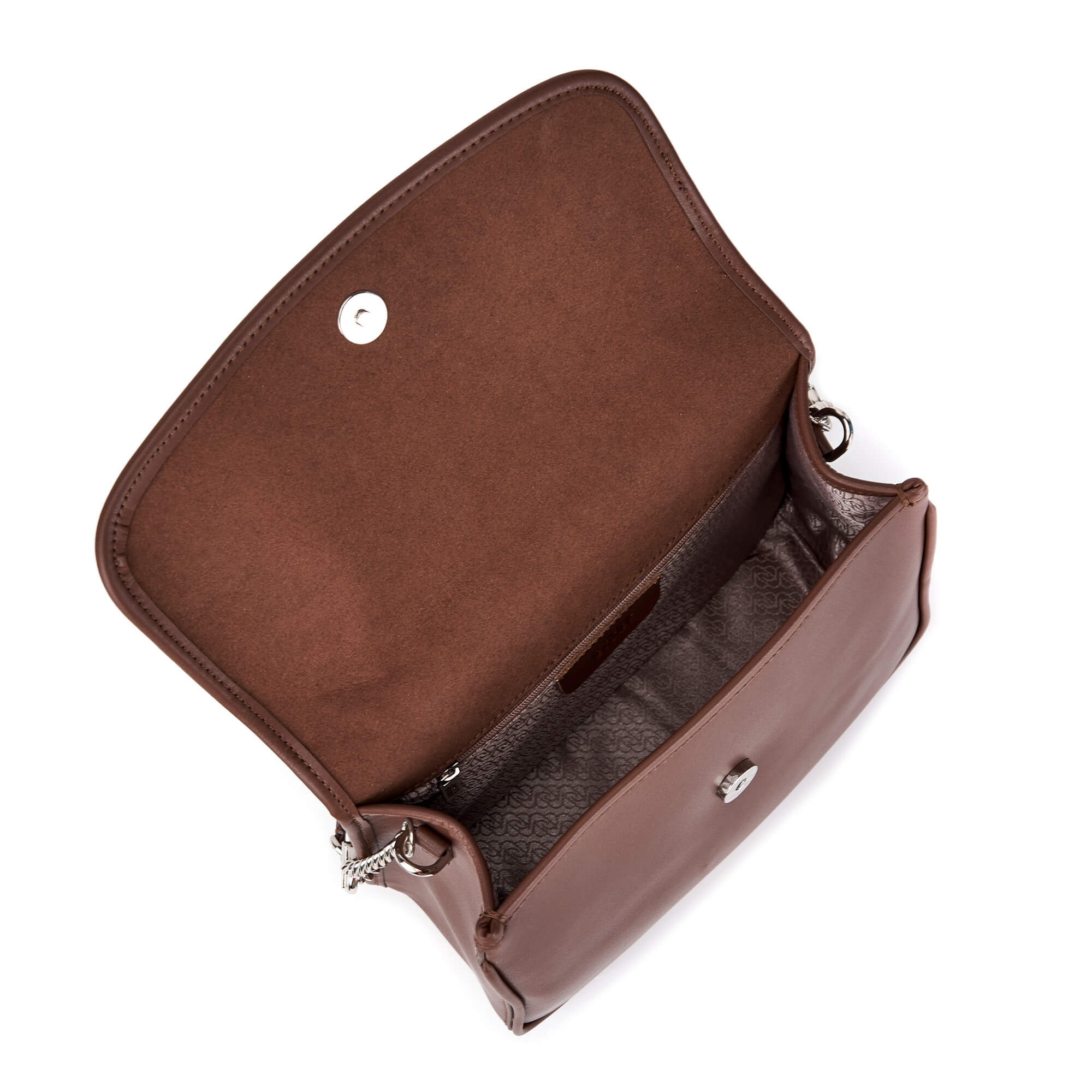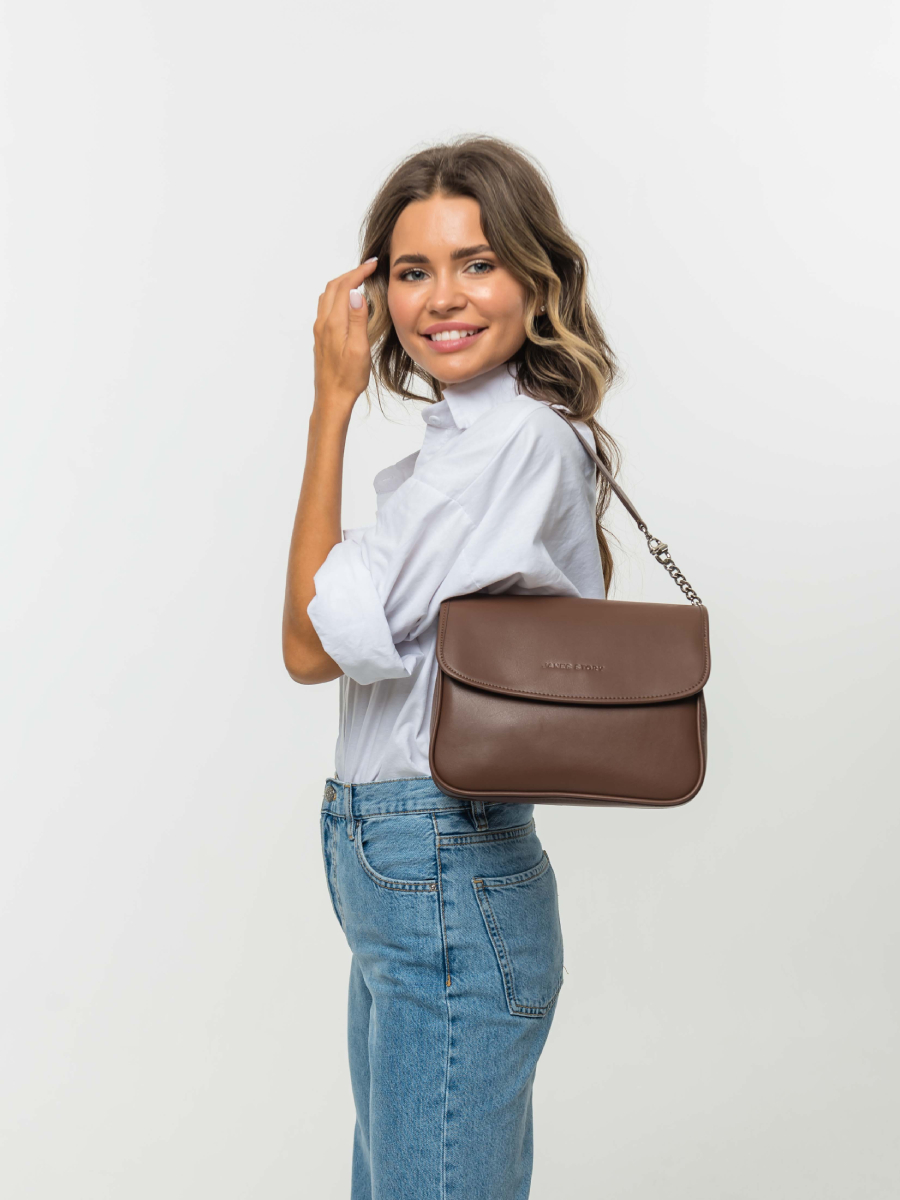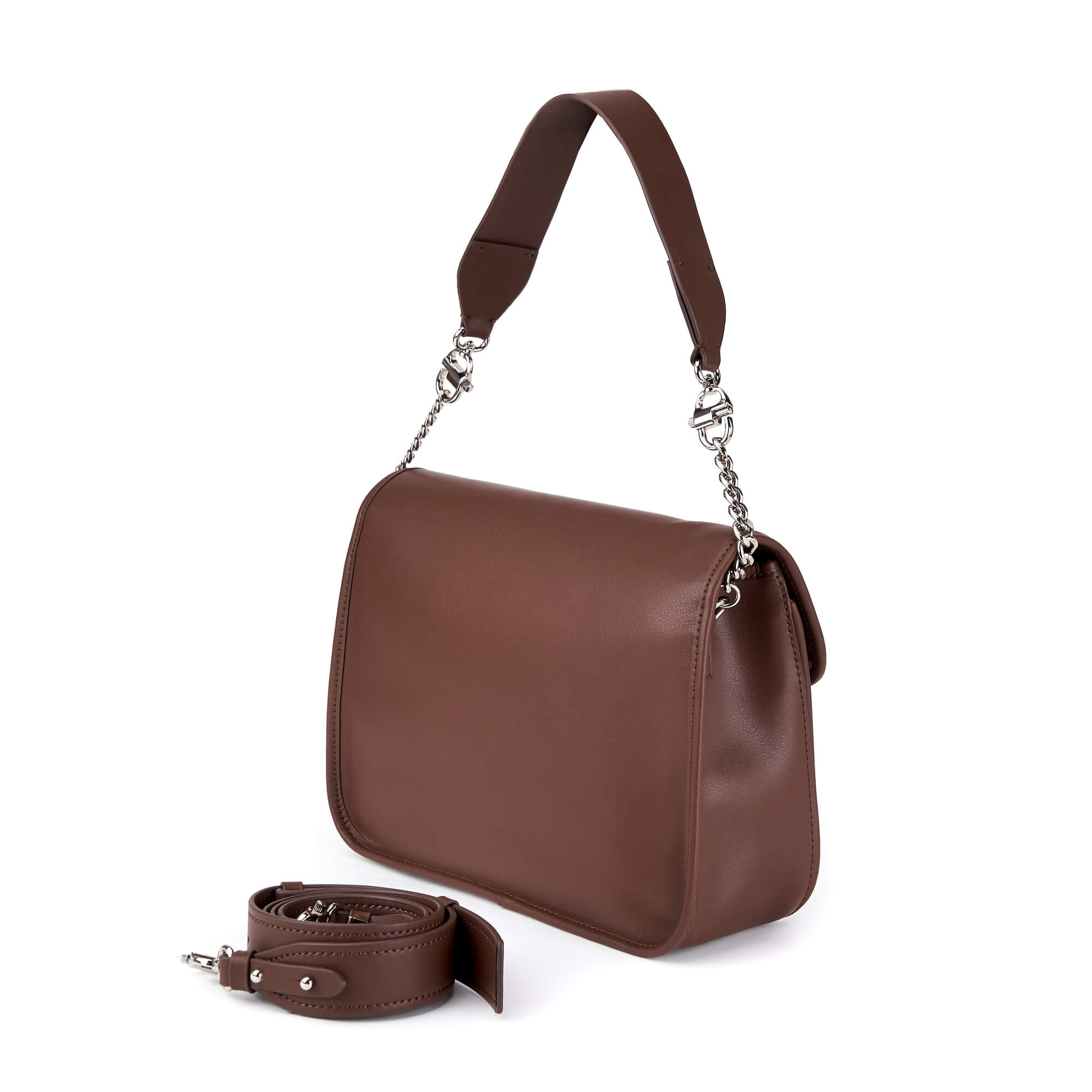 Женская сумка из натуральной кожи. Под клапаном, закрывающимся на магнит, одно отделение на подкладе с фирменным паттерном, один открытый карман и карман на молнии. В комплекте два широких плечевых ремня: короткий и длинный, регулируемый до 110 см. Полукольца для крепления ремней декорированы серебристой цепью. Сумка поставляется в текстильной и полиэтиленовой упаковке.
