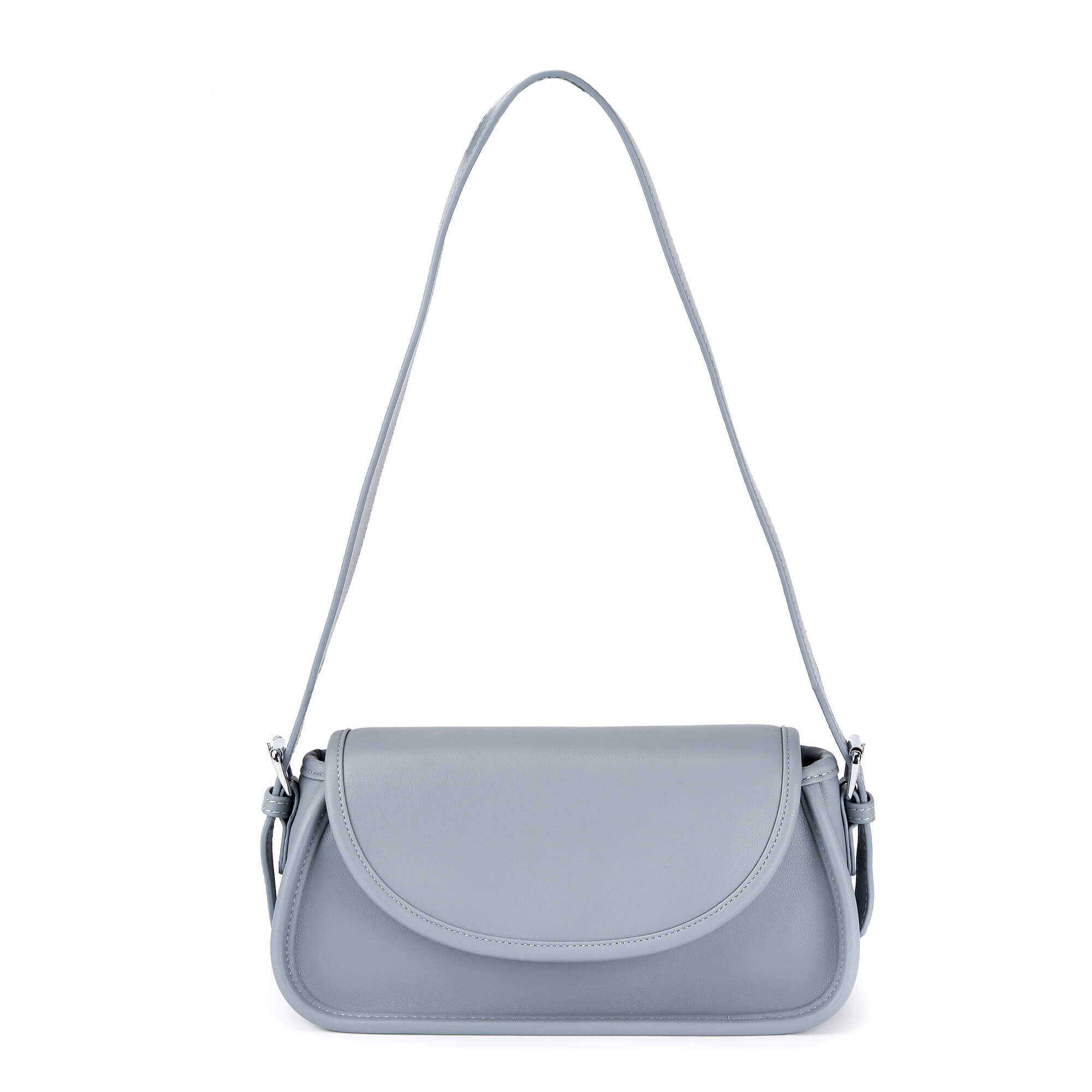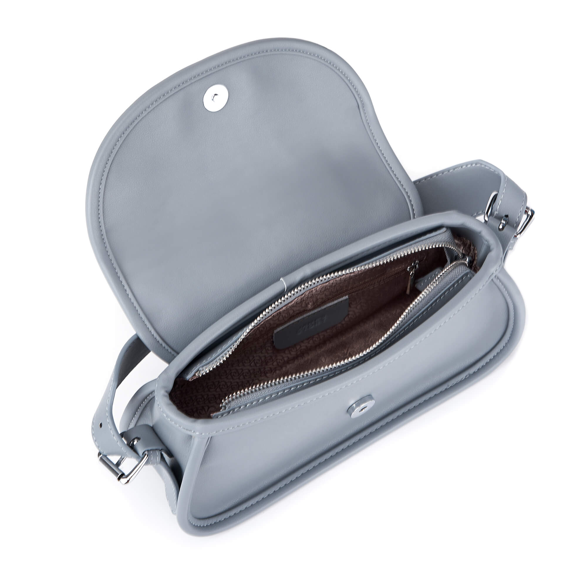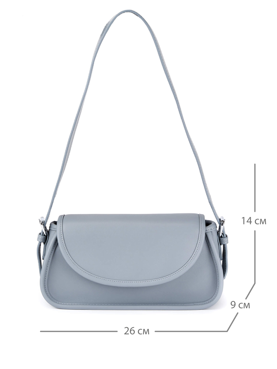 Женская сумка-багет из натуральной кожи с фурнитурой серебристого цвета. Под клапаном одно отделение на подкладе с фирменным паттерном, которое закрывается на молнию, и один карман на молнии. В комплекте два плечевых ремня: короткий широкий и длинный, регулируемый до 100 см. Сумка поставляется в текстильной и полиэтиленовой упаковке.