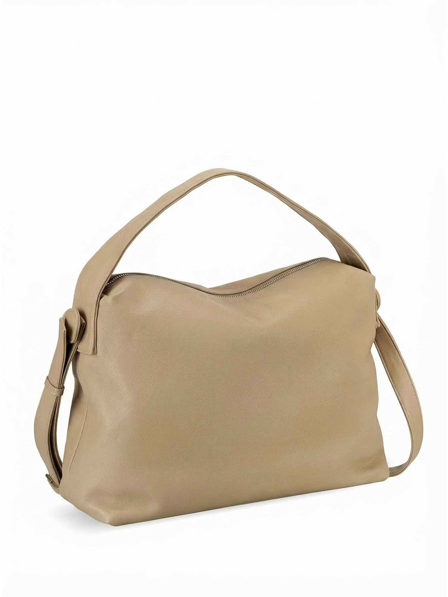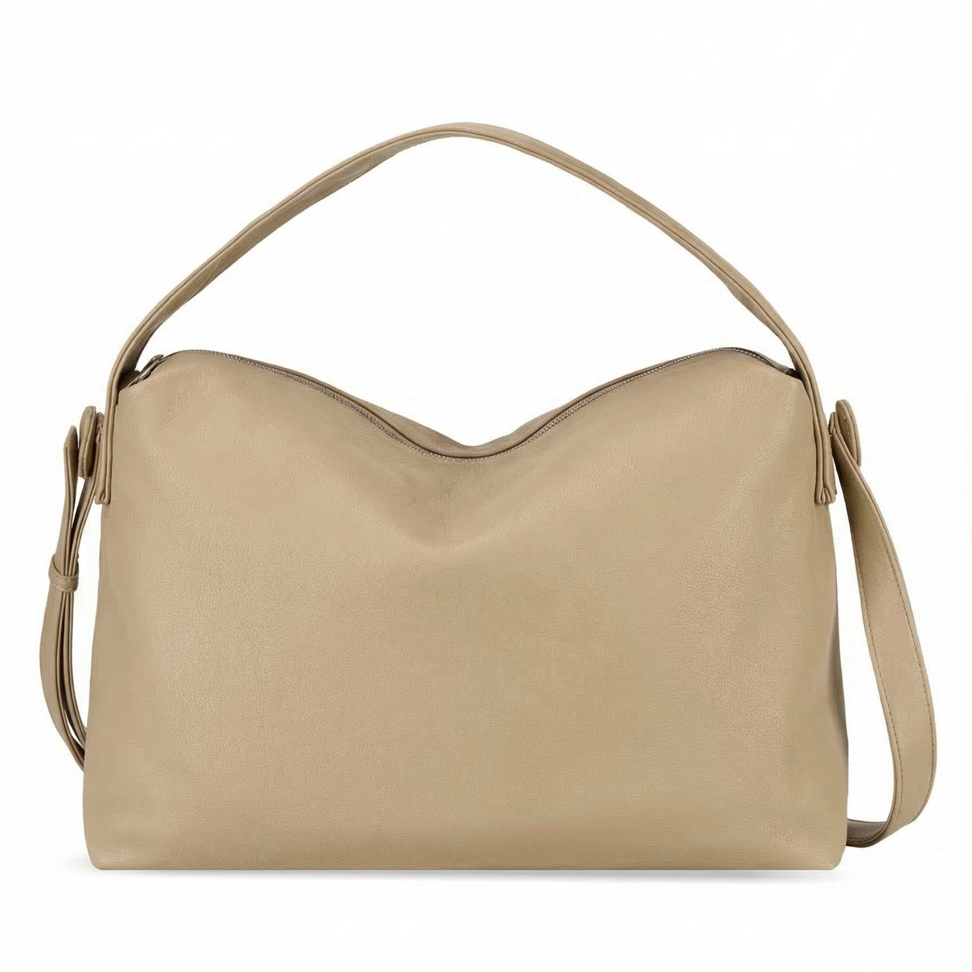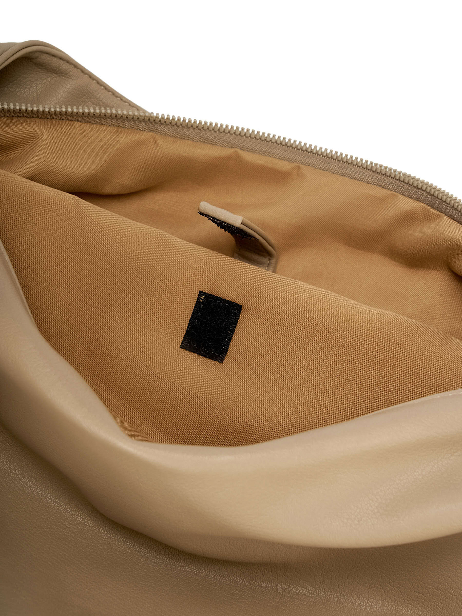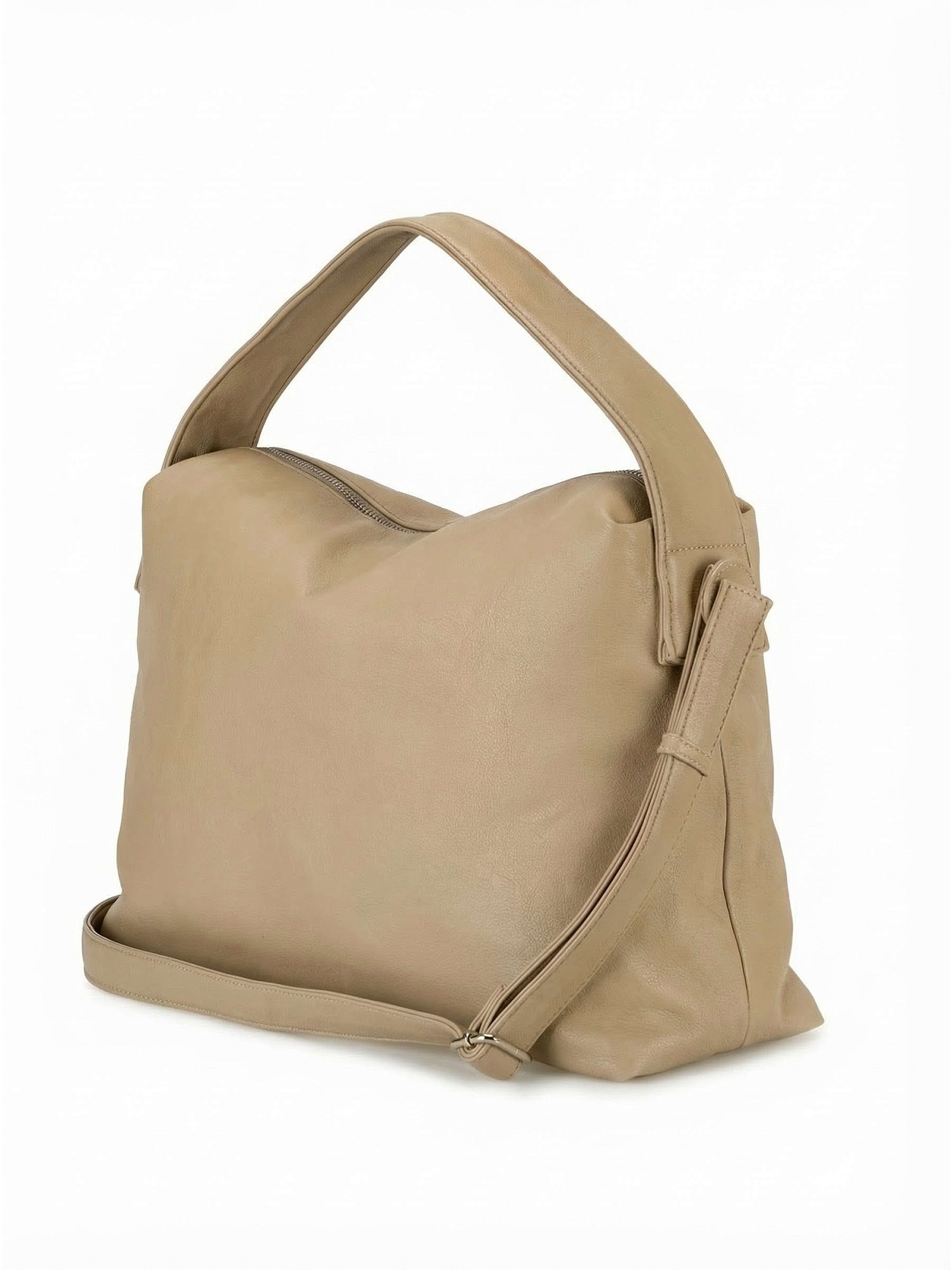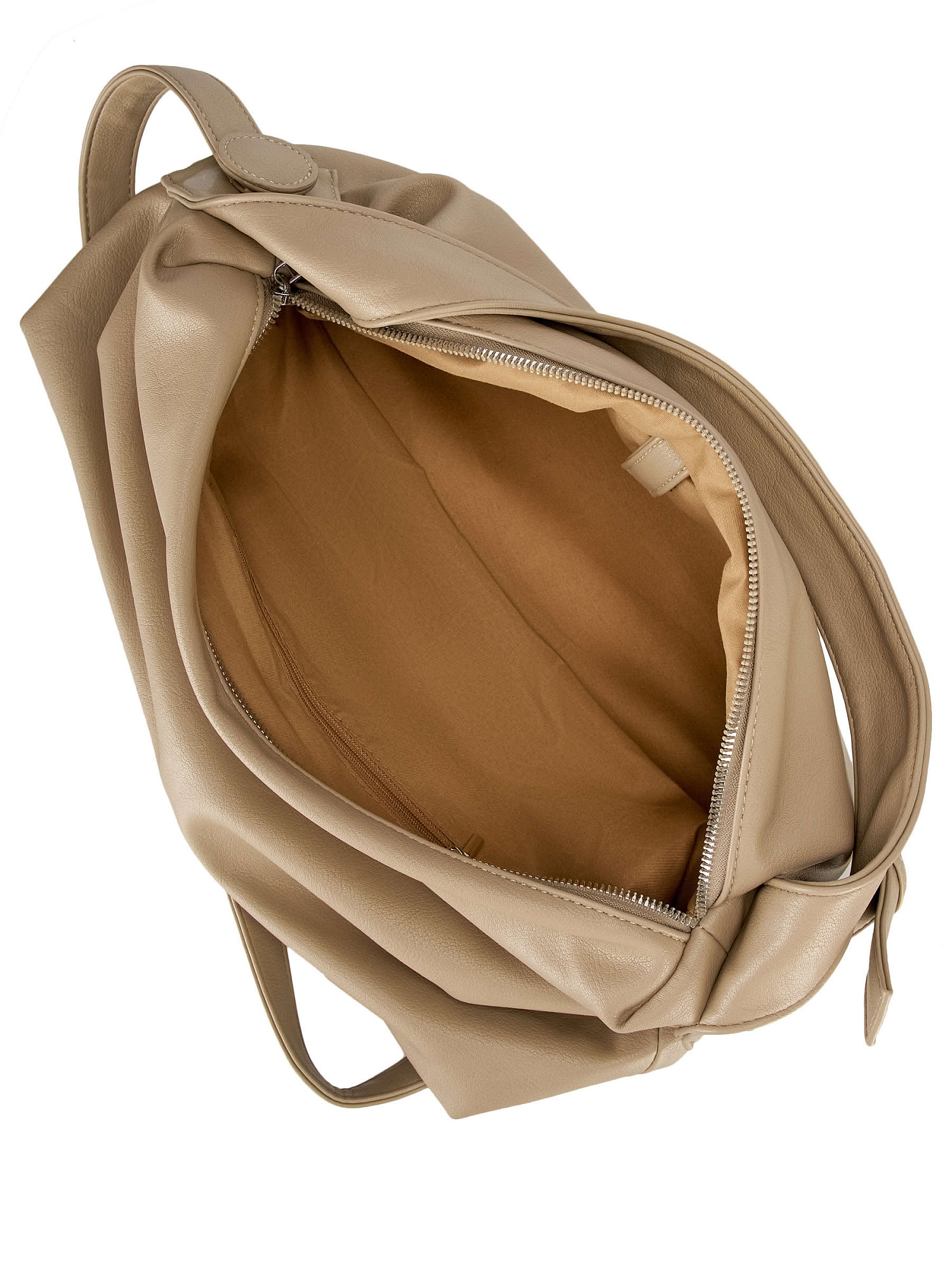 Вместительная сумка шоппер из гладкой искусственной кожи. Габариты изделия – 46х30х14 см. Основное отделение закрывается на молнию. Внутри два кармана: один открытый, другой потайной. Подклад сумки из плотного полиэстера. Высота ручки 20 см. Длинный плечевой ремень регулируется по длине.