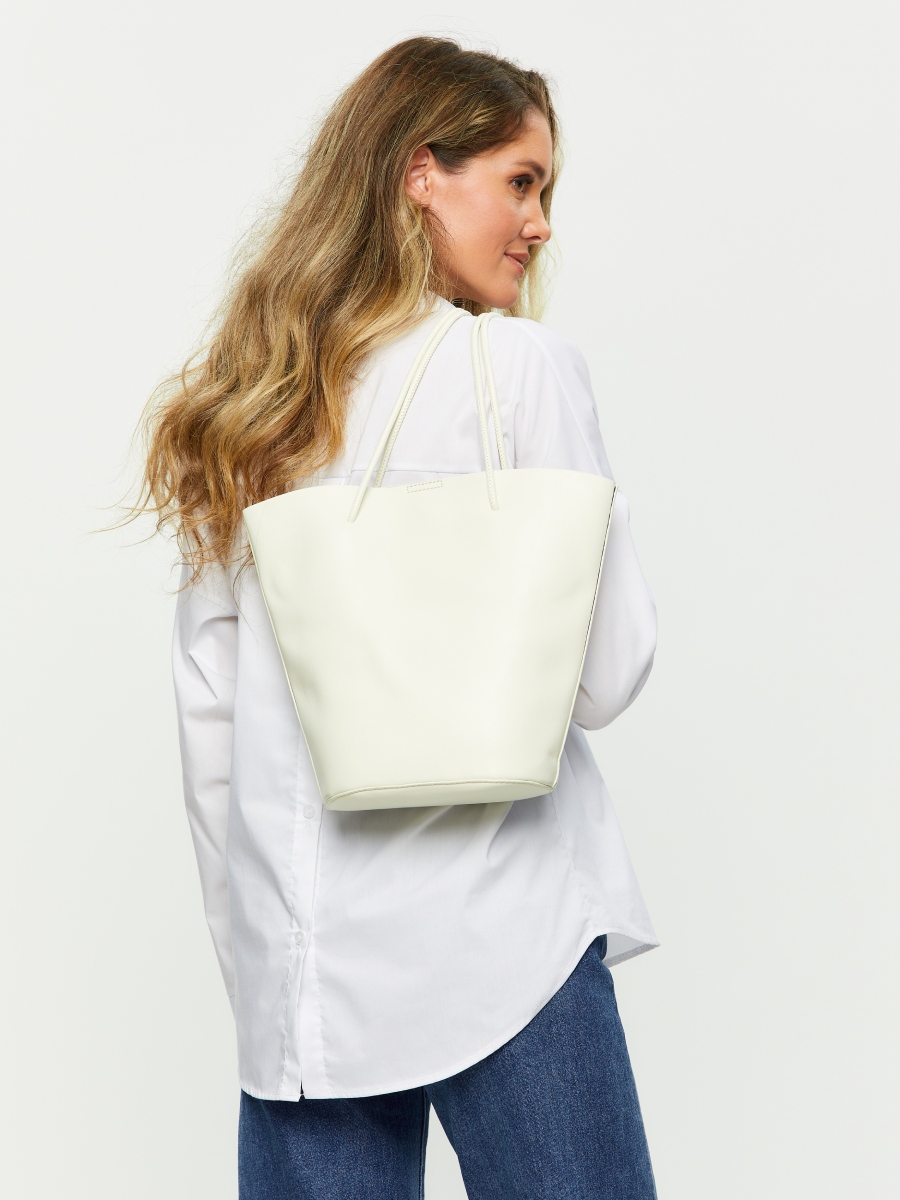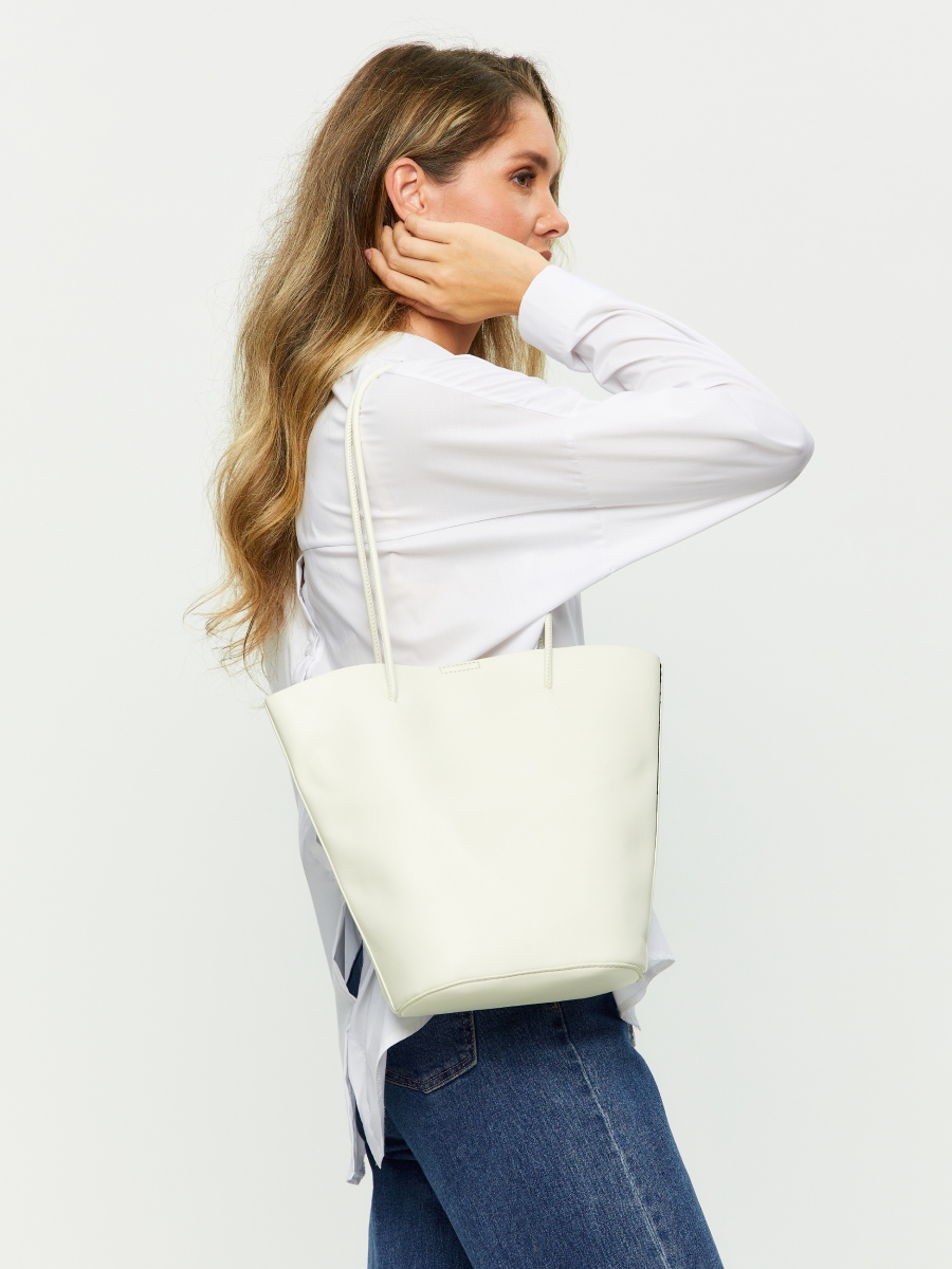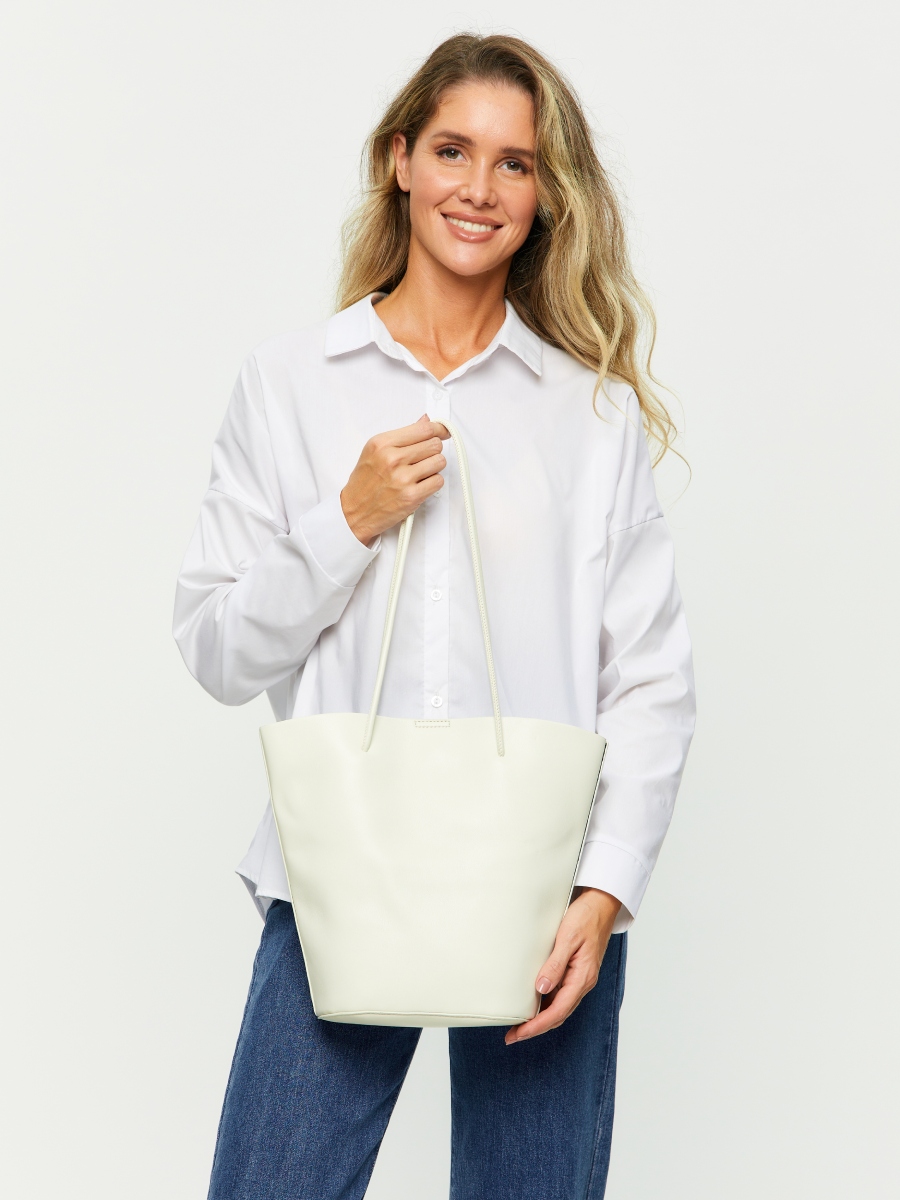 Женская сумка на плечо с высокими ручками изготовлена из гладкой качественной экокожи. Размер вместительной сумки (ШхВхГ) - 20х28х11 см. Внутри шоппера находится одно главное отделение без подклада, которое застегивается на магнитную кнопку. В комплект к сумочке входит косметичка на молнии размером 17х12х9 см., выполненная из искусственной кожи. Высота ручек - 28 см. Женская сумка повседневная, удобная и вместительная дополнит любой современный образ. Уплотненное дно позволяет сумочке сохранять форму и устойчивость. Фурнитура сумки-тоут выполнена в серебристом цвете.