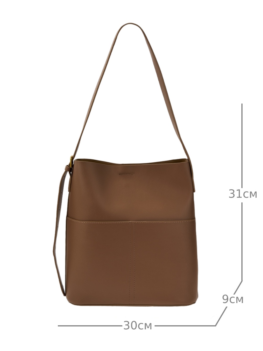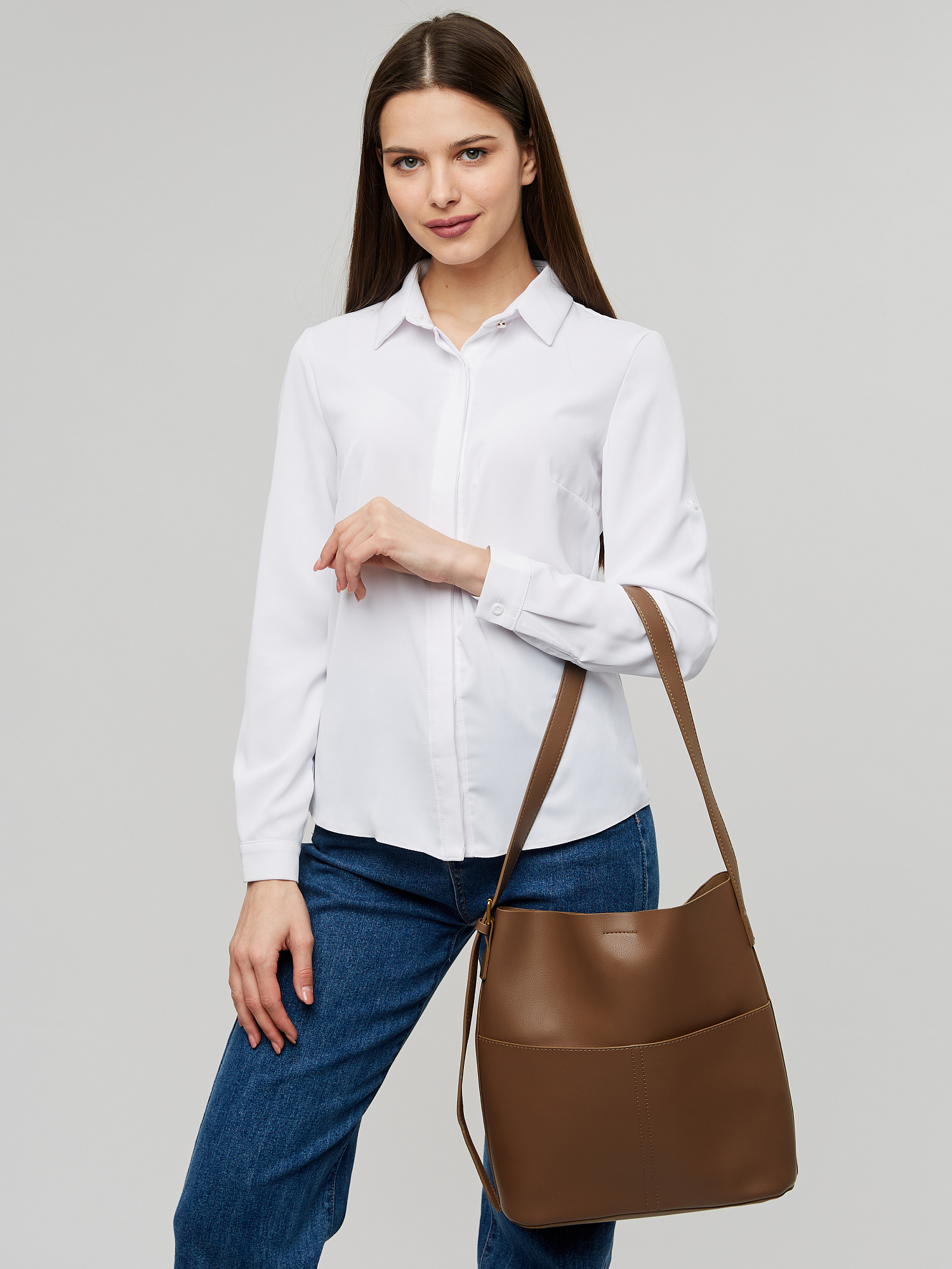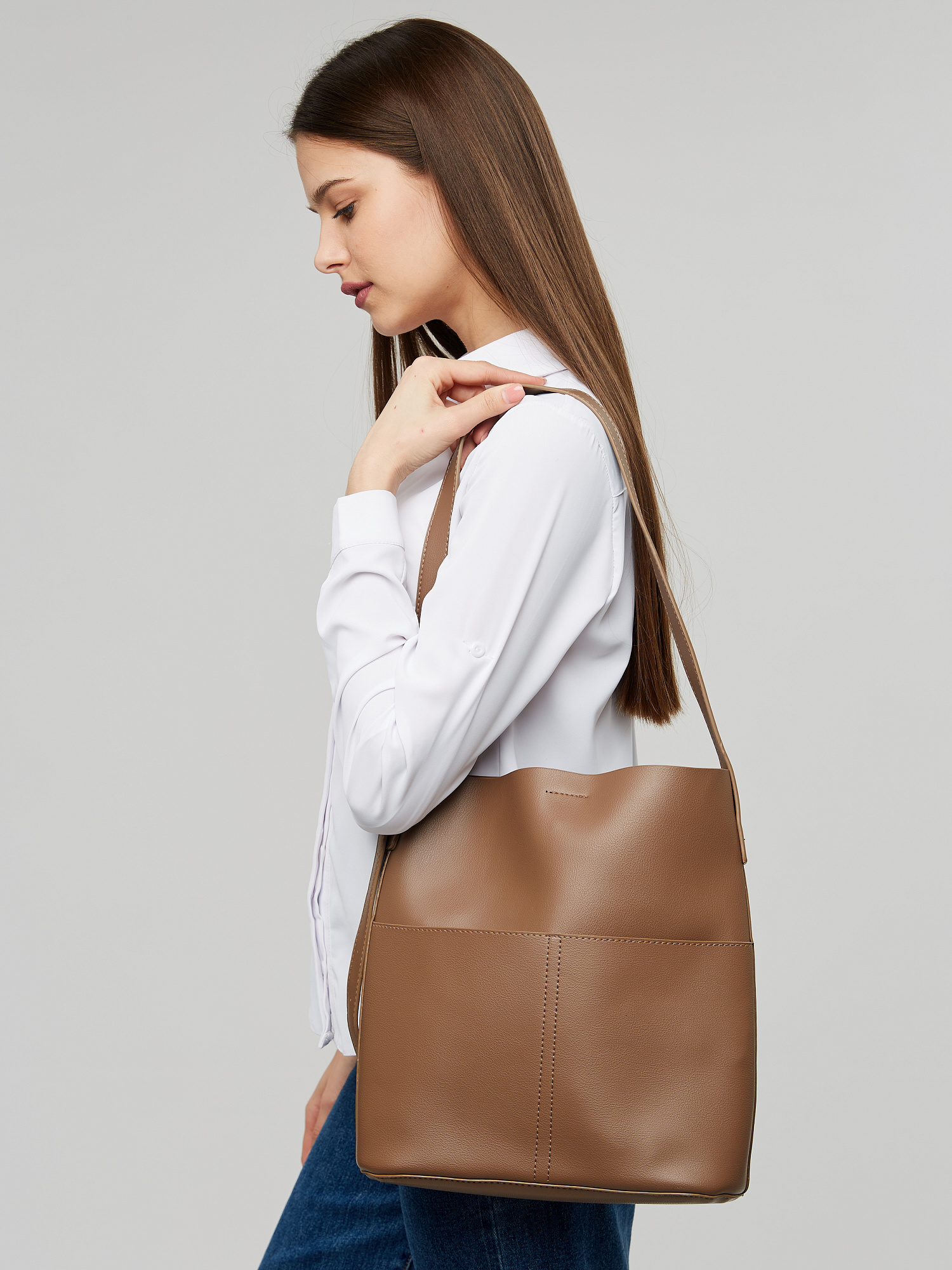 Женская сумка-шоппер выполнена из качественной гладкой экокожи, которая имеет невероятно приятную на ощупь фактуру. Габариты вместительной сумки - (ШхВхГ) 30х31х9 см. Сумка большая и вмещает папки и документы формата А4., поэтому прекрасно впишется в классические и деловые образы. Внутри сумочки находится одно основное отделение без подклада, которое закрывается на магнитную кнопку. На внешней передней стороне расположены 2 открытых кармана. В комплект к сумке на плечо входит косметичка на молнии размером 23х19х5 см., изготовленная из искусственной кожи. Плечевой ремень регулируется по длине до 90 см., поэтому сумку удобно носить на руке и на плечо. Фурнитура выполнена в цвете античного золота.
