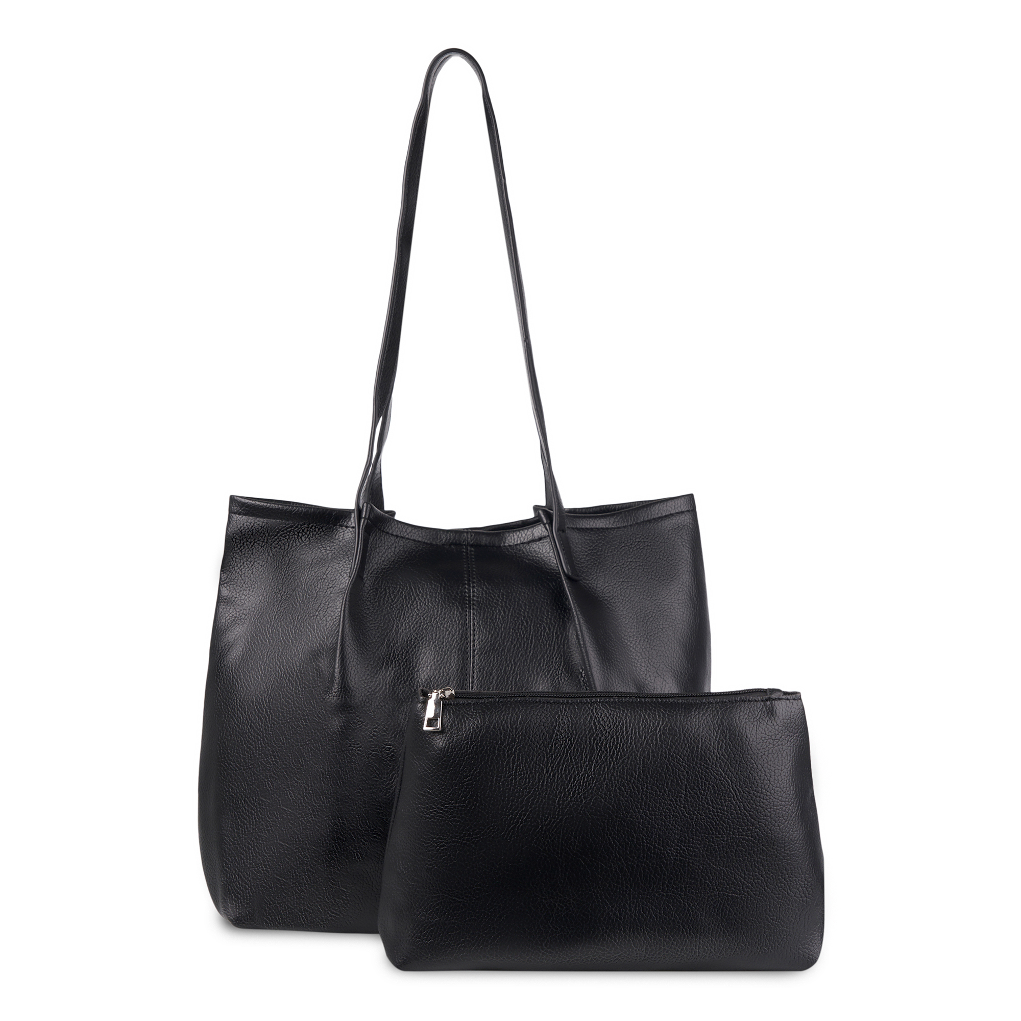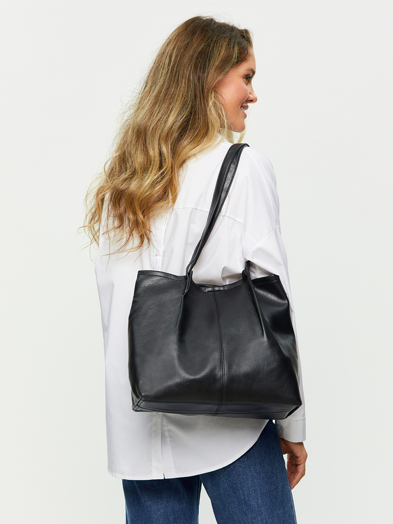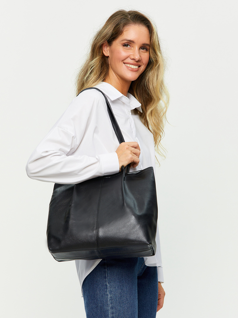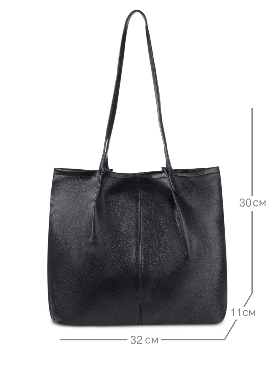 Женская сумка-шоппер выполнена из высококачественной зернистой экокожи, которая имеет невероятно приятную на ощупь фактуру. Сумка большая и вместительная, габариты изделия - (ШхВхГ) 30х32х11 см. Сумочка вмещает папки и документы формата А4. Удобная, легкая, стильная - такая сумка без труда дополнит любой образ. Внутри сумки на плечо находится одно основное отделение, которое закрывается на магнитную кнопку. В комплект входит съемная текстильная косметичка на молнии. Фурнитура сумки с двумя ручками выполнена в серебристом цвете.