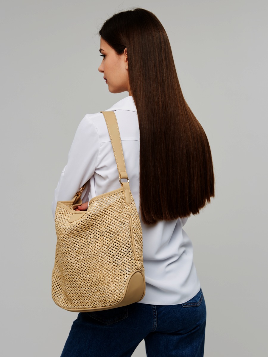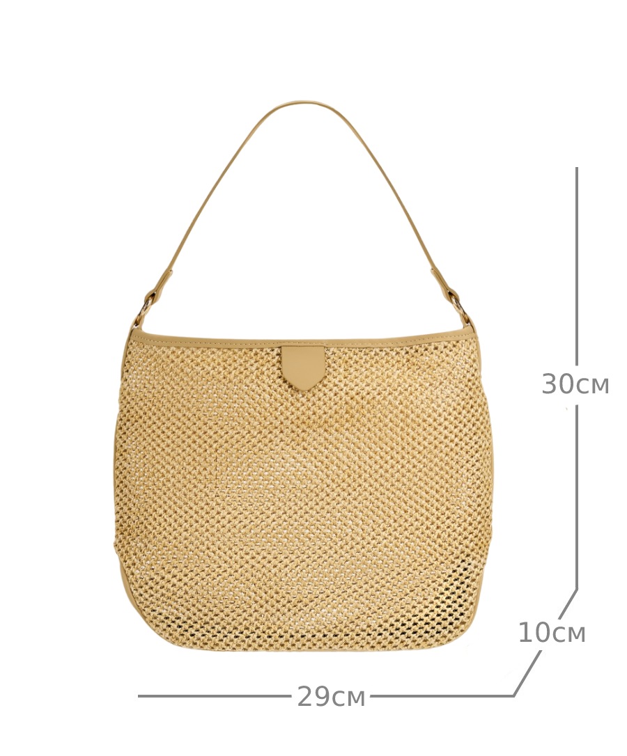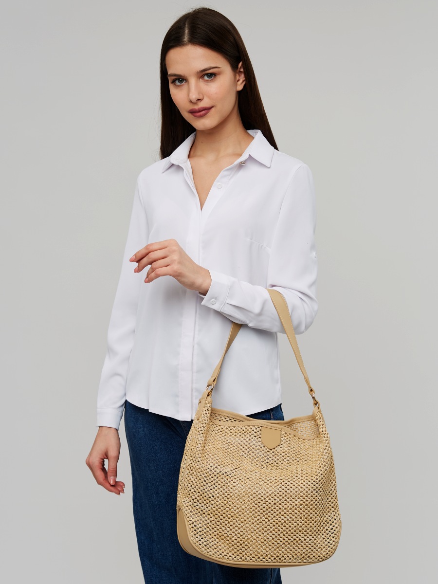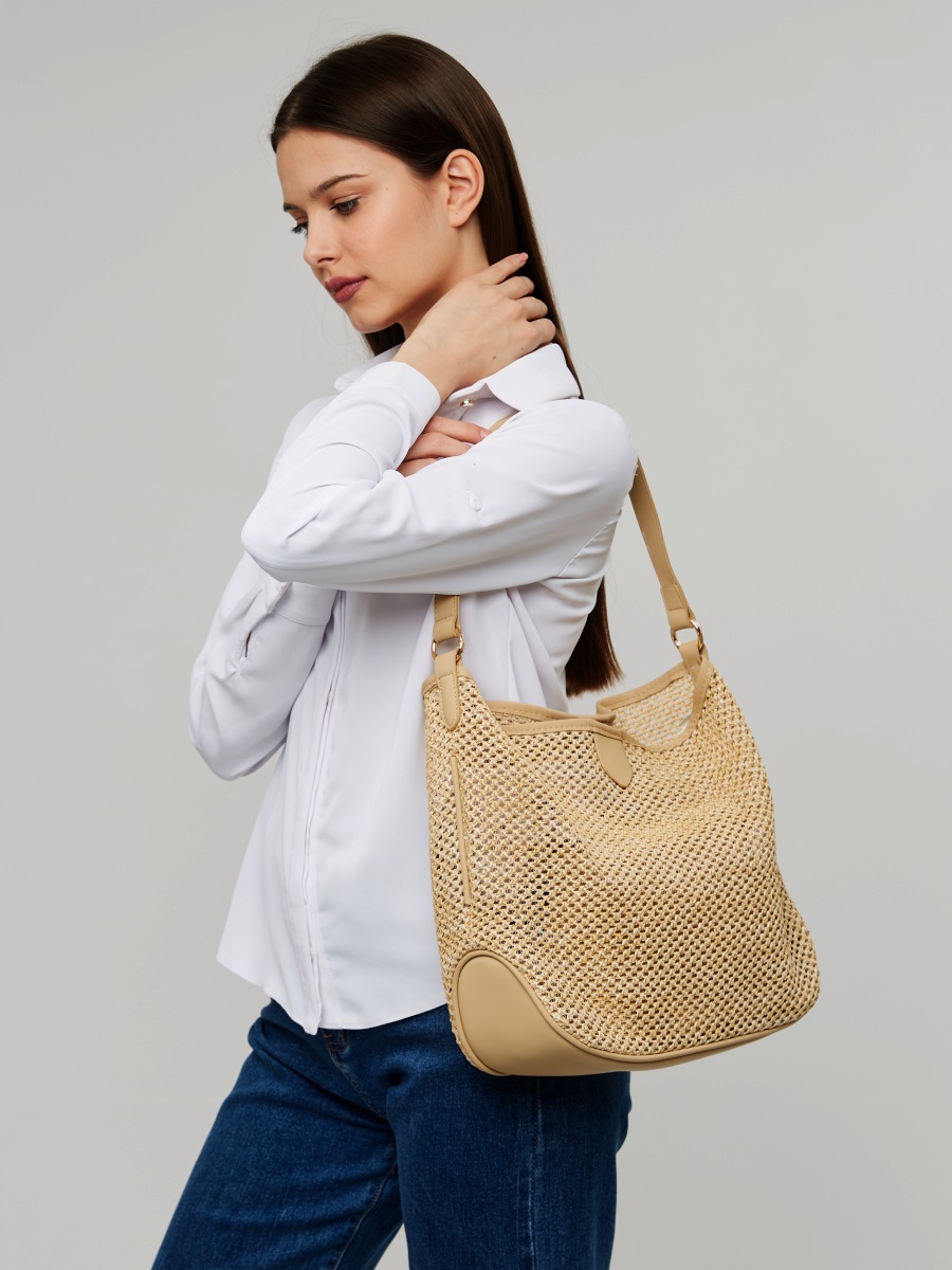 Плетеная женская сумка-хобо с элементами из гладкой экокожи станет дополнением любого образа. Габариты вместительной сумки - (ШхВхГ) 29х30х10 см. Удобная сумочка на плечо имеет одно большое основное отделение, которое закрывается на магнитную кнопку. В комплект входит косметичка на молнии (22х15х7 см.), выполненная из качественной экокожи. Также к летней сумке прилагаются 2 съемных плечевых ремня длиной 55 и 85 см., поэтому сумочку можно носить как сумку шоппер, на руке и на плечо. Уплотненное дно и каркасные детали позволяют сумке сохранять форму и устойчивость. Фурнитура золотистого цвета.