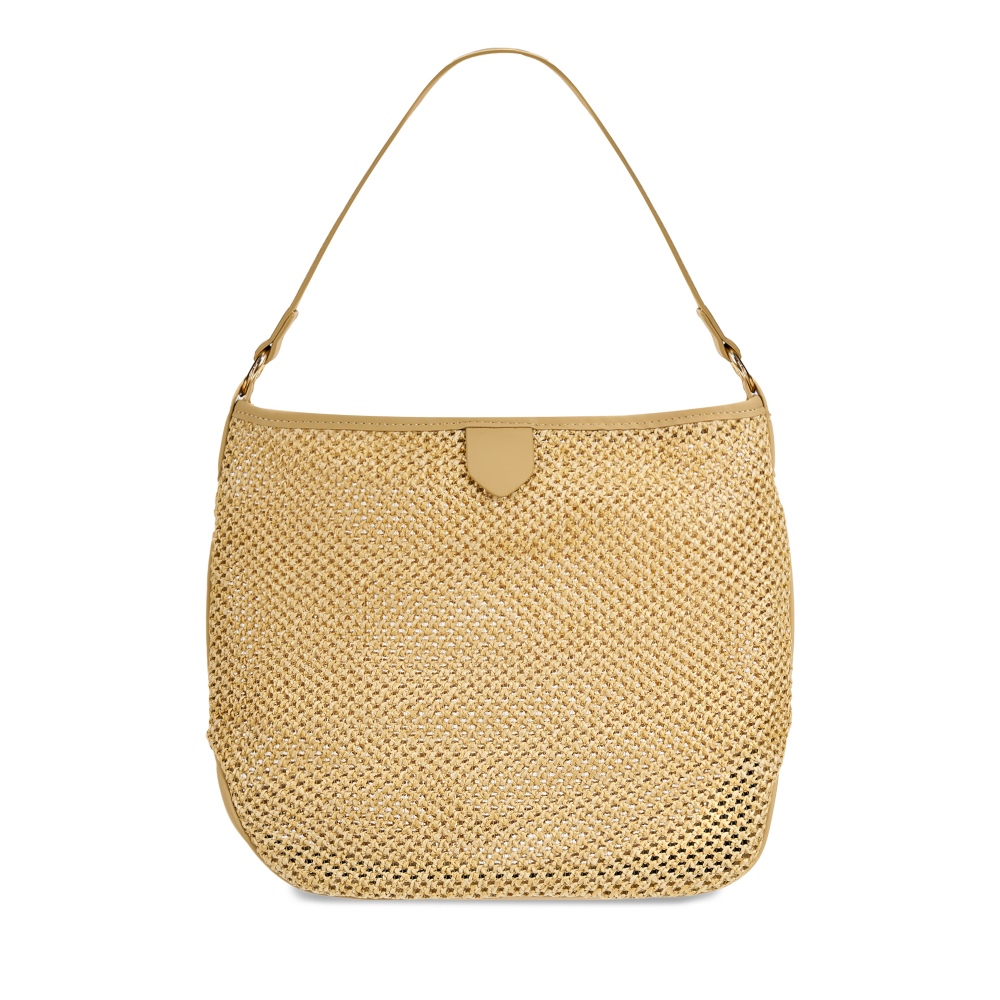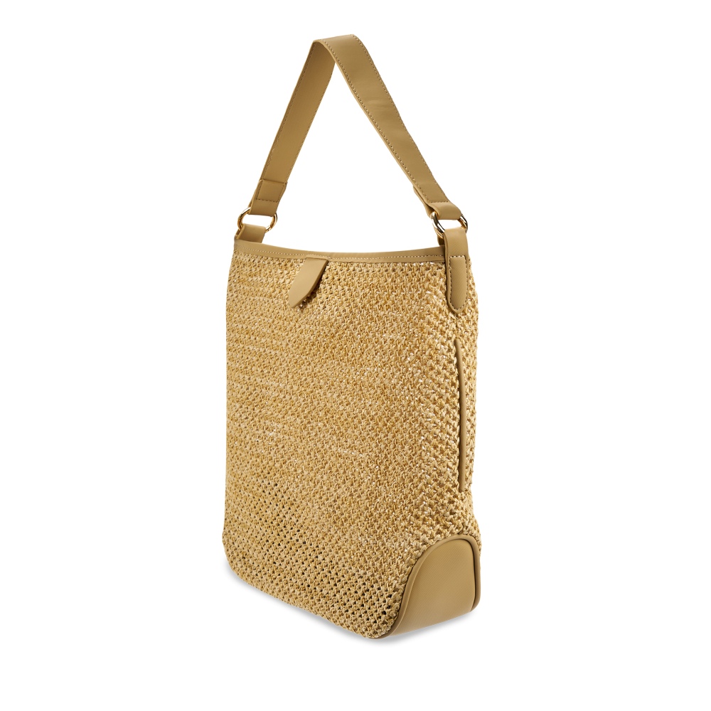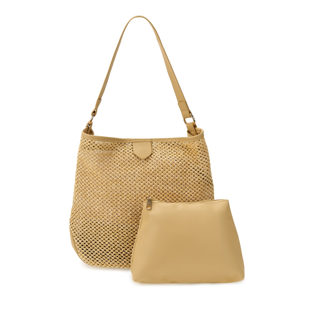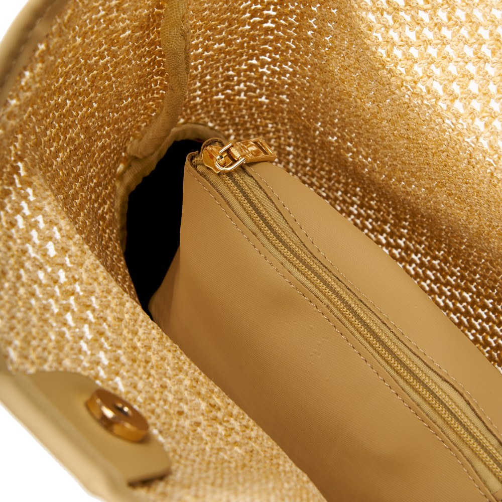 Плетеная женская сумка-хобо с элементами из гладкой экокожи станет дополнением любого образа. Габариты вместительной сумки - (ШхВхГ) 29х30х10 см. Удобная сумочка на плечо имеет одно большое основное отделение, которое закрывается на магнитную кнопку. В комплект входит косметичка на молнии (22х15х7 см.), выполненная из качественной экокожи. Также к летней сумке прилагаются 2 съемных плечевых ремня длиной 55 и 85 см., поэтому сумочку можно носить как сумку шоппер, на руке и на плечо. Уплотненное дно и каркасные детали позволяют сумке сохранять форму и устойчивость. Фурнитура золотистого цвета.
