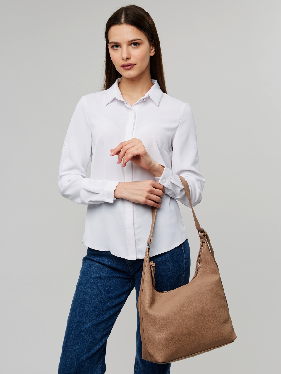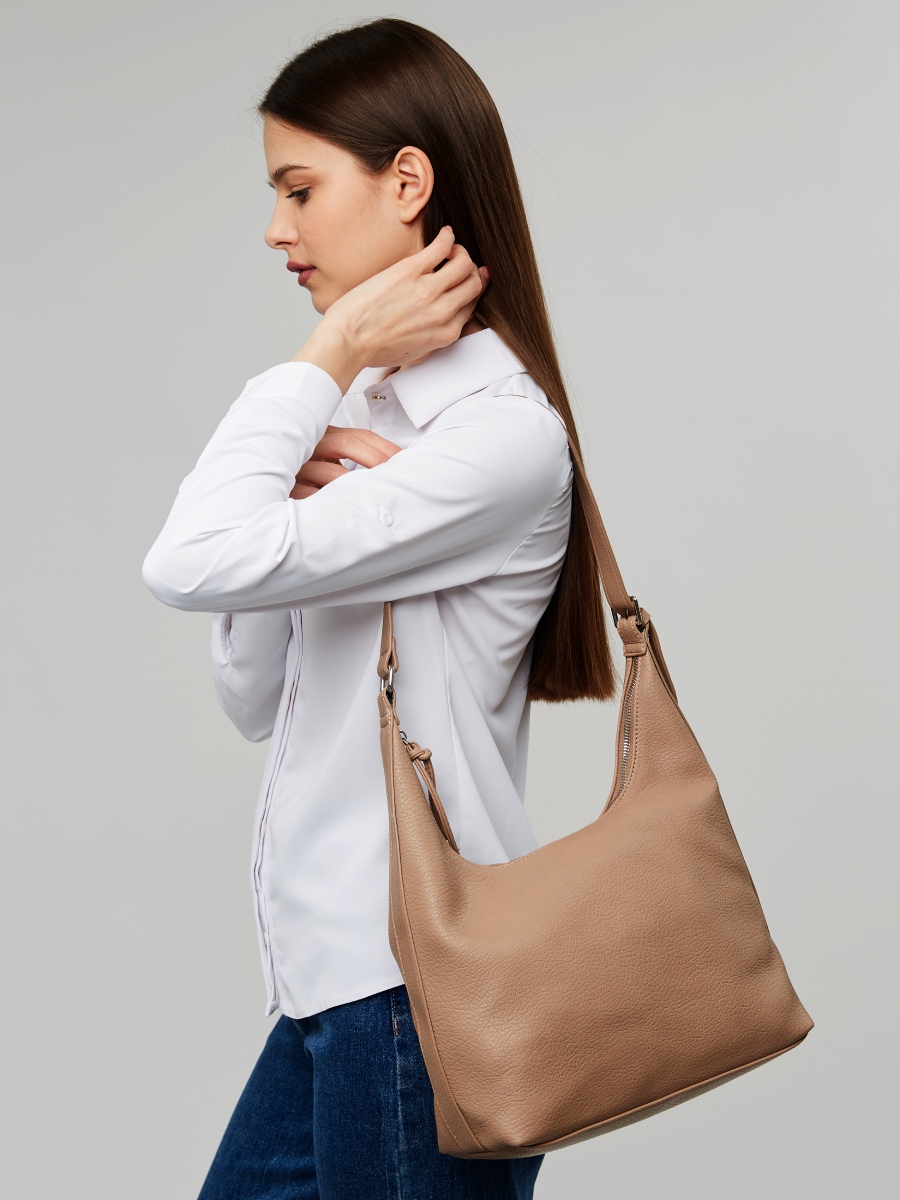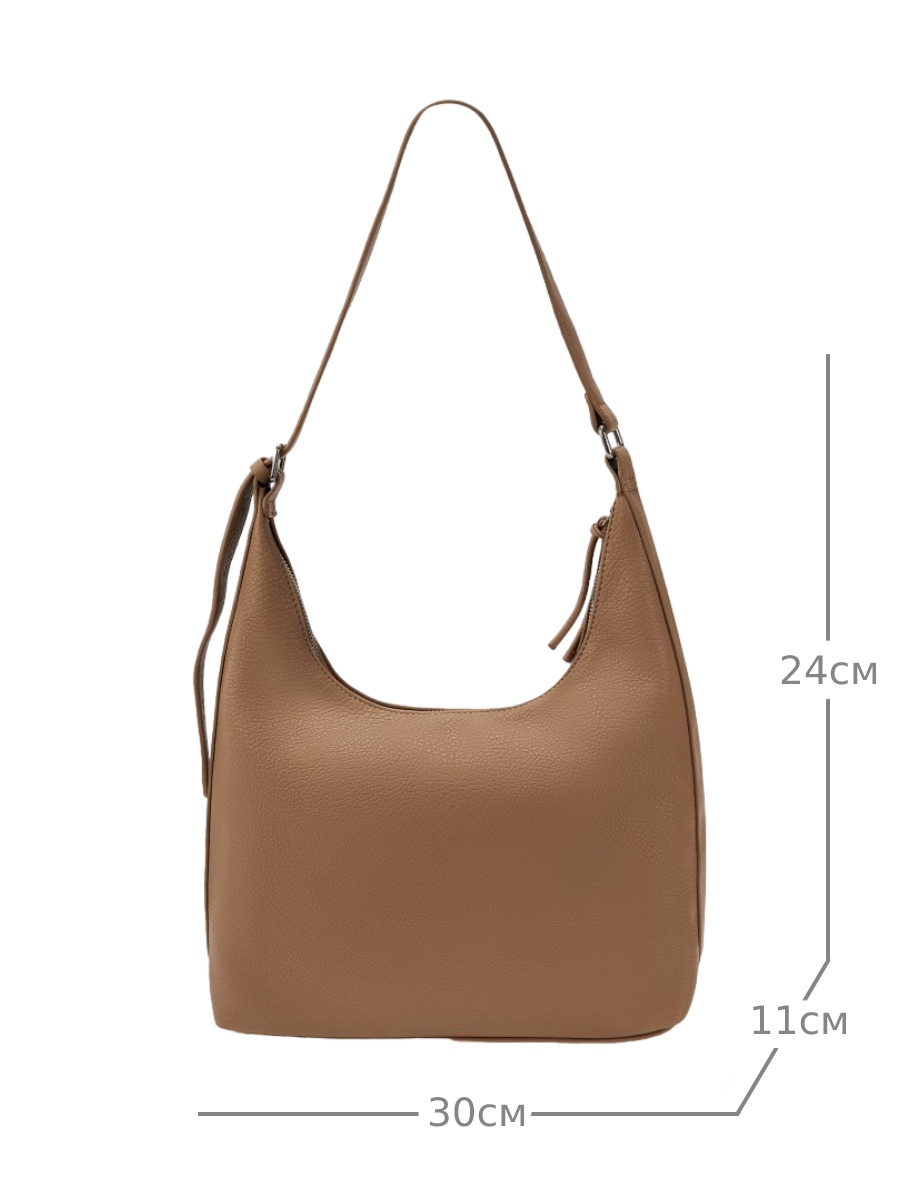 Большая женская сумка-хобо выполнена из качественной зернистой экокожи, которая имеет мягкую на ощупь фактуру. Габариты сумки на плечо - (ШхВхГ) 30х24х11 см. Сумка с широким ремнем легкая и универсальная, она без труда дополнит любой образ. Внутри вместительной сумки расположено одно главное отделение на текстильном подкладе, которое застегивается на надежную молнию. Также внутри сумки-шопера есть открытый карман и удобный карман на молнии. Плечевой ремень регулируется по длине до 70 см., поэтому сумку удобно носить на руке и на плечо. Уплотненное дно позволяет сумочке сохранять форму и устойчивость. Фурнитура выполнена в серебристом цвете.