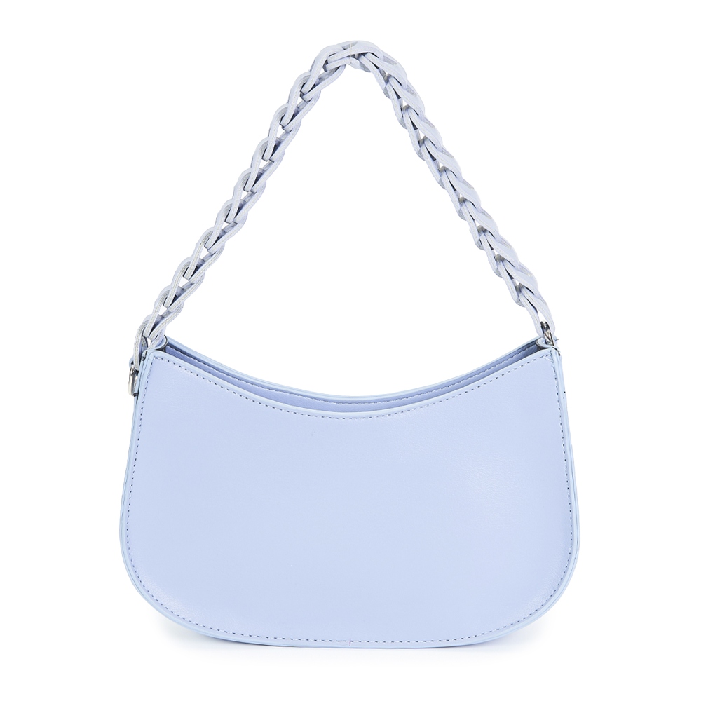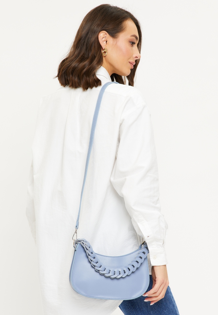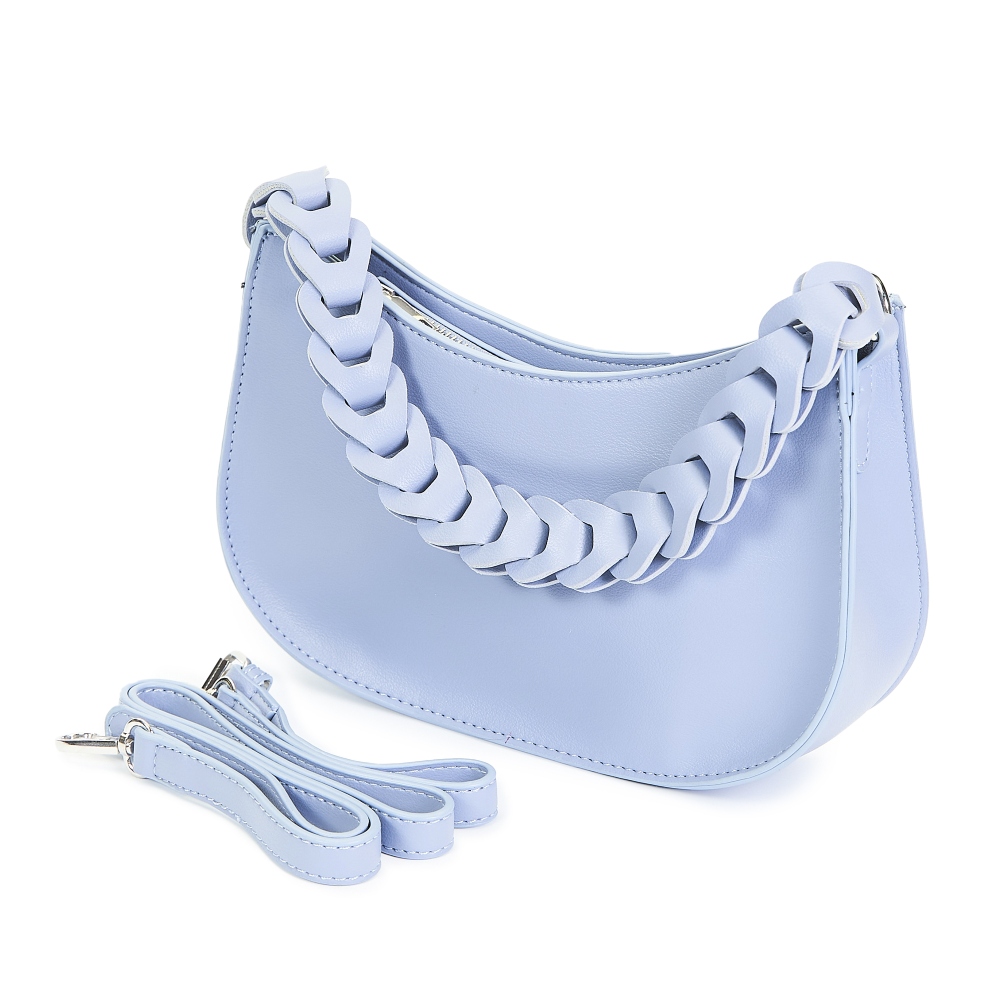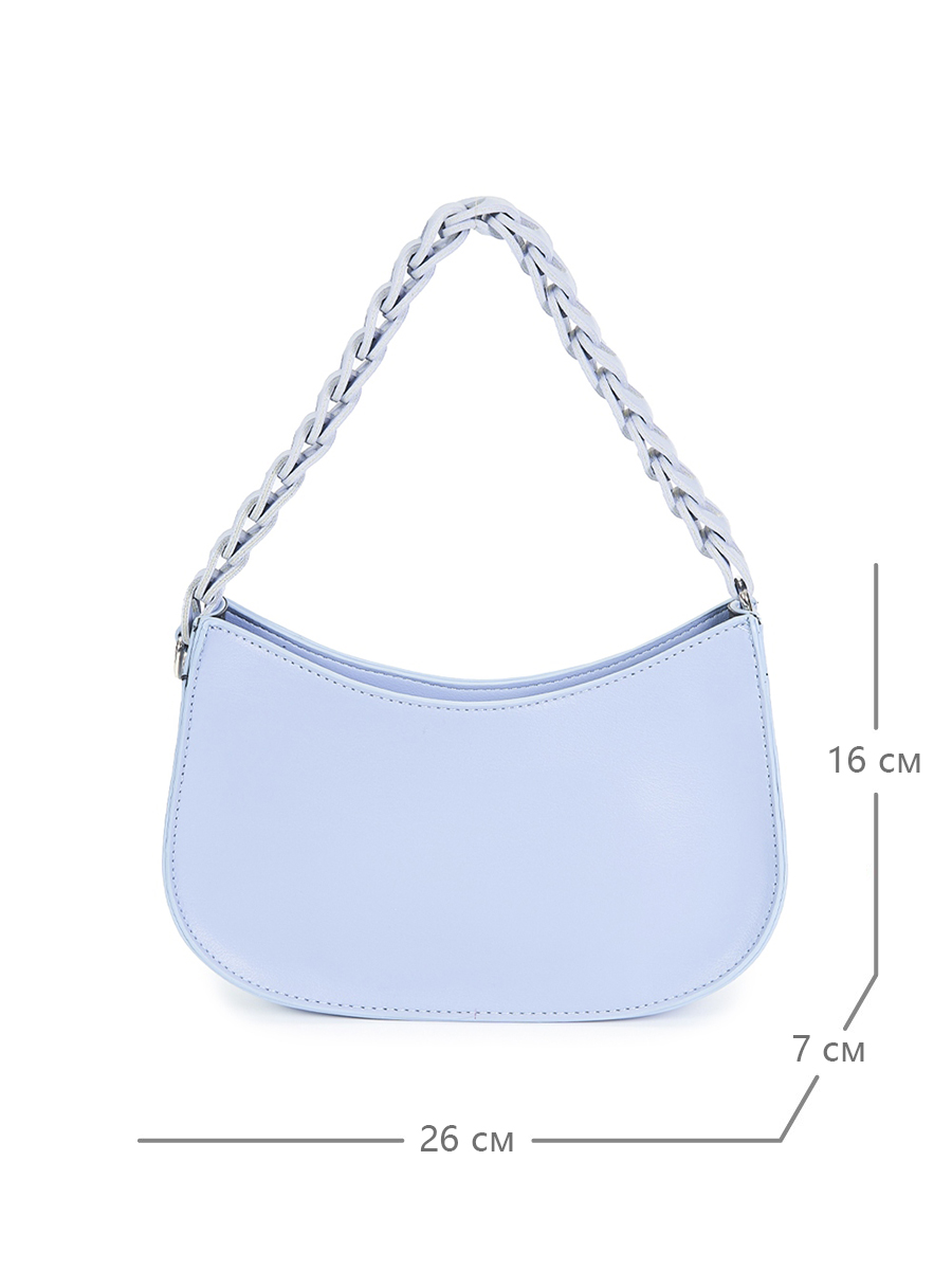 Женская сумка из искусственной кожи с серебристой фурнитурой и несъемным коротким плетеным ремешком. Одно основное отделение без подклада. Внутри два кармана: один на молнии и один открытый. В комплекте один узкий съемный плечевой ремень, регулируемый до 112 см. Сумка поставляется в текстильной и полиэтиленовой упаковке.