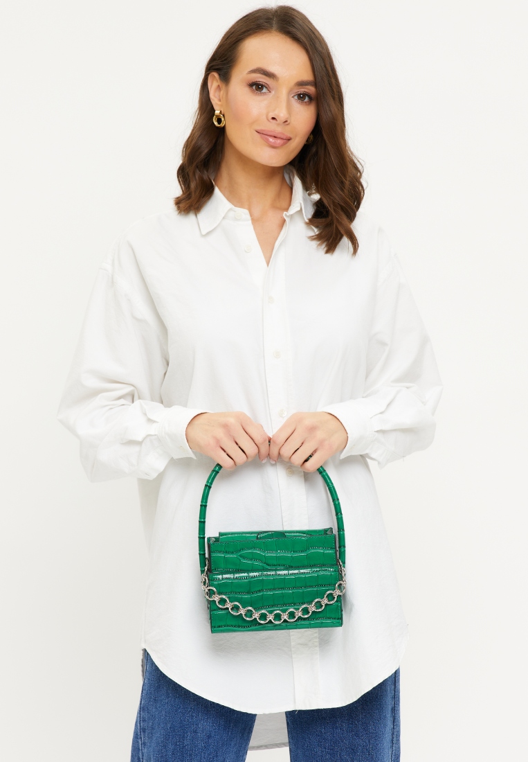 Женская сумка-сэтчел из натуральной кожи с клапаном на магните и серебристой фурнитурой. Модель с подкладом. К сумке прилагается плечевой ремень, регулируемый до 115 см. Цепочка не отстегивается. Сумка поставляется в текстильной и полиэтиленовой упаковке.
