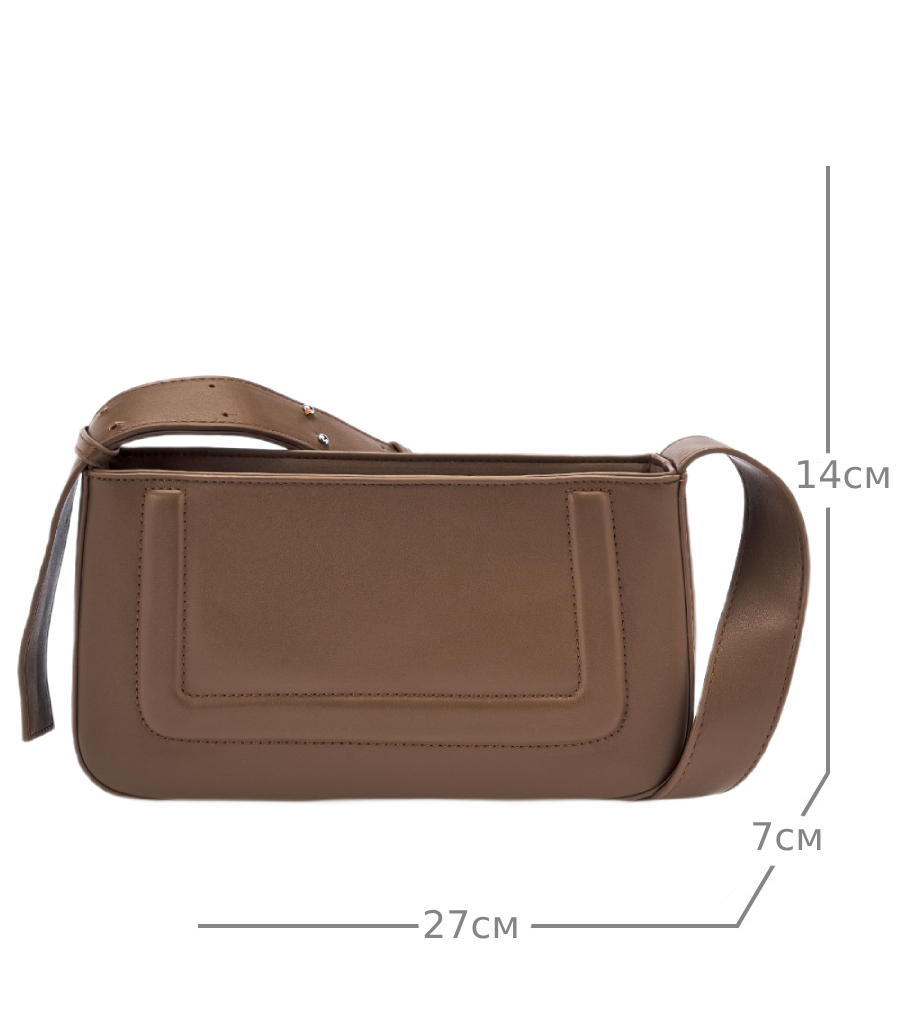 Женская сумка формы багет выполнена из искусственной кожи, которая имеет гладкую и приятную на ощупь фактуру. Сумка в жестком каркасе. Габариты сумочки - (ВхШхГ) 14х27х7 см. Основное отделение кроссбоди на подкладе из плотного полиэстера закрывается на надежную молнию. Внутри маленькой сумки один карман на молнии. Широкий плечевой ремень несъемный и регулируется по длине до 95 см., поэтому сумку можно носить в руке, на плечо и через плечо как кроссбоди. Фурнитура выполнена из металла в серебристом цвете. Сумка с застежкой поставляется в текстильной (пыльник) и полиэтиленовой упаковке, что защищает ее от повреждений, а также позволяет удобно хранить женскую сумочку в дальнейшем использовании.
