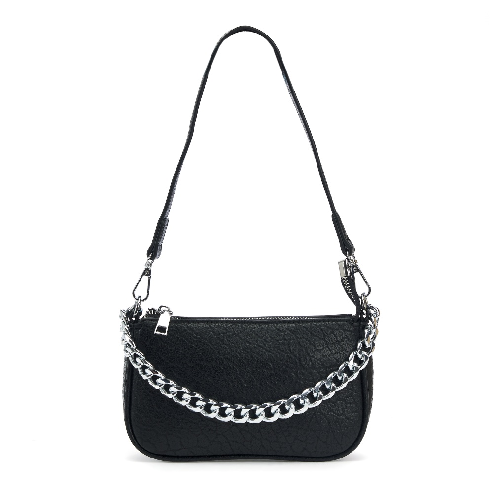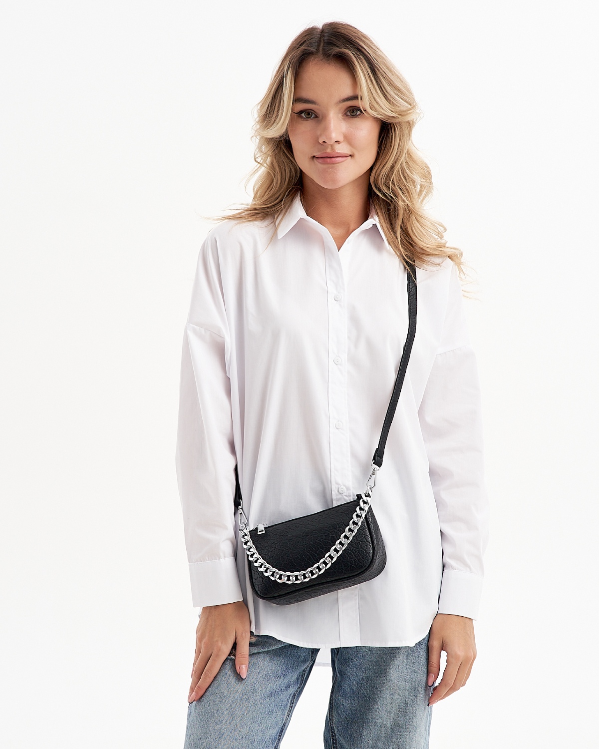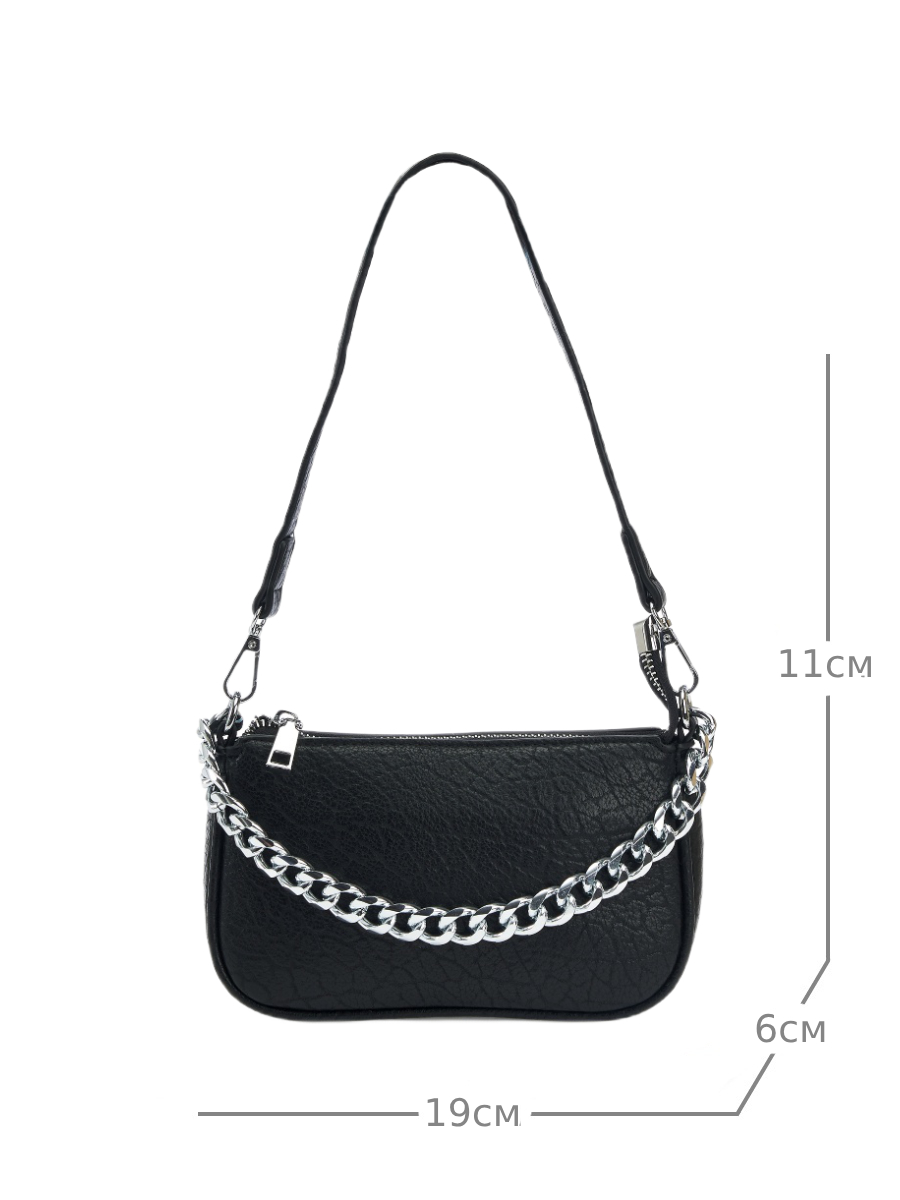 Женская маленькая сумка выполнена из искусственной кожи, которая имеет приятную крупную текстуру. Габариты сумочки - (ВхШхГ) 11х19х6 см. Основное отделение на подкладе из плотного полиэстера закрывается на надежную молнию. Внутри один кармашек на молнии. Несъемная ручка-цепочка-высотой 14 см. В комплекте плечевой ремень- 115 см. и короткий - 50 см, позволят носить сумку на плечо и через плечо как кроссбоди. Фурнитура выполнена из металла в серебристом цвете. Сумка с ручкой поставляется в текстильной (пыльник) и полиэтиленовой упаковке, что защищает ее от повреждений, а также позволяет удобно хранить женскую сумочку в дальнейшем использовании.