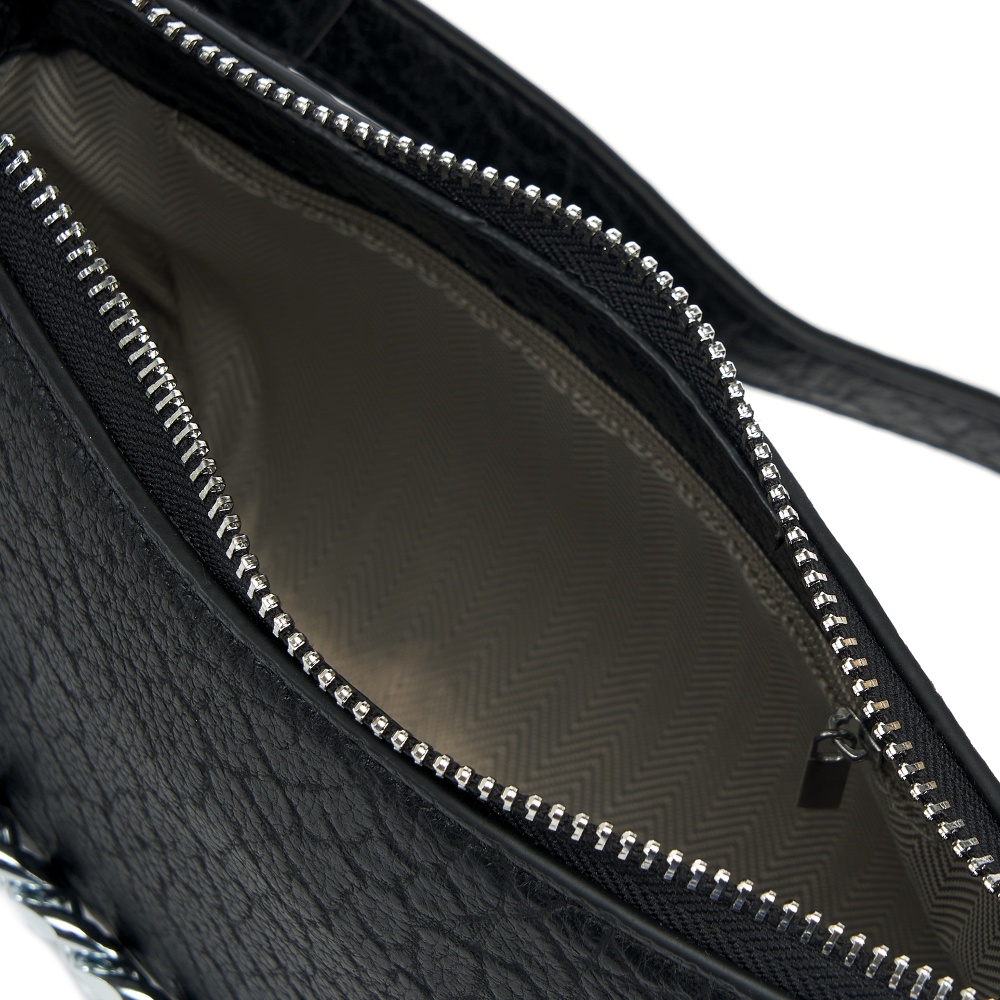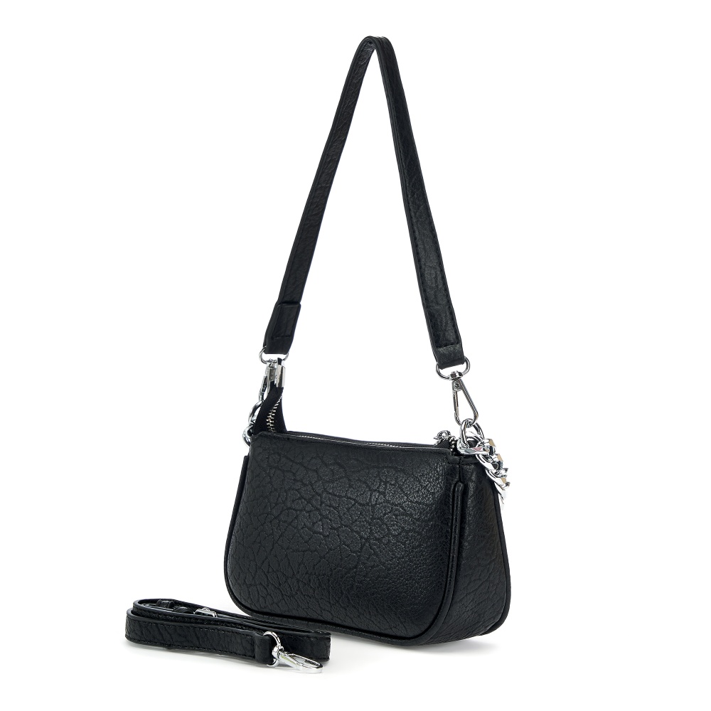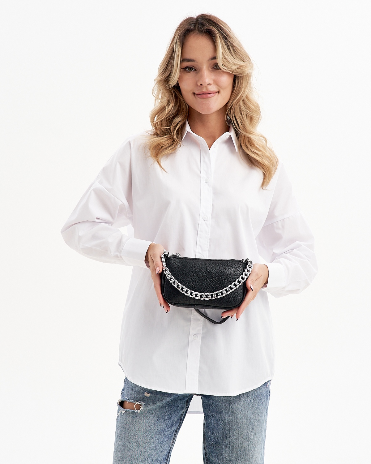 Женская маленькая сумка выполнена из искусственной кожи, которая имеет приятную крупную текстуру. Габариты сумочки - (ВхШхГ) 11х19х6 см. Основное отделение на подкладе из плотного полиэстера закрывается на надежную молнию. Внутри один кармашек на молнии. Несъемная ручка-цепочка-высотой 14 см. В комплекте плечевой ремень- 115 см. и короткий - 50 см, позволят носить сумку на плечо и через плечо как кроссбоди. Фурнитура выполнена из металла в серебристом цвете. Сумка с ручкой поставляется в текстильной (пыльник) и полиэтиленовой упаковке, что защищает ее от повреждений, а также позволяет удобно хранить женскую сумочку в дальнейшем использовании.
