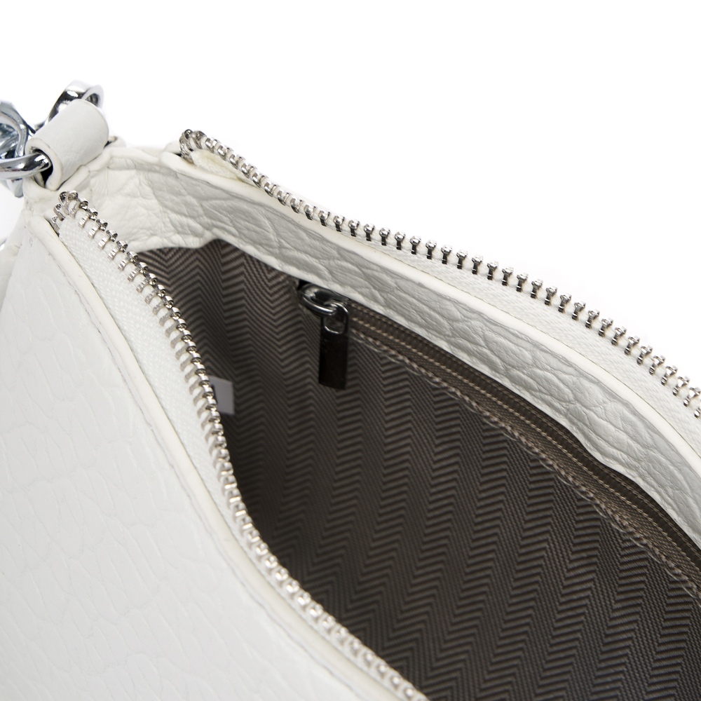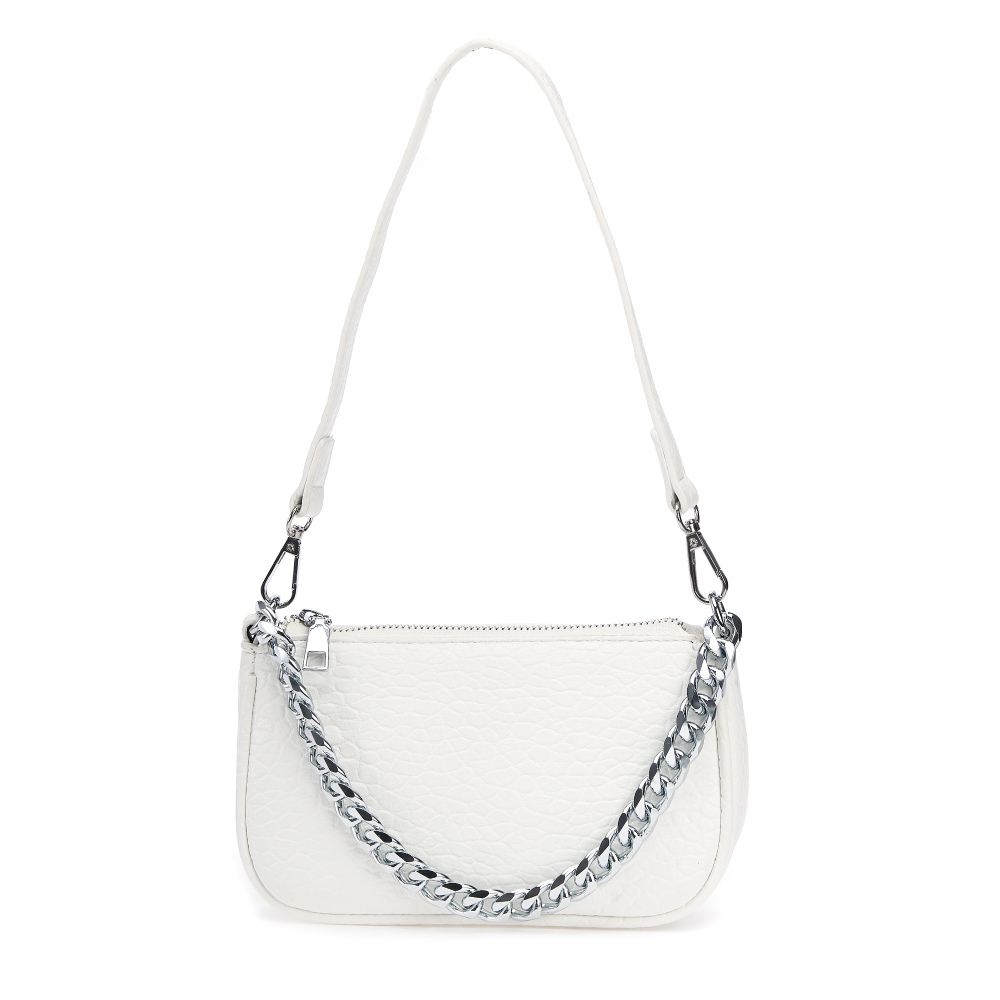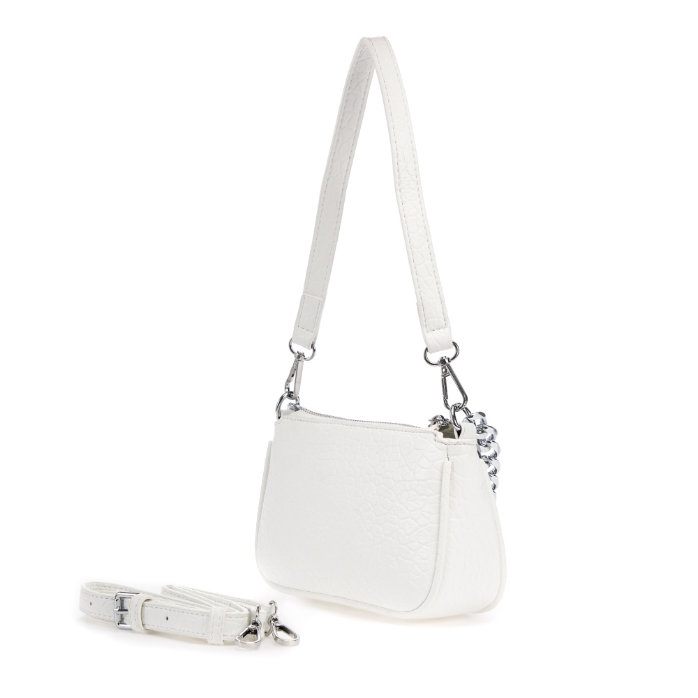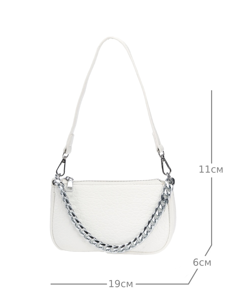 Женская маленькая сумка выполнена из искусственной кожи, которая имеет приятную крупную текстуру. Габариты сумочки - (ВхШхГ) 11х19х6 см. Основное отделение на подкладе из плотного полиэстера закрывается на надежную молнию. Внутри один кармашек на молнии. Несъемная ручка-цепочка-высотой 14 см. В комплекте плечевой ремень- 115 см. и короткий - 50 см, позволят носить сумку на плечо и через плечо как кроссбоди. Фурнитура выполнена из металла в серебристом цвете. Сумка с ручкой поставляется в текстильной (пыльник) и полиэтиленовой упаковке, что защищает ее от повреждений, а также позволяет удобно хранить женскую сумочку в дальнейшем использовании.