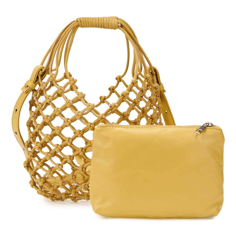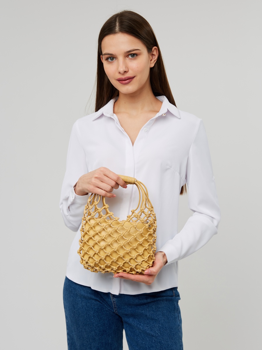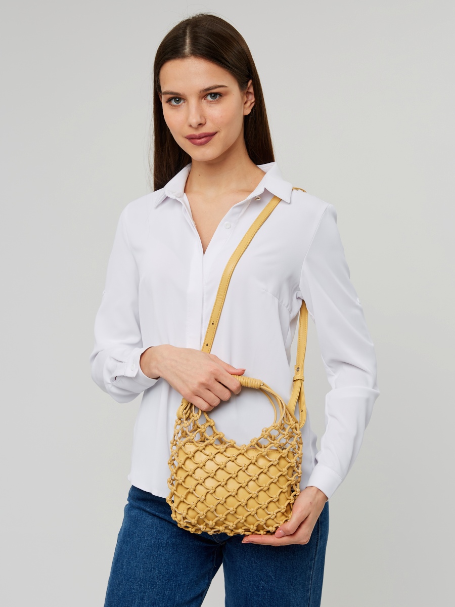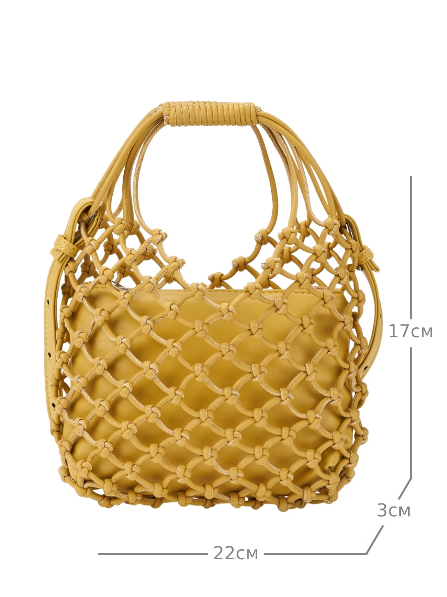 Женская сумка-авоська выполнена из гладкой искусственной кожи, которая обладает мягкой и приятной на ощупь фактурой. Габариты плетеной сумочки - (ШхВхГ) 22х17х3 см. Высота ручек кросс-боди - 11 см. Стильная форма и лаконичный дизайн - такая маленькая сумочка подчеркнет ваш неповторимый вкус. В комплект к сумке через плечо входит косметичка на молнии, выполненная из экокожи, которая помещается в основное отделение-сетку. Съемный плечевой ремень регулируется по длине до 105 см. и позволяет носить сумку на плечо и через плечо как кросс-боди. Фурнитура выполнена в серебристом цвете.
