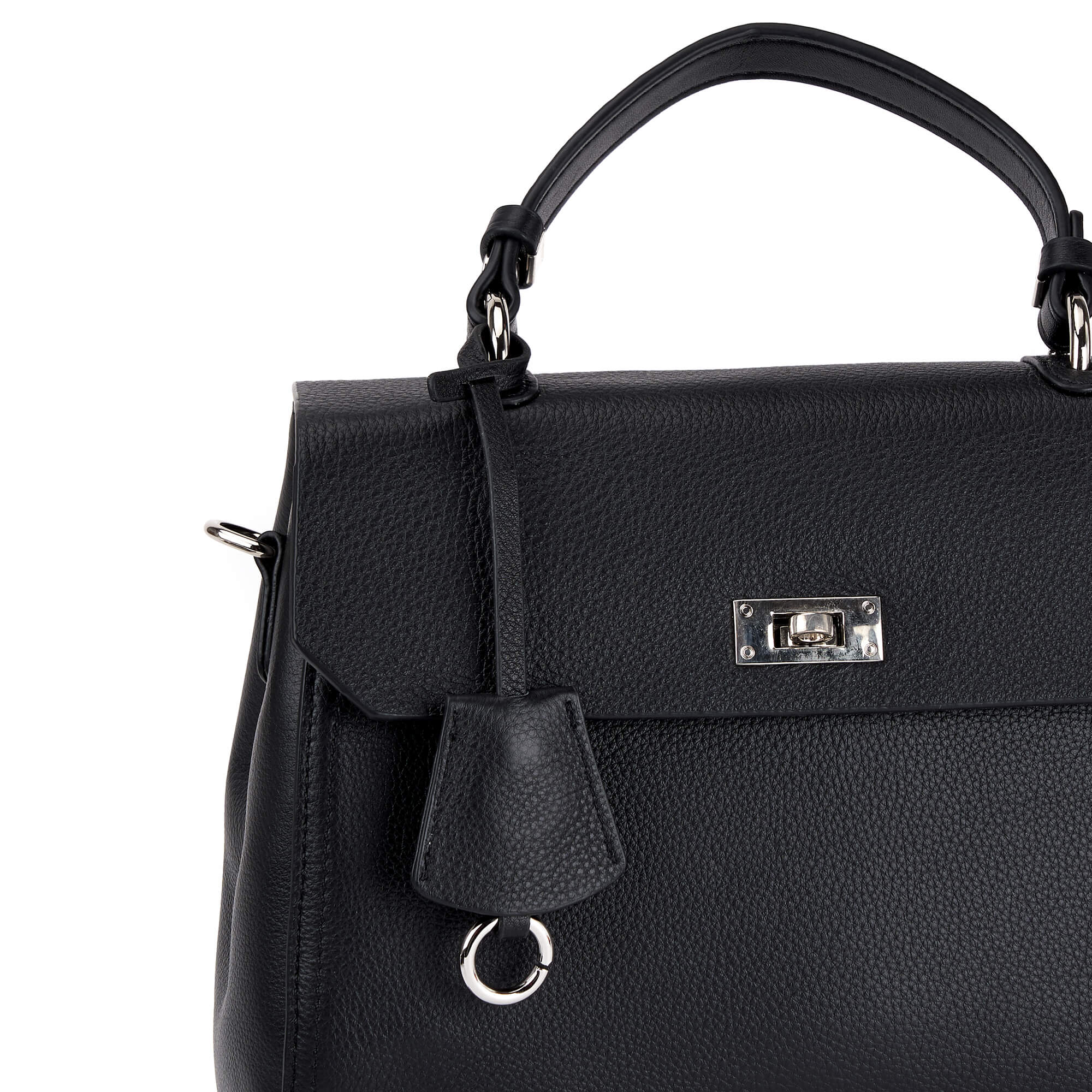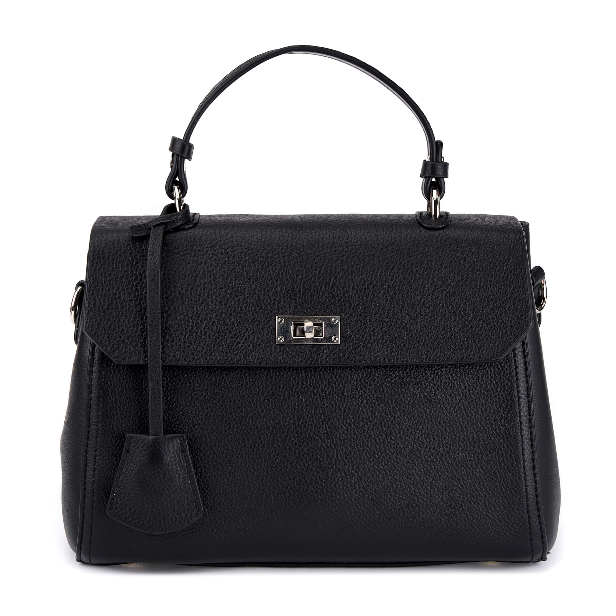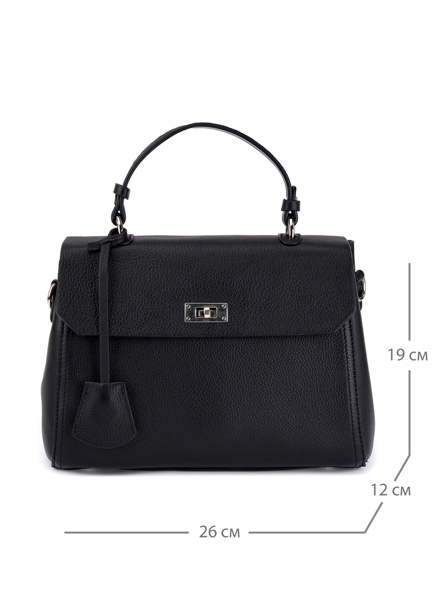 Женская сумка-тоут из натуральной кожи с зернистой фактурой, декорированная лаконичным брелоком из того же материала. Клапан закрывается на поворотный замок. Под клапаном находится молния, закрывающая два больших отсека на подкладе с фирменным паттерном. Отсеки разделены карманом-перегородкой на молнии, содержат один открытый карман и карман на молнии. В комплекте два съемных регулируемых плечевых ремня: широкий текстильный и узкий кожаный. Сумка поставляется в текстильной и полиэтиленовой упаковке.