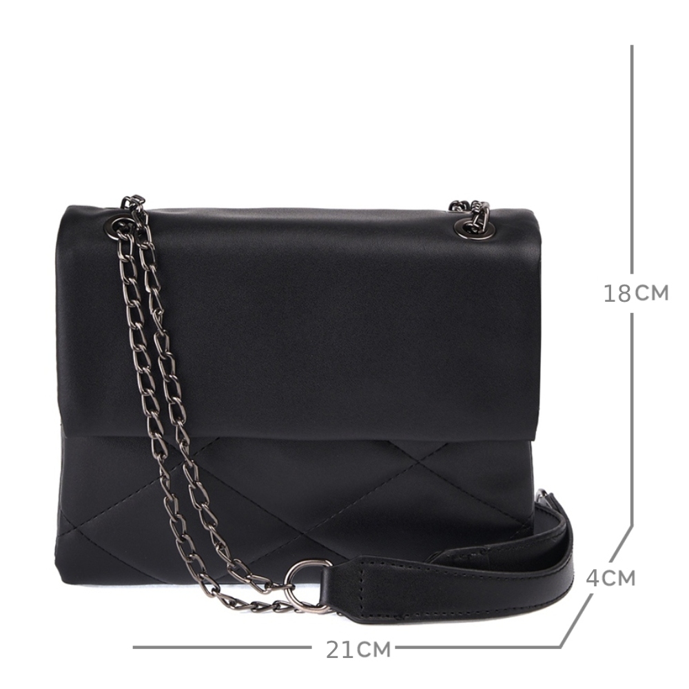 Функциональная женская сумка-сэтчел из гладкой экокожи с декоративной прострочкой. Габариты - 21х18х4 см. Под клапаном на магнитах расположены два отделения, каждое из которых закрывается на молнию. Длинный плечевой ремень-цепочка (120 см.) преобразуется в 2 высоких (32 см.) удобных ручки. Фурнитура выполнена в цвете темного никеля. Сумка поставляется в текстильной и полиэтиленовой упаковке.