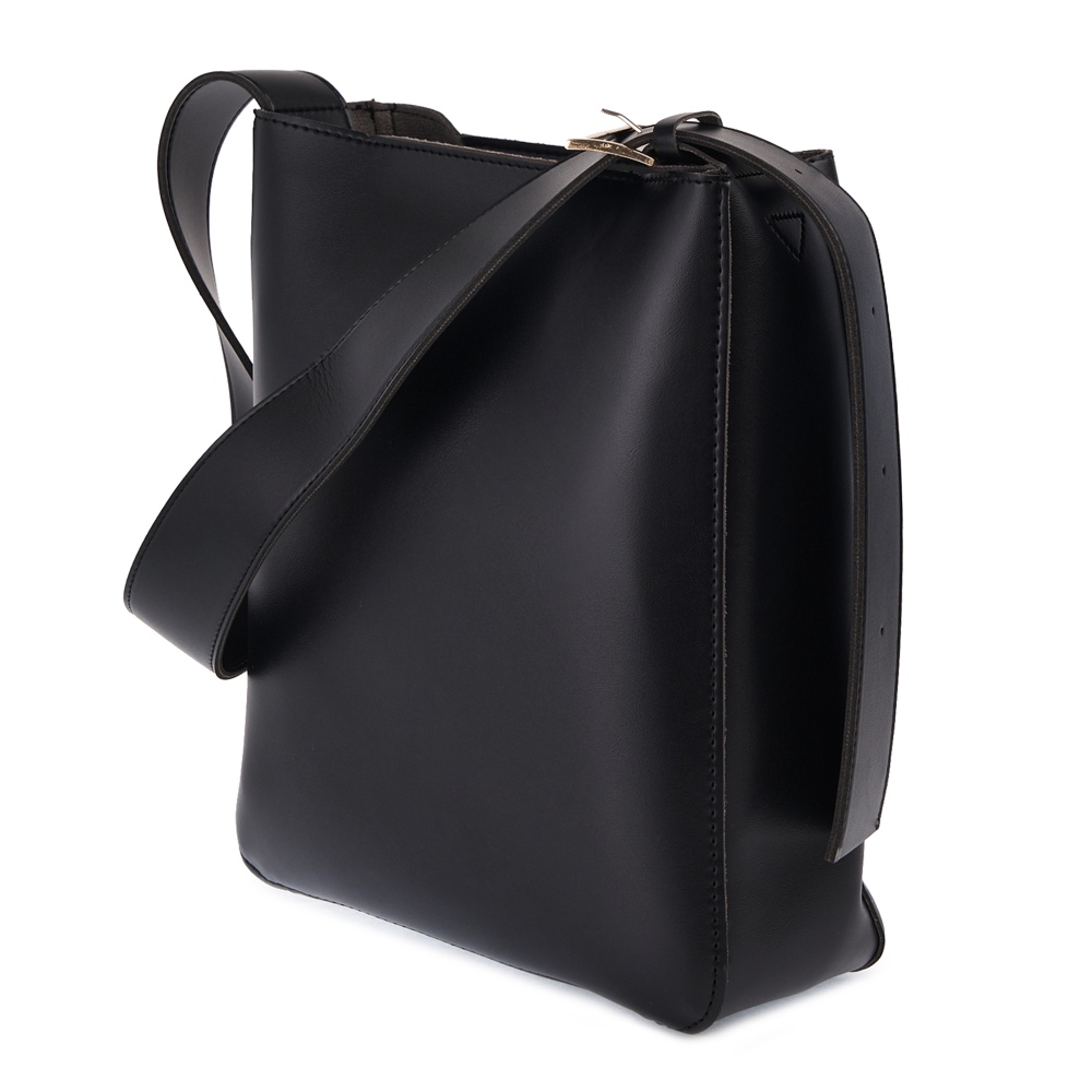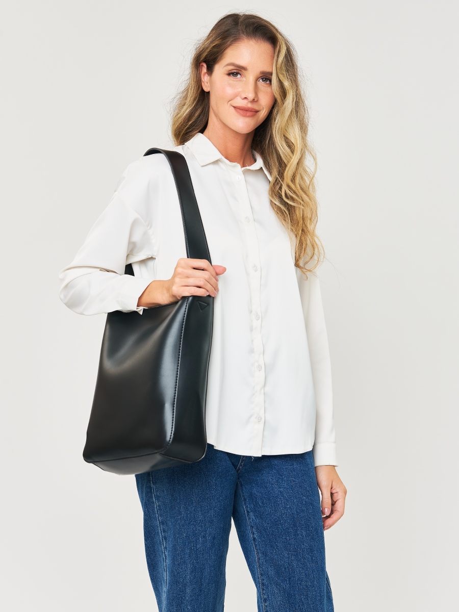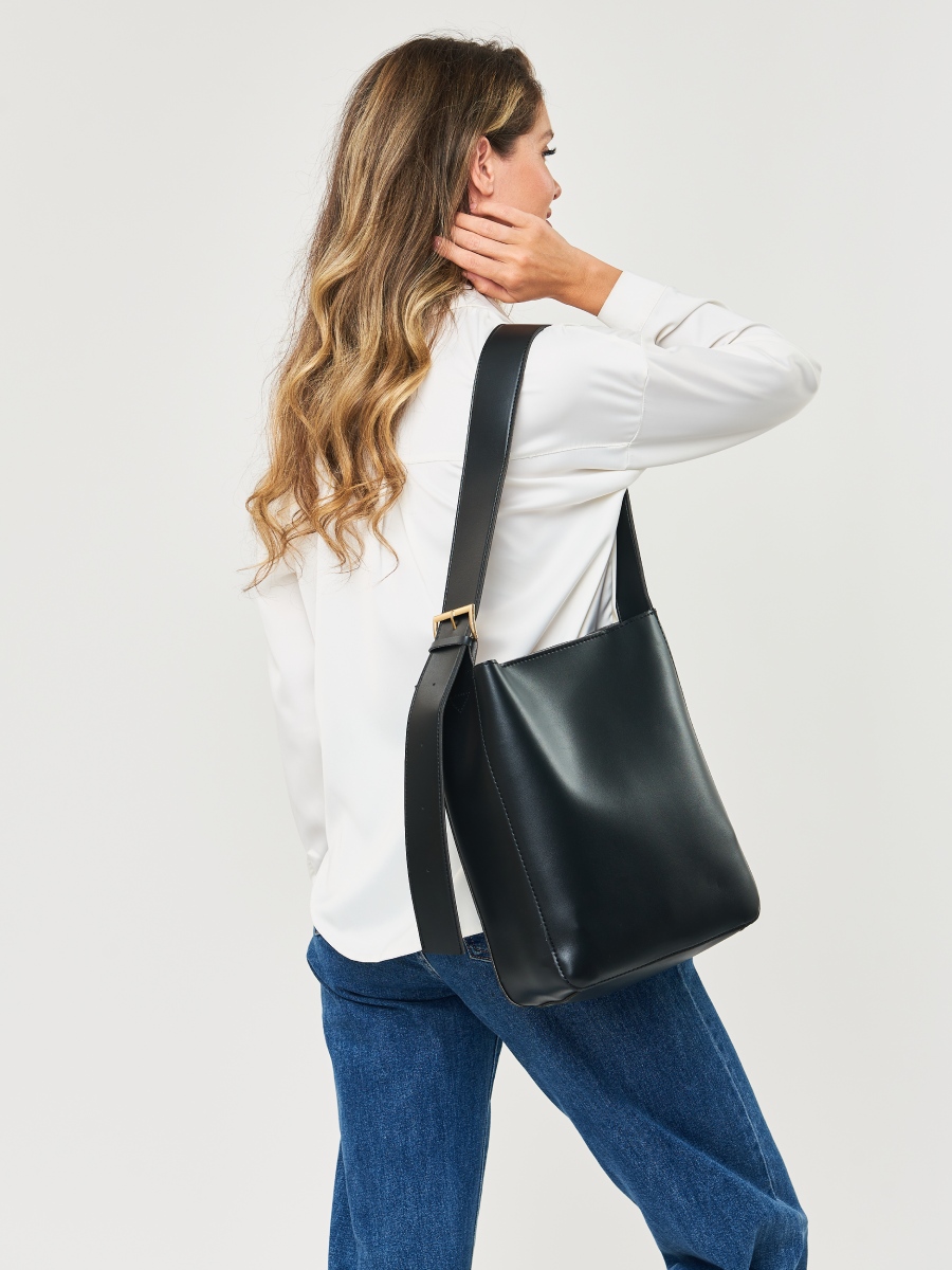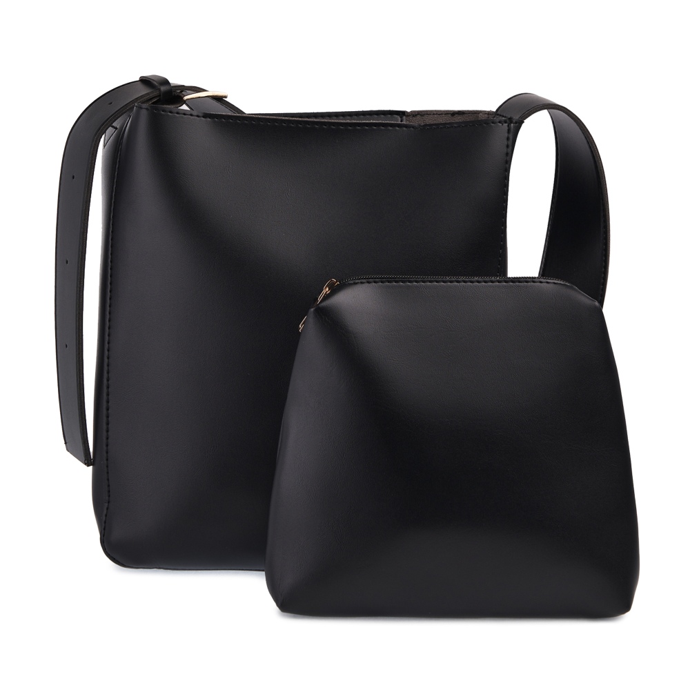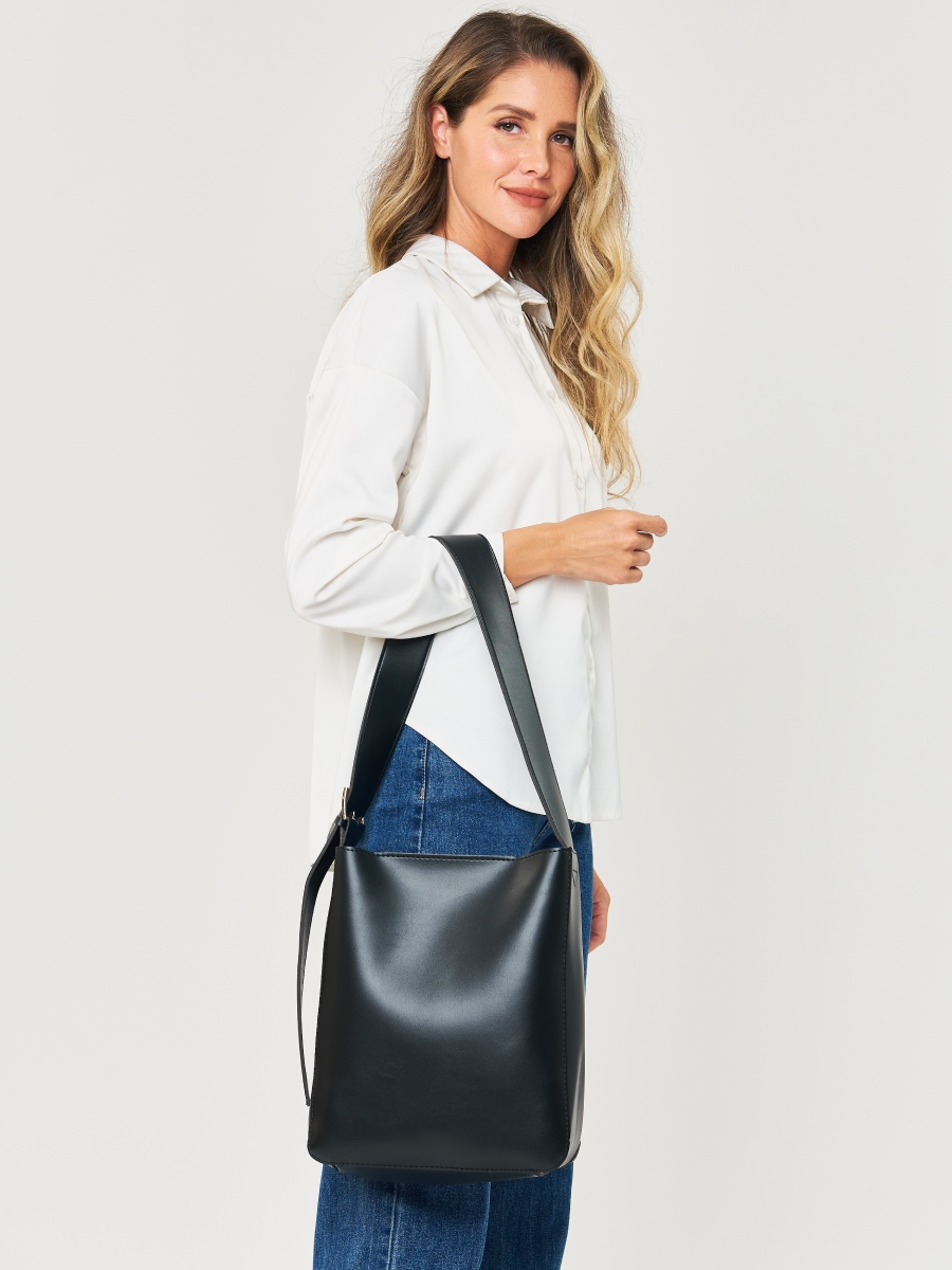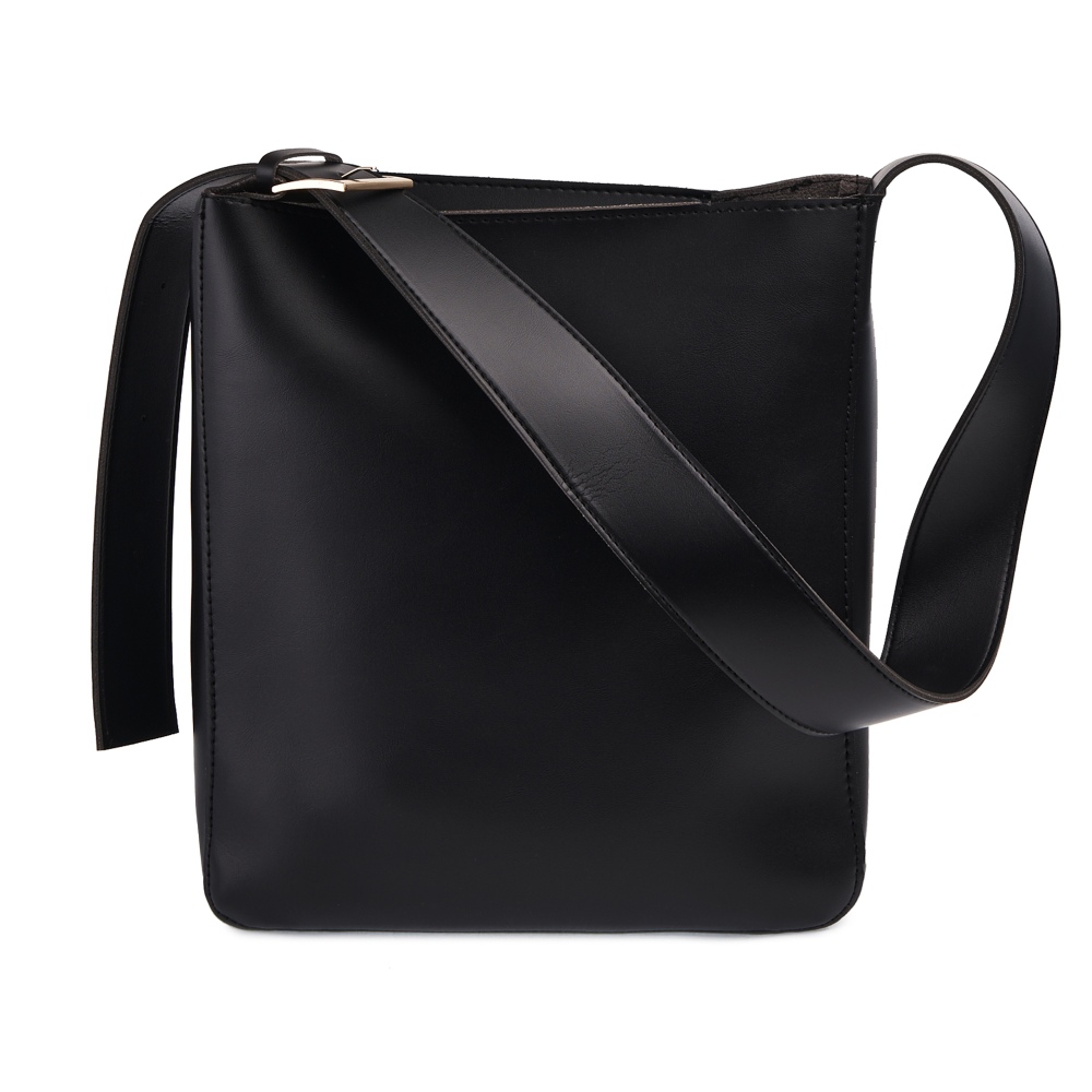 Большая женская сумка из гладкой экокожи на широком ремне. Габариты - 26х31х8 см. Основное отделение без подклада закрывается на молнию. В комплекте косметичка на молнии, выполненная из того же материала, размером 21х19х5 см. Ремень сумки регулируется по длине от 70 до 95 см. Фурнитура выполнена в золотистом цвете. Сумка поставляется в текстильной и полиэтиленовой упаковке.