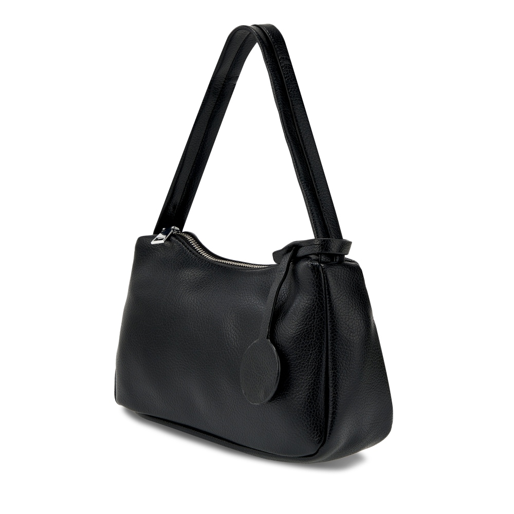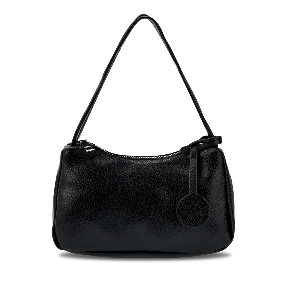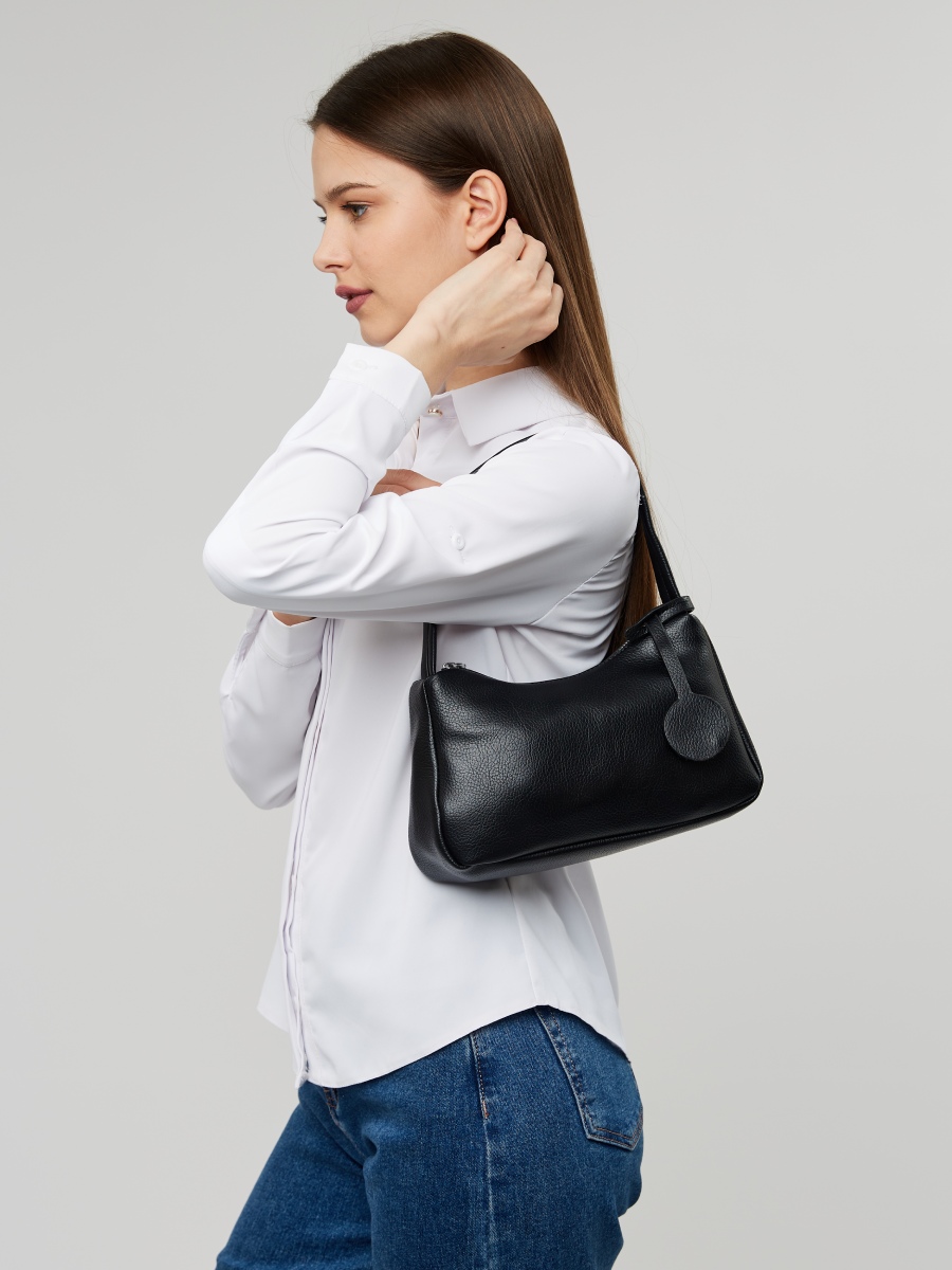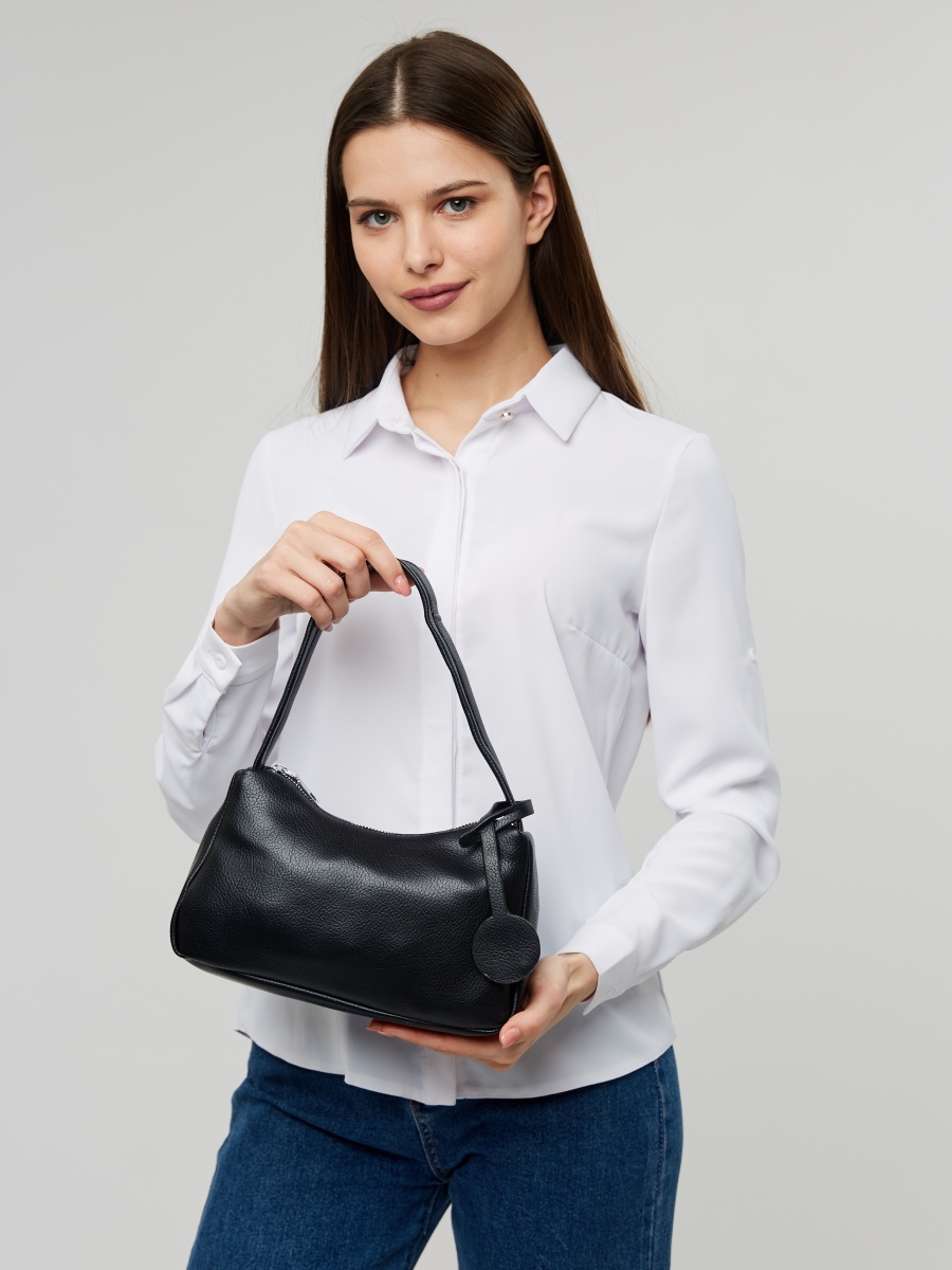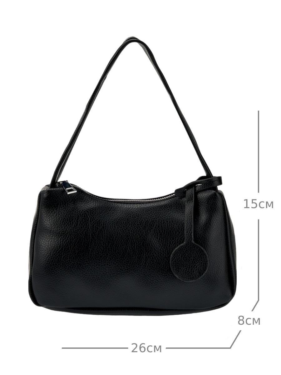 Классическая женская сумка-багет выполнена из мягкой и качественной экокожи с зернистой фактурой. Сумка маленькая, габариты модели (ВхШхГ) - 26х15х8 см. Сумка на плечо, высота ручки - 20 см. Сумка украшена съемным брелоком из искусственной кожи. Основное отделение на подкладе из плотного полиэстера закрывается на молнию. Внутри мягкой сумки выделен один карман на молнии. Уплотненное дно позволяет сумочке сохранять форму и устойчивость. Фурнитура выполнена в серебристом цвете.