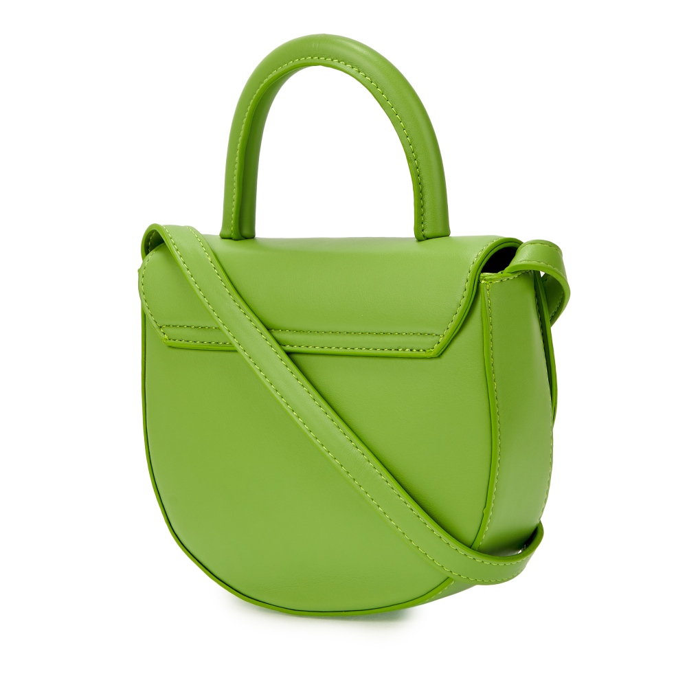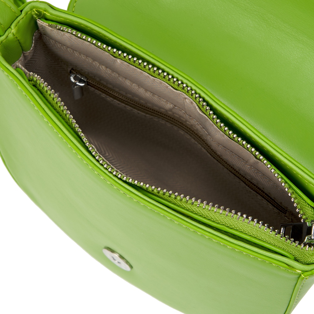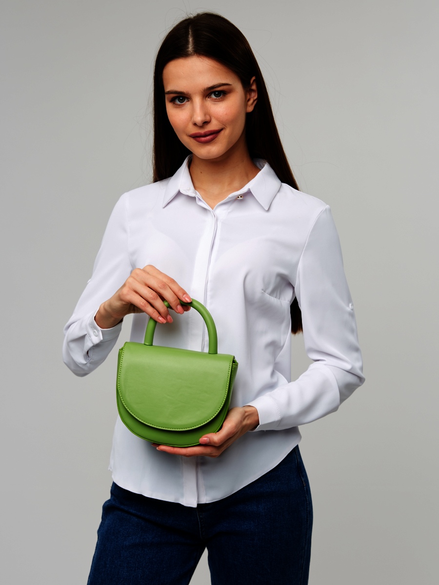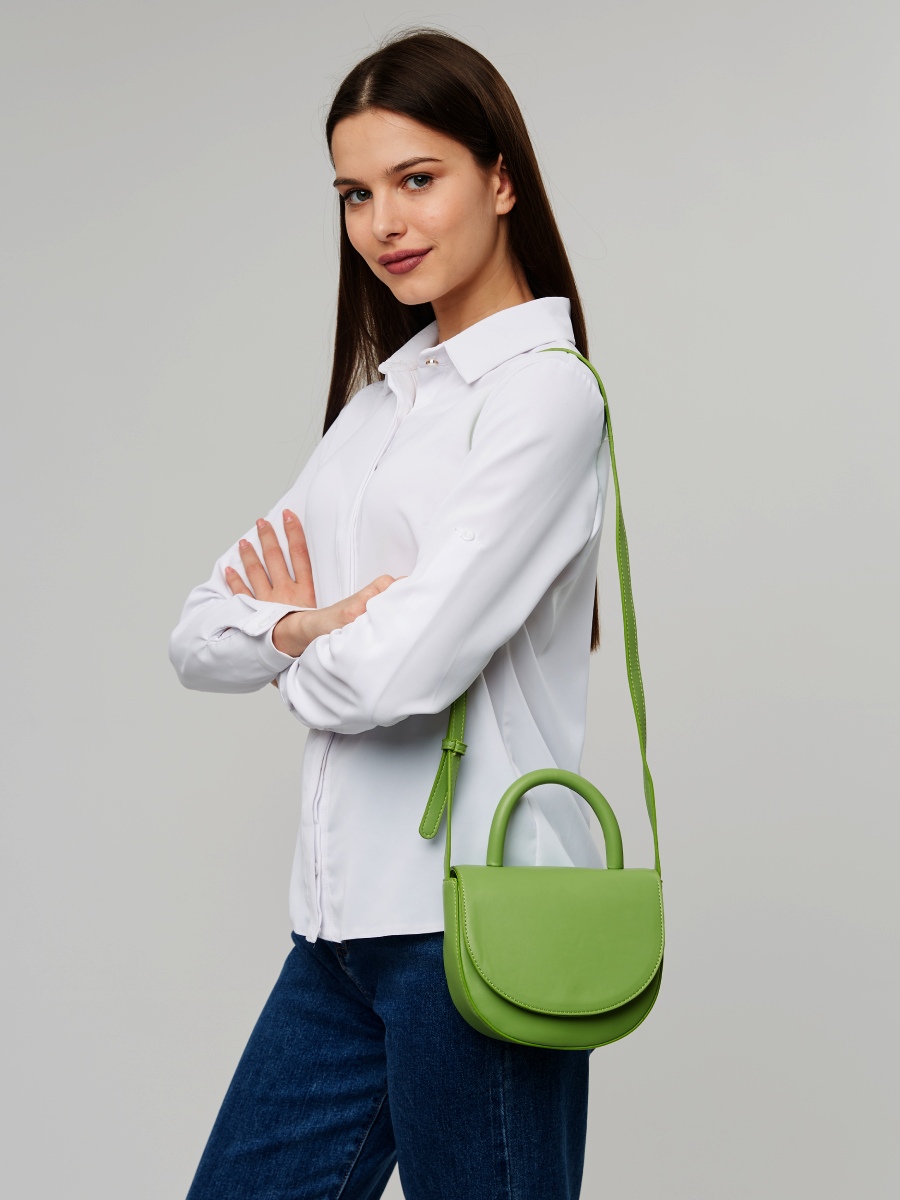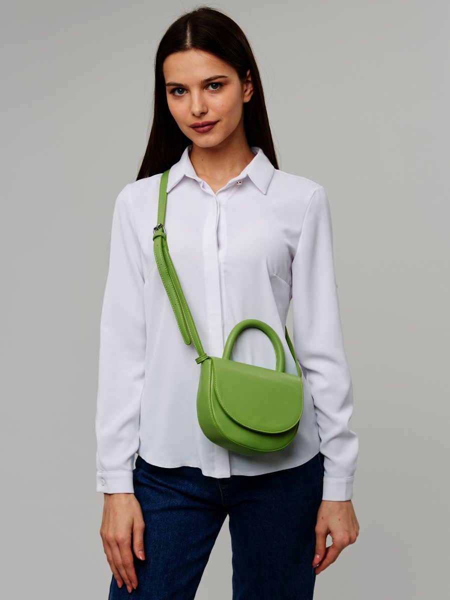 Женская сумка формы седло выполнена из искусственной кожи, которая имеет гладкую и приятную на ощупь фактуру. Габариты сумочки - (ШхВхГ) 18х17х5 см. Основное отделение кроссбоди на подкладе из плотного полиэстера закрывается на клапан с магнитной кнопкой и надежную молнию. Внутри маленькой сумки один карман на молнии. Плечевой ремень не съемный и регулируется по длине до 115 см., поэтому сумку можно носить в руке, на плечо и через плечо как кроссбоди. Фурнитура выполнена в серебристом цвете.
