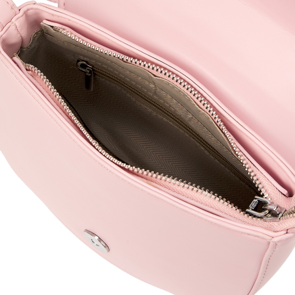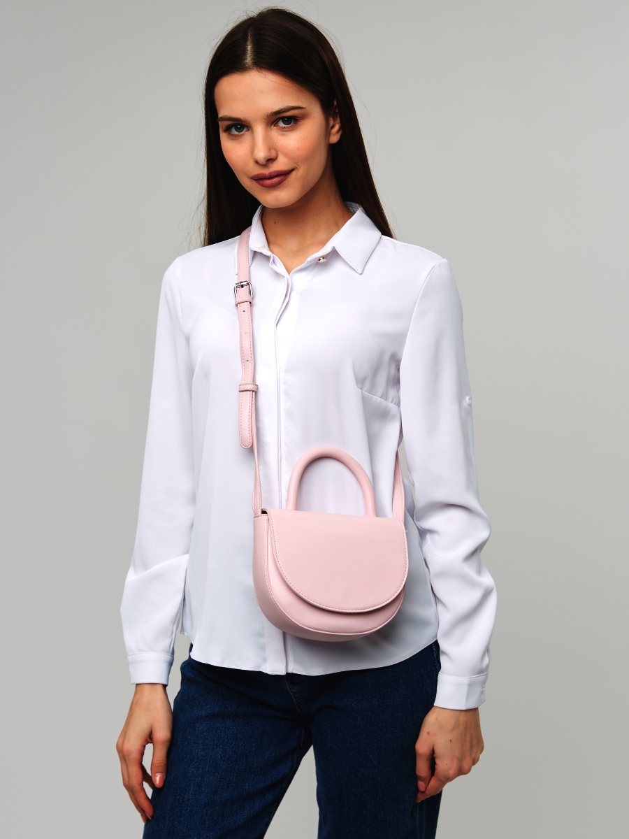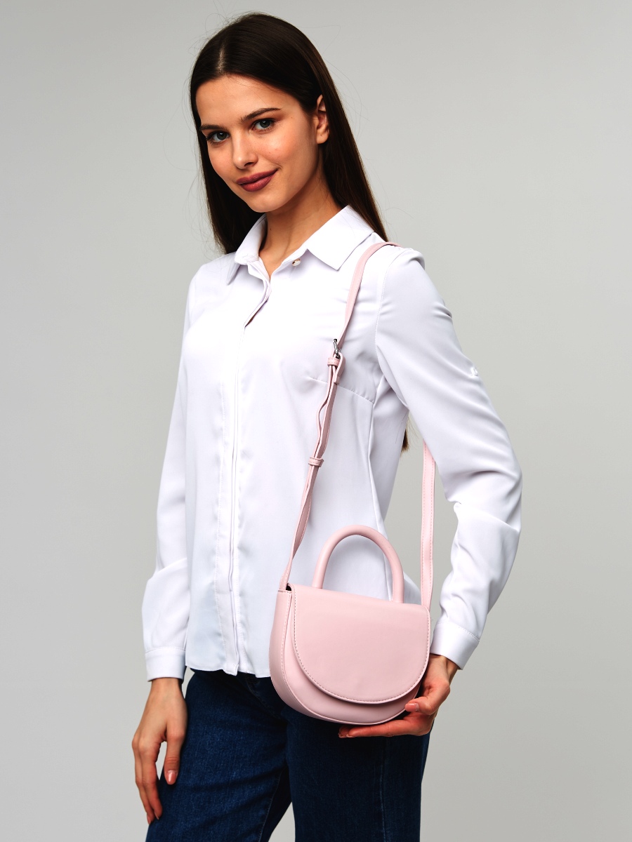 Женская сумка формы седло выполнена из искусственной кожи, которая имеет гладкую и приятную на ощупь фактуру. Габариты сумочки - (ШхВхГ) 18х17х5 см. Основное отделение кроссбоди на подкладе из плотного полиэстера закрывается на клапан с магнитной кнопкой и надежную молнию. Внутри маленькой сумки один карман на молнии. Плечевой ремень не съемный и регулируется по длине до 115 см., поэтому сумку можно носить в руке, на плечо и через плечо как кроссбоди. Фурнитура выполнена в серебристом цвете.