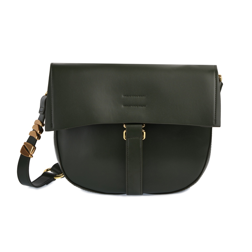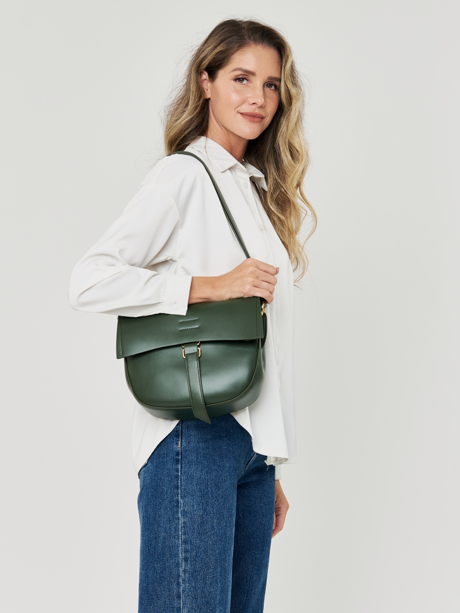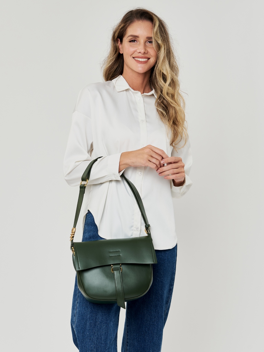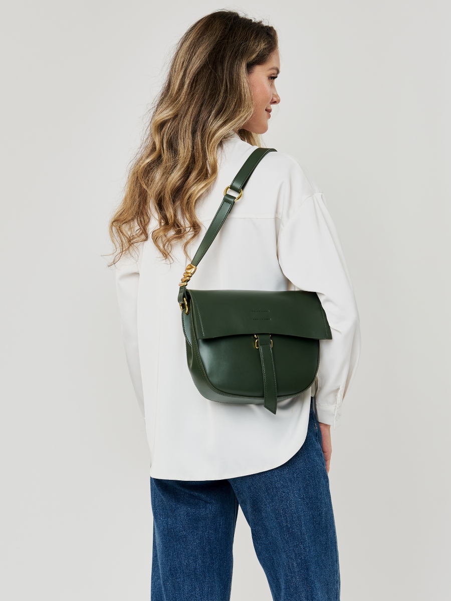 Женская сумка-седло из гладкой натуральной кожи. Габариты - 24х21х8 см. Молния и клапан на магнитной кнопке закрывают два вместительных отделения на подкладе из плотного полиэстера, открытый карман и карман на молнии. Длинный плечевой ремень фиксируется на металлических кольцах и регулируется по длине от 70 до 115 см. Оригинальные декоративные элементы и фурнитура выполнены в цвете желтого золота. Сумка поставляется в текстильной и полиэтиленовой упаковке.