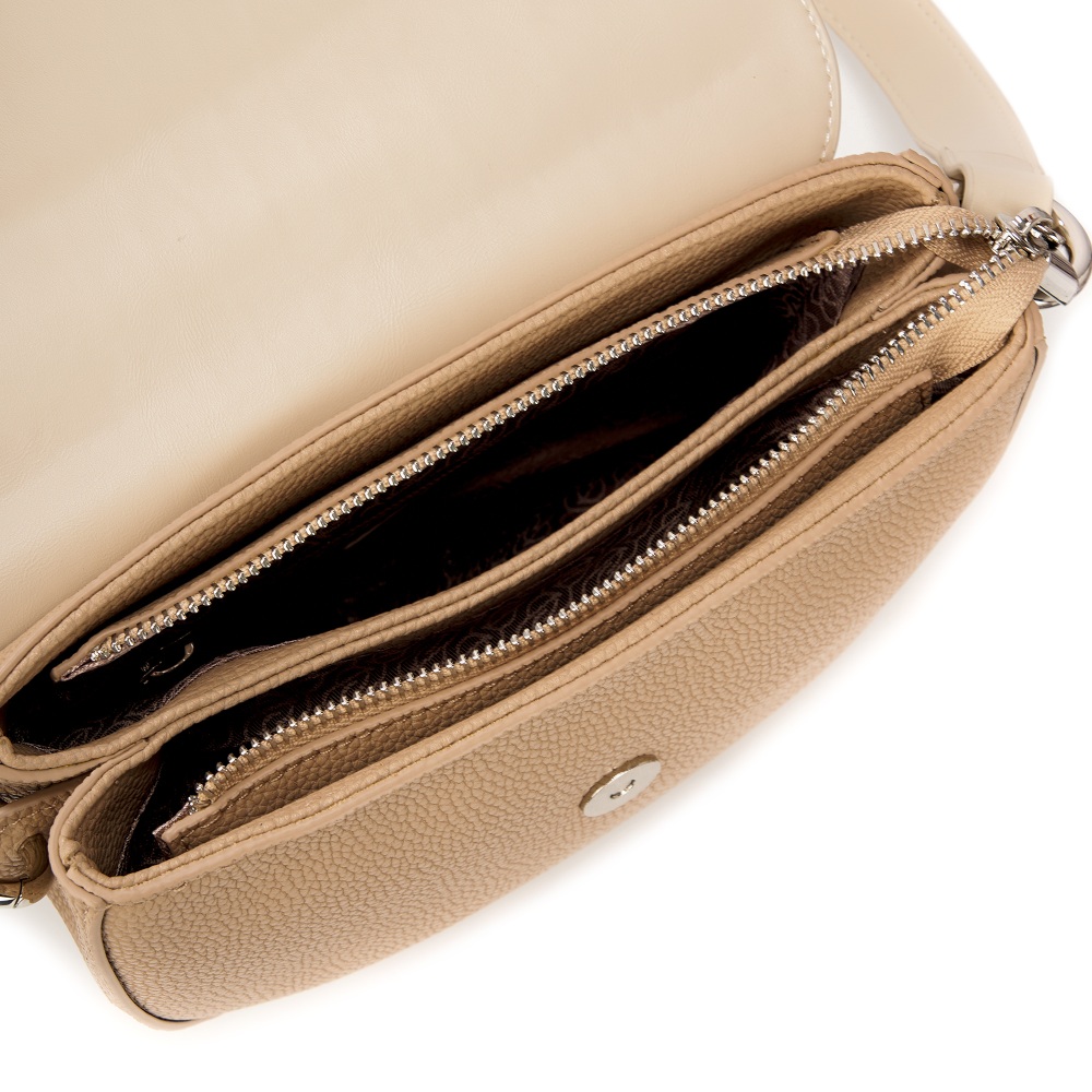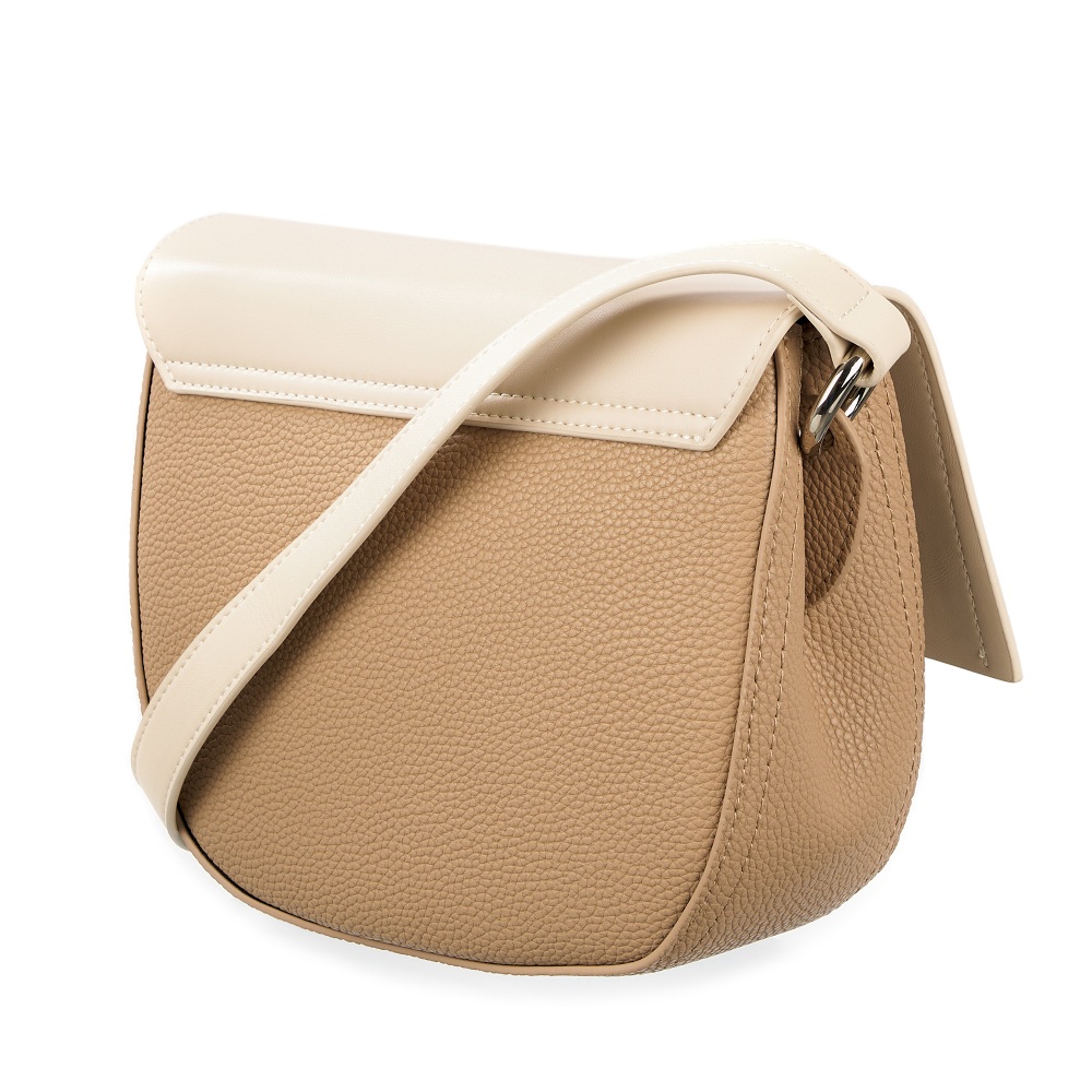 Женская сумка-седло, выполненная из комбинации гладкой и зернистой натуральной кожи. Габариты - 22х19х8 см. Два вместительных отделения на подкладе из плотного полиэстера закрываются на молнию и клапан на магнитной кнопке. Внутри есть открытый карман и карман на молнии. Высокая съемная ручка сумки фиксируется на металлических кольцах. Плечевой ремень регулируется по длине до 112 см. Уплотненное дно позволяет сумочке сохранять форму и устойчивость. Фурнитура выполнена в серебристом цвете.