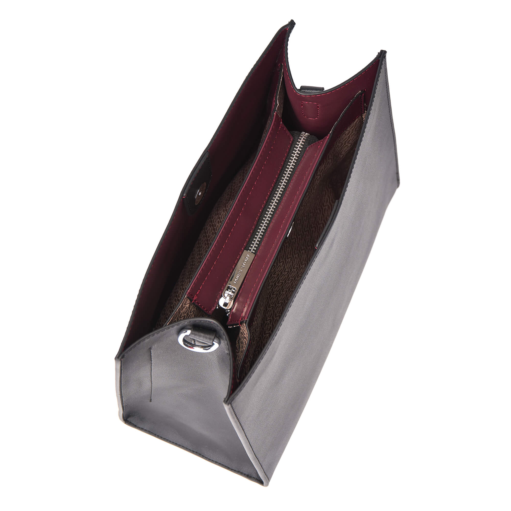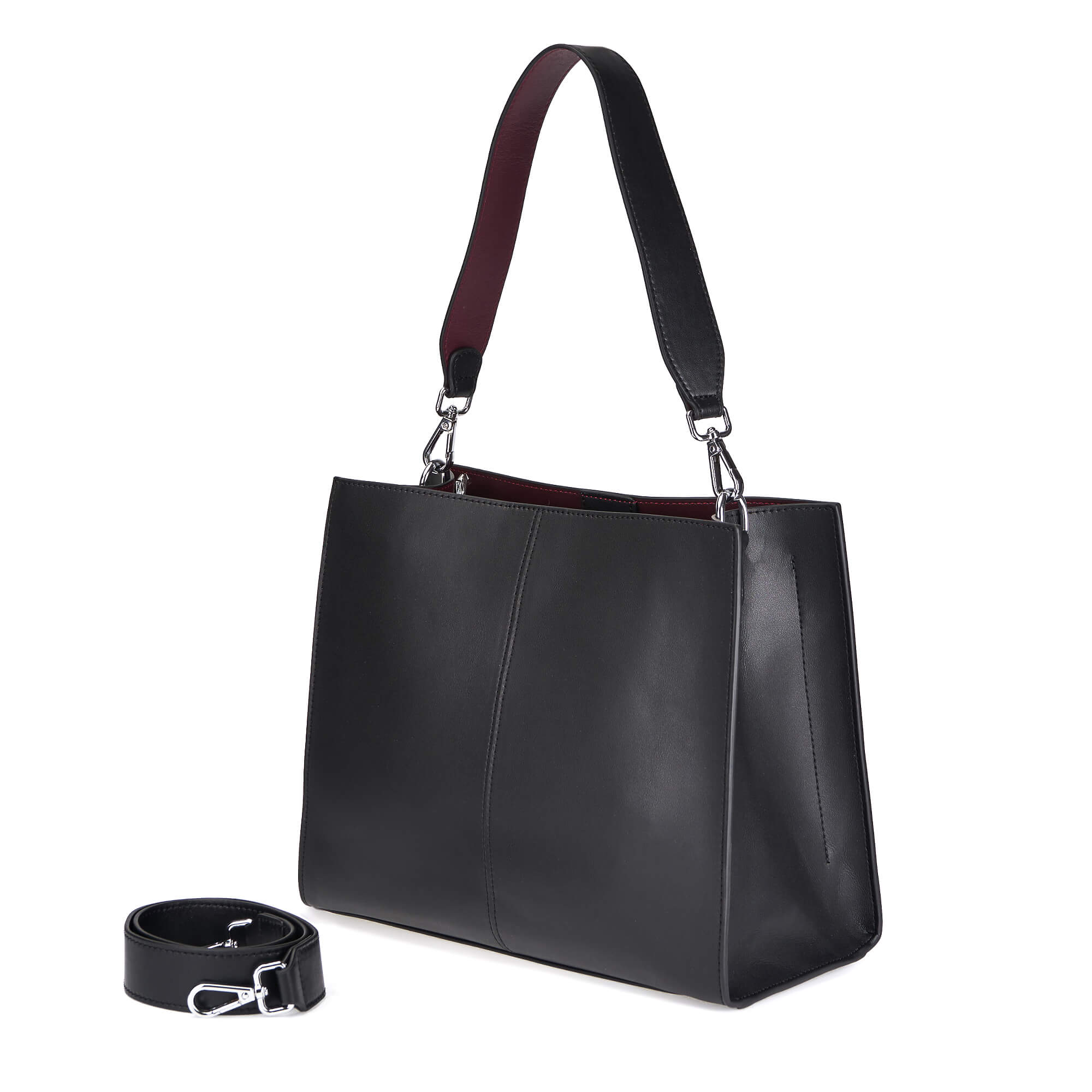 Вместительная сумка из натуральной гладкой кожи с контрастными цветовыми элементами. У сумки три вместительных отделения: центральное на молнии и два боковых - на кнопках. В центральном отделении выделен открытый карман и карман на молнии. В комплекте два съемных широких плечевых ременя разных цветов.