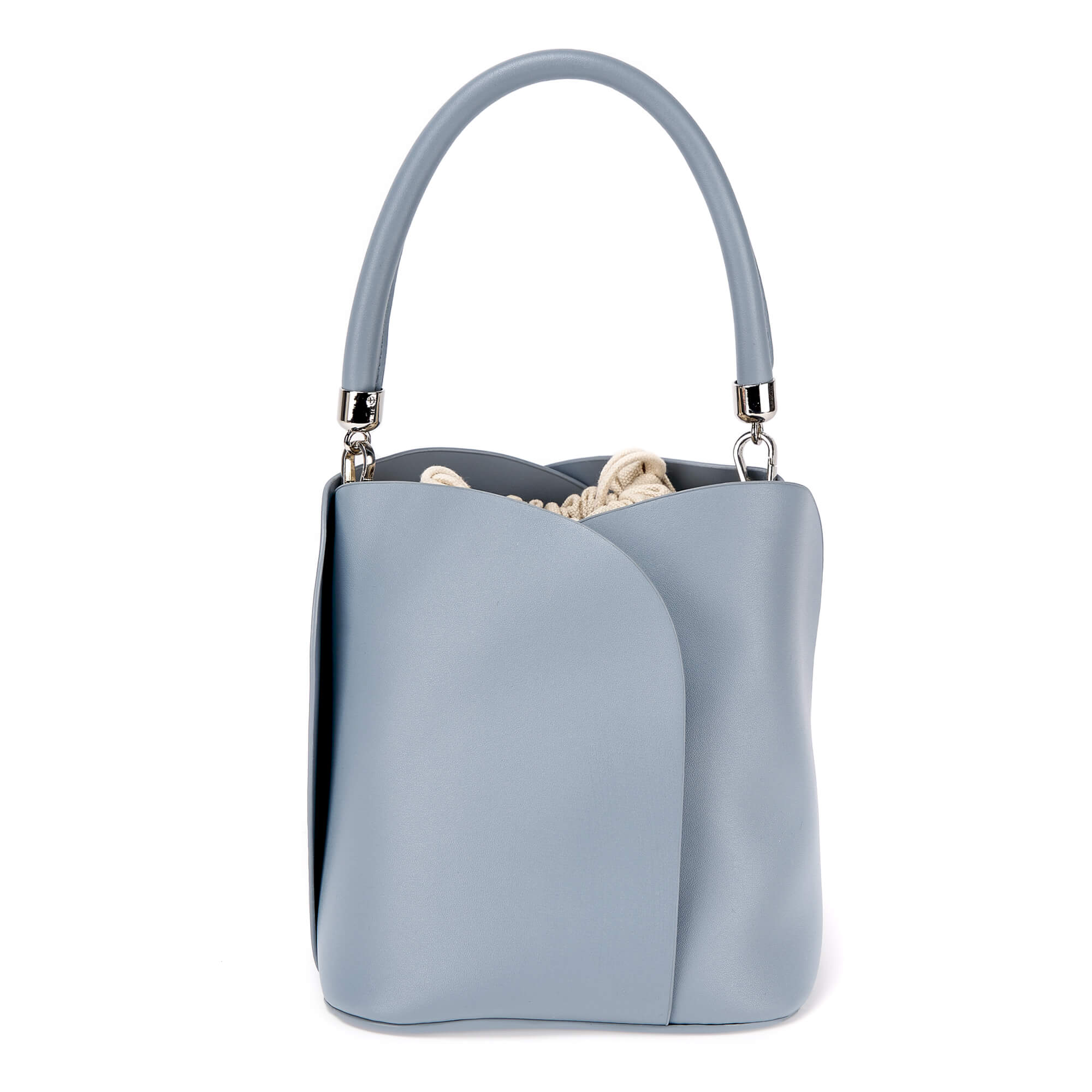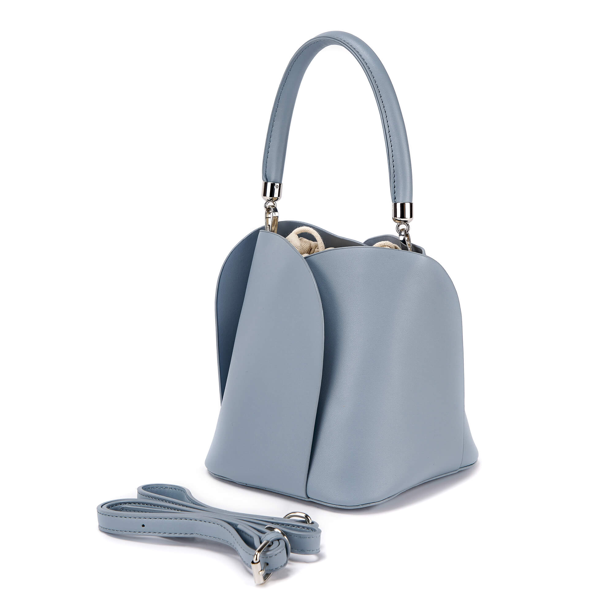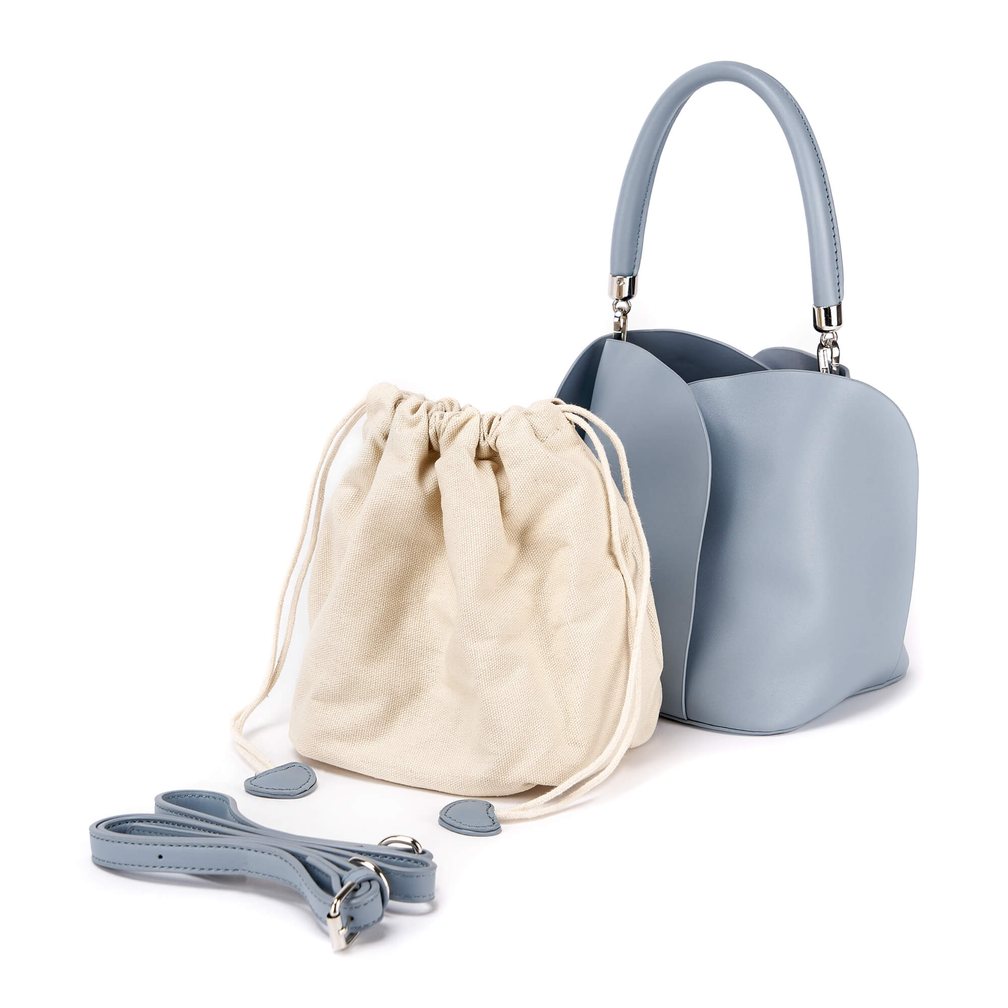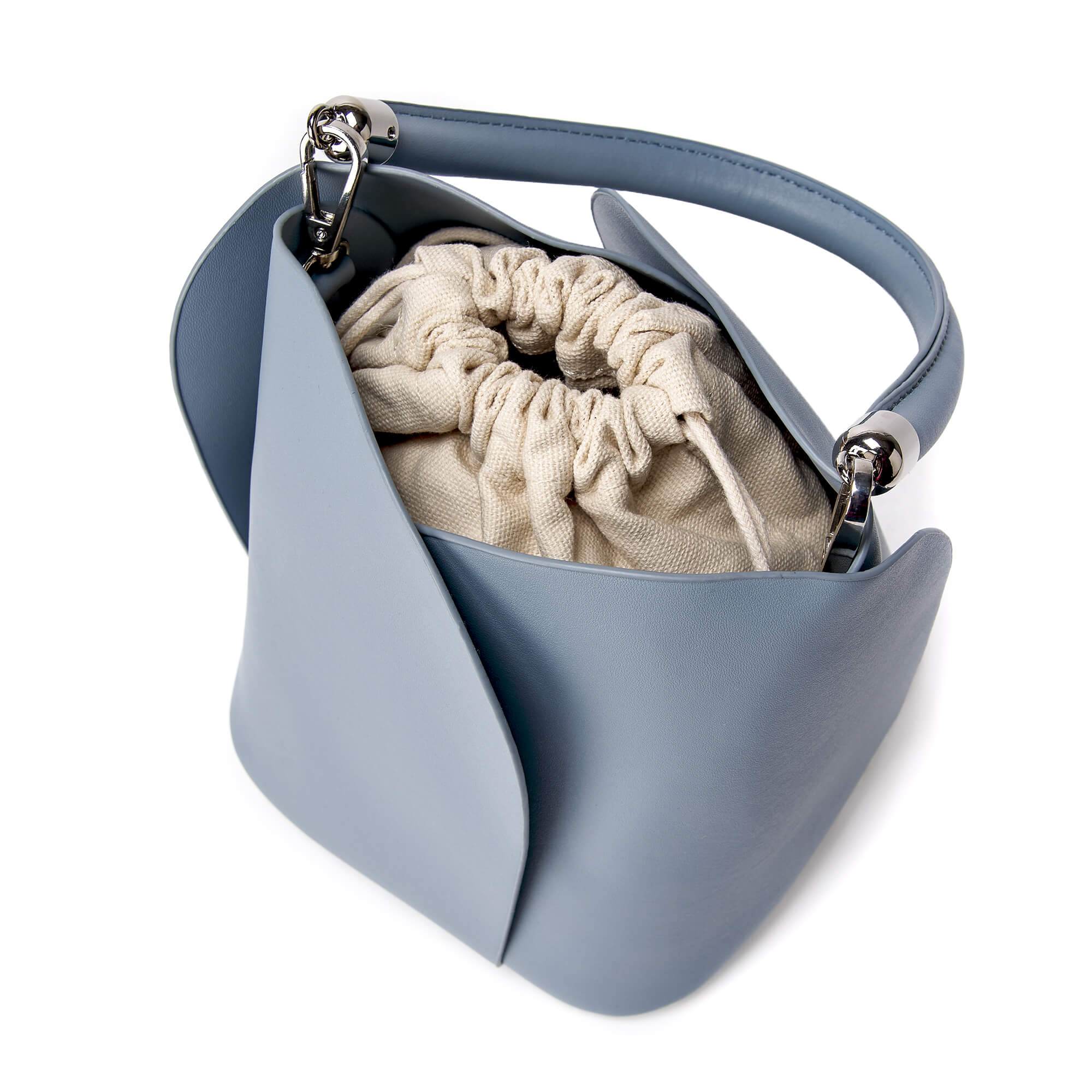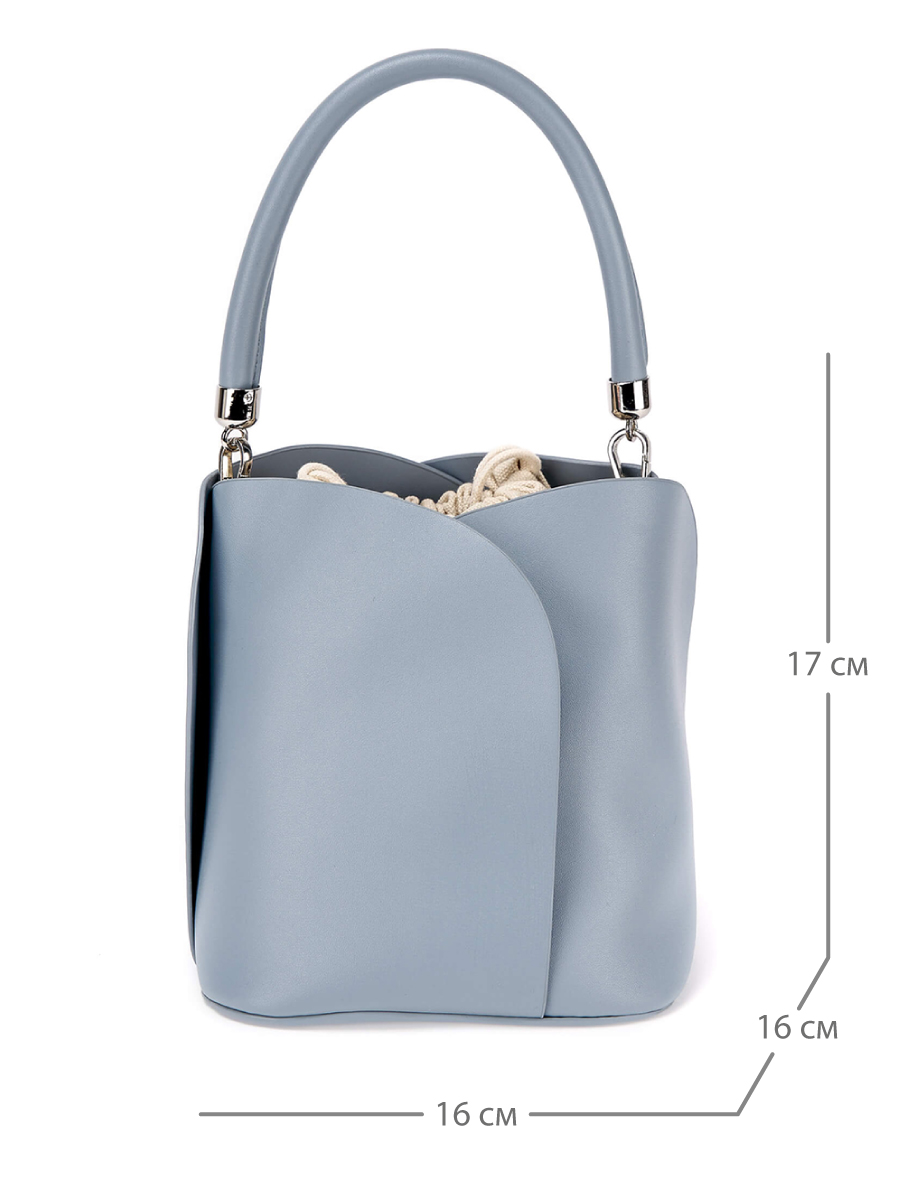 Миниатюрная сумка-ведро из искусственной гладкой кожи . Внутри затягивающийся хлопковый мешок, который можно вытащить . К сумке прилагается длинный плечевой ремень.