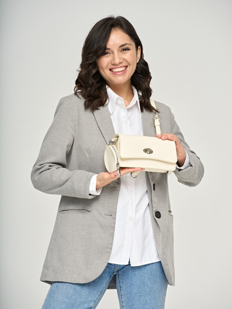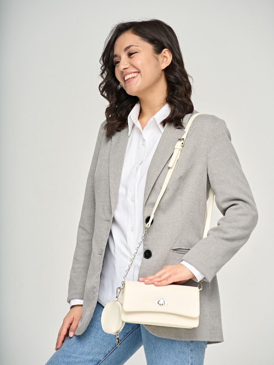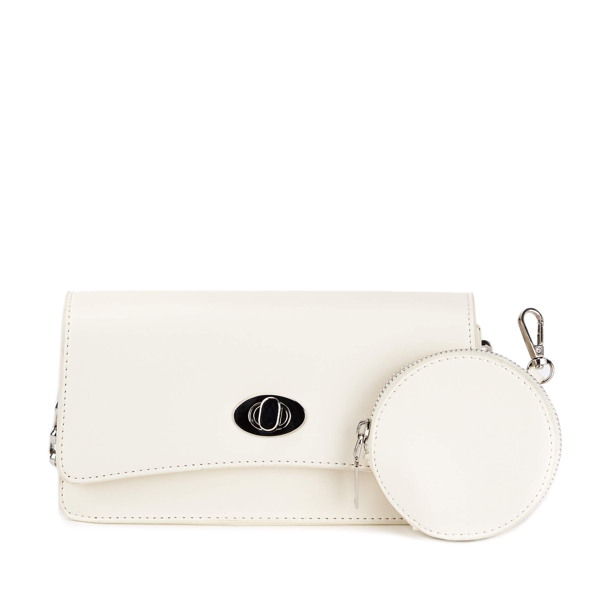 Женская формованная сумка-клатч из искусственной кожи. Клапан сумки закрывается на поворотный замок. Под клапаном одно отделение на молнии. Несъемный плечевой ремень декорирован цепочкой серебристого цвета и регулируется по длине до 120 см. В комплекте есть маленький кошелек на молнии, который можно закрепить на ремень или носить отдельно. Сумка поставляется в текстильной и полиэтиленовой упаковке.
