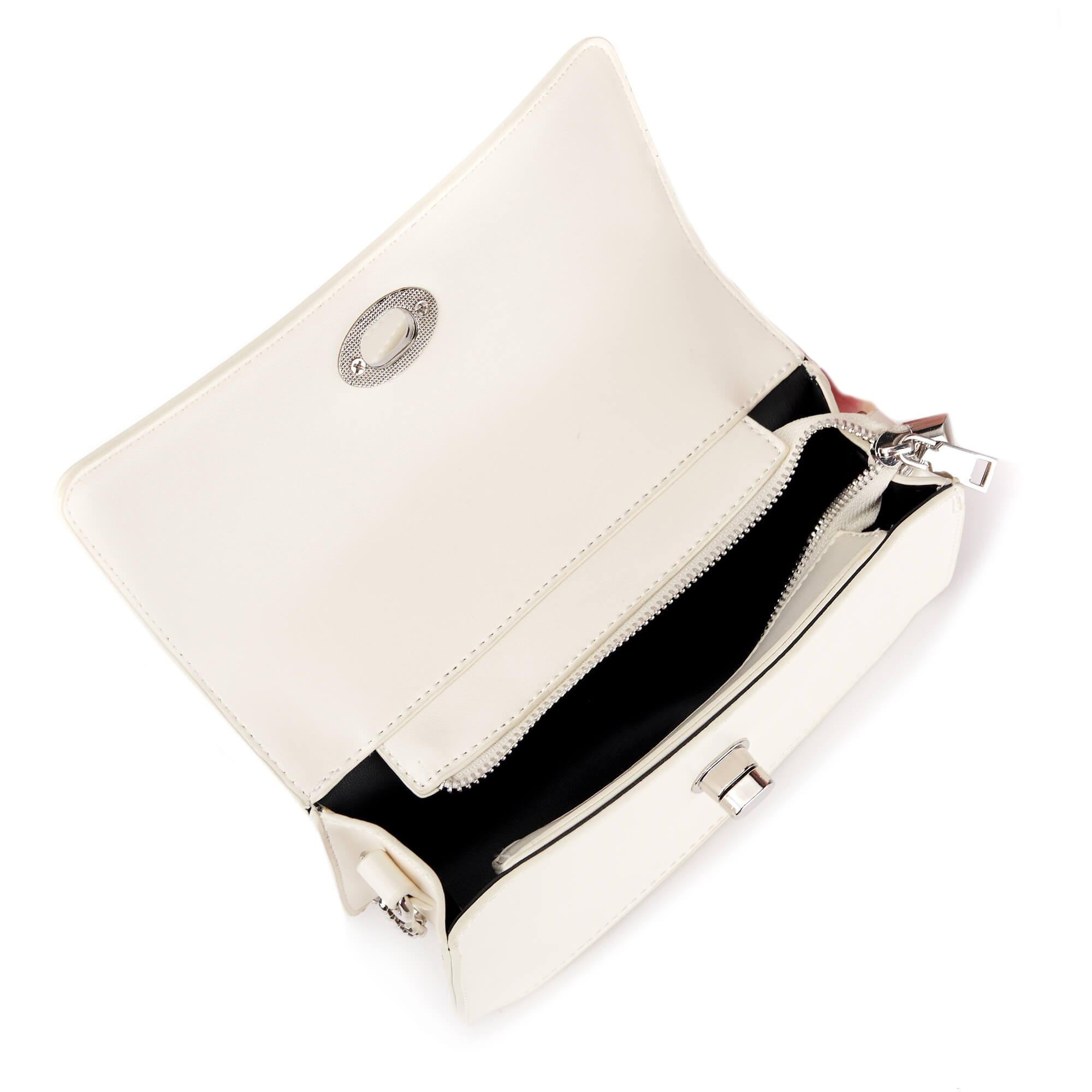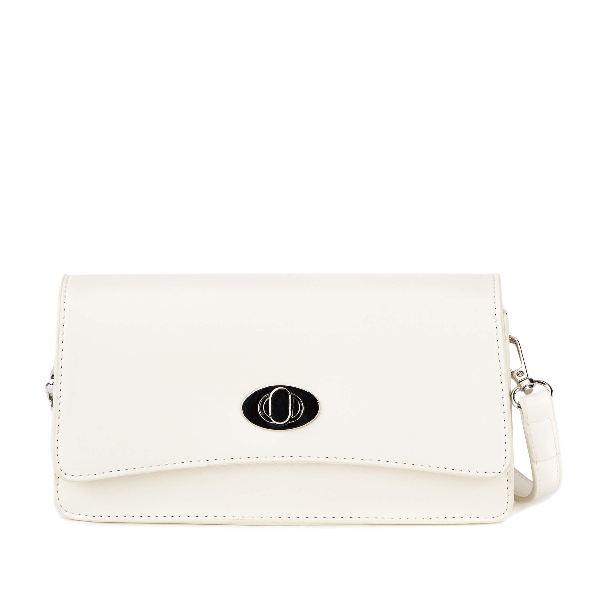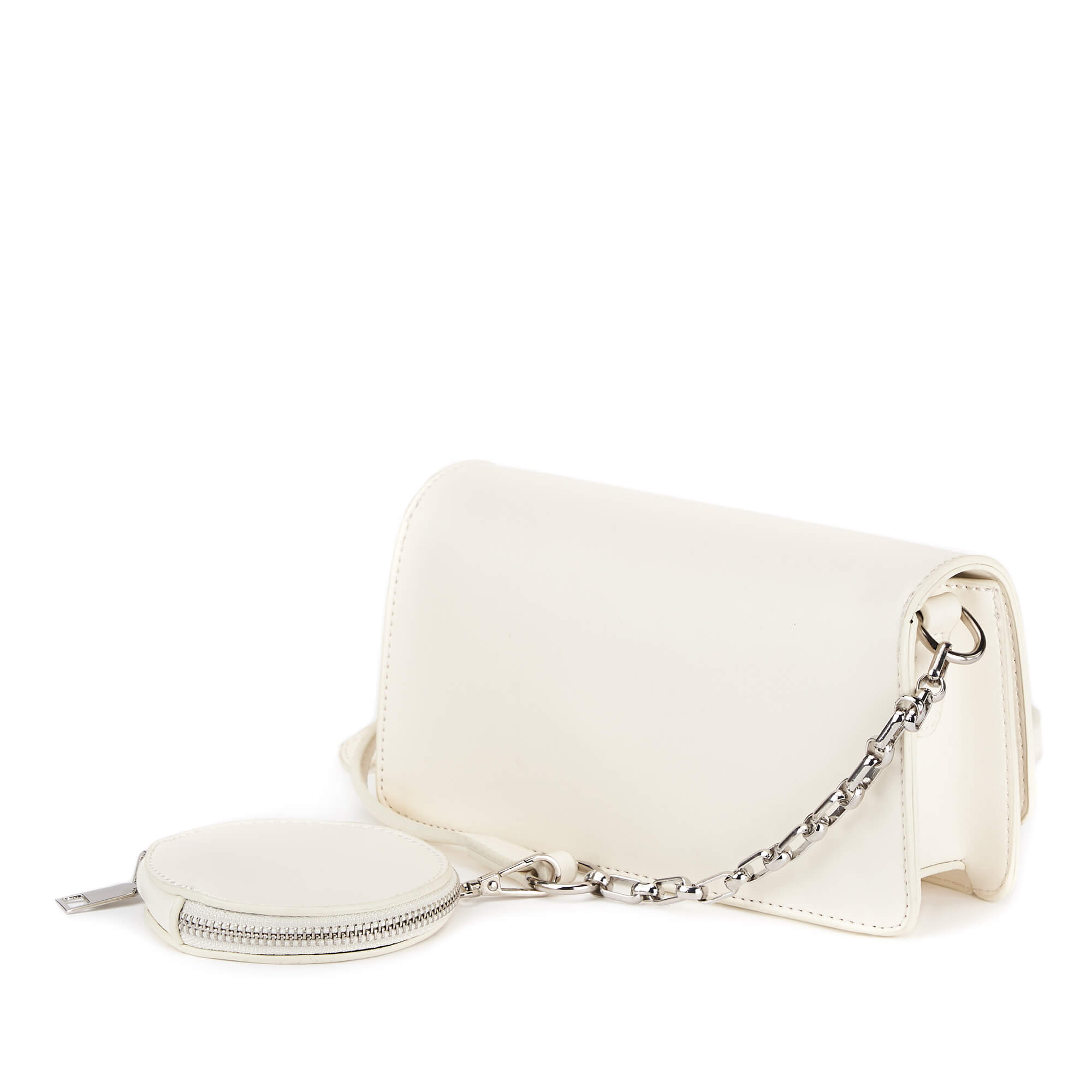 Женская формованная сумка-клатч из искусственной кожи. Клапан сумки закрывается на поворотный замок. Под клапаном одно отделение на молнии. Несъемный плечевой ремень декорирован цепочкой серебристого цвета и регулируется по длине до 120 см. В комплекте есть маленький кошелек на молнии, который можно закрепить на ремень или носить отдельно. Сумка поставляется в текстильной и полиэтиленовой упаковке.