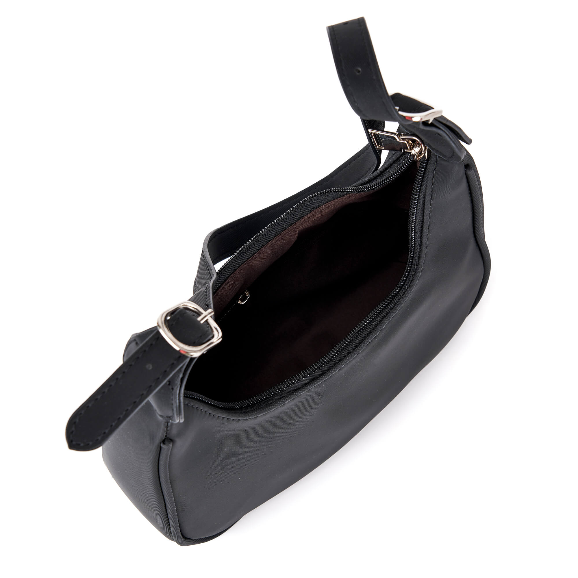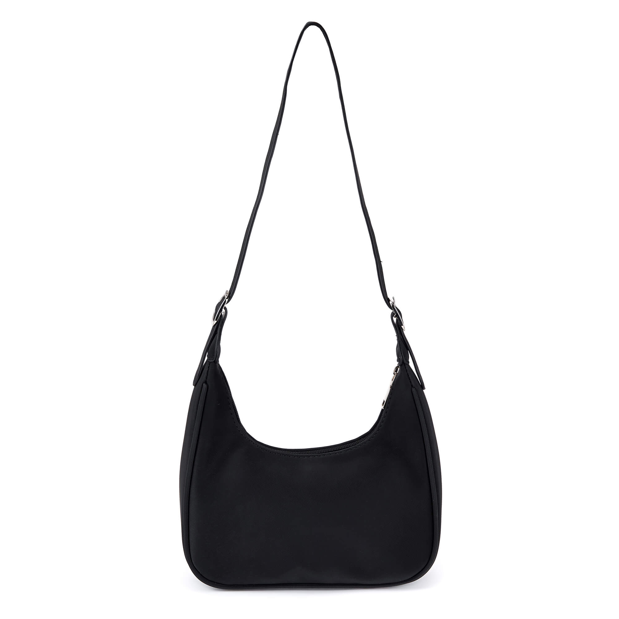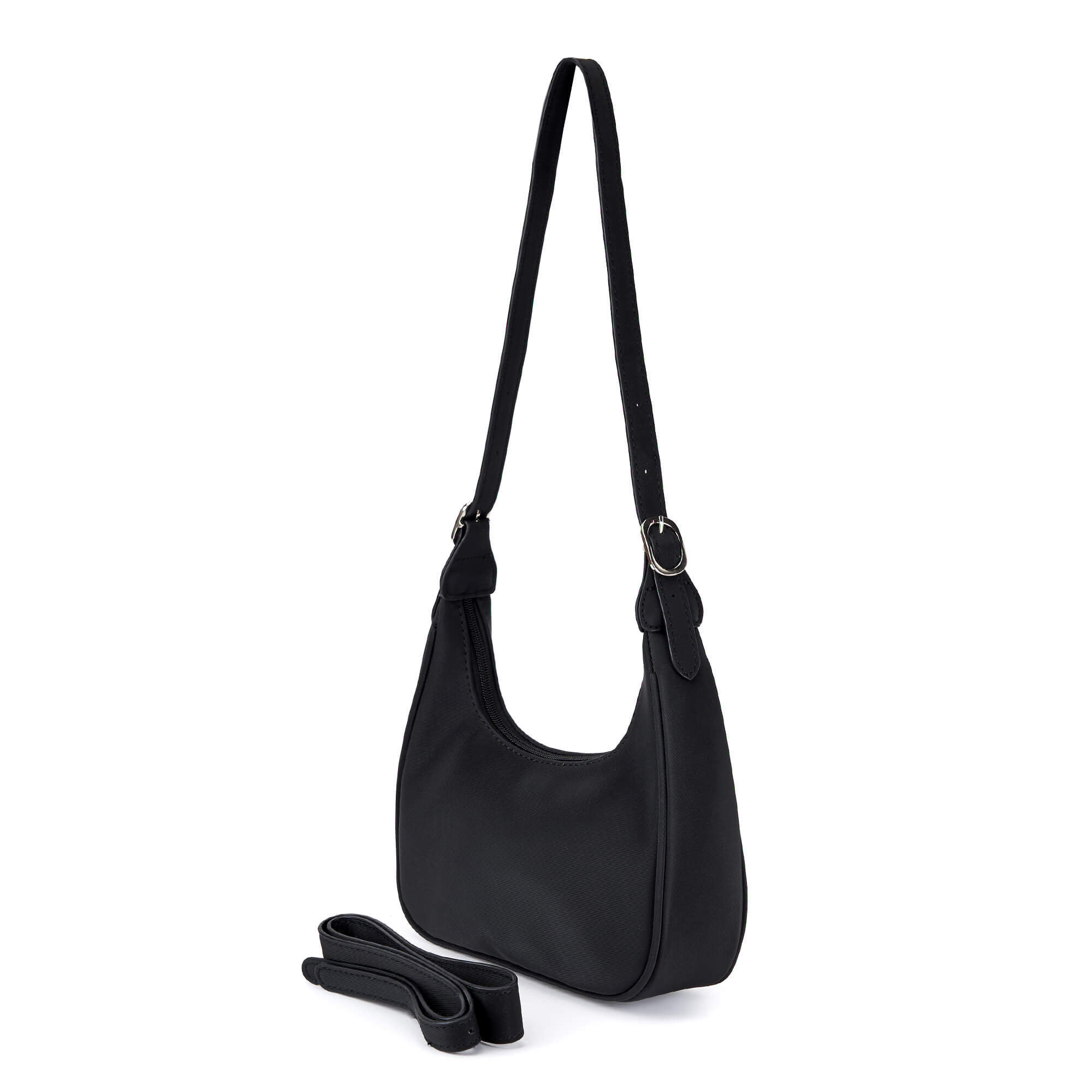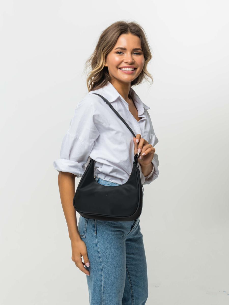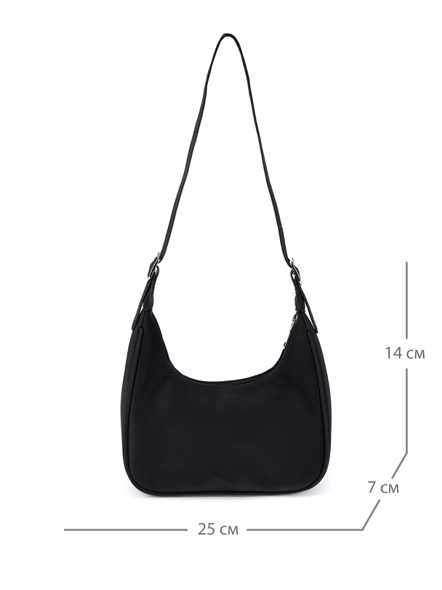 Женская сумка из нейлона с серебристой фурнитурой. Основное отделение на текстильном подкладе и один внутренний карман закрываются на молнию. В комплекте два съемных плечевых ремня: узкий и широкий, регулируемый до 85 см. Сумка поставляется в текстильной и полиэтиленовой упаковке.